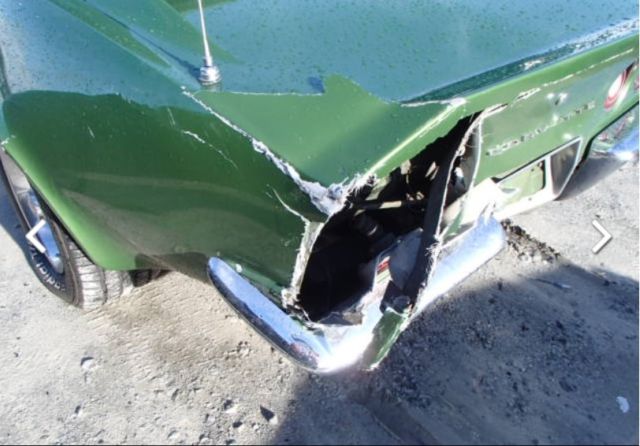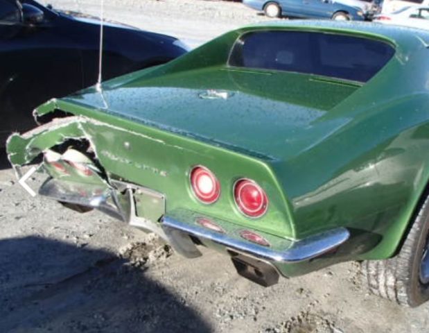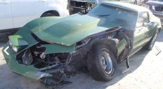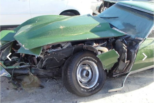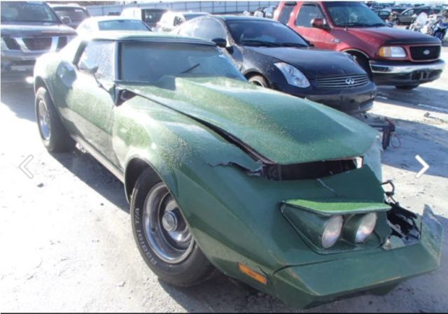 one wrecked  rare special ordered 1973 Corvette with T-tops was Special ordered factory Big Block 454 / 4-speed car w/ air & power options. Car is sold as-is as parts only or for an additional $1000 I will include a clear title which would take 3 or more weeks to get back. That would make the total $6,985 & no longer $5,985. Note that the front fiberglass clip is loose and is just laying on the front partly attached and the hood is also loose and is laying on the front end. I live in Greensboro, NC 27406 and I am about to ship the car from where it is stored in LOGANVILLE, GA 30052. As of this moment the buyer has the option to pick car up for either location. The car as of today is in LOGANVILLE, GA 30052. Car is wrecked & needs front fiberglass clip, driver side upper & lower control/A arms, 1 rally wheel & tire, fiberglass repair to driver side rear & also needs 1 driver side headlight assembly. Suggested repairs may or may not be limited to those stated repairs, additional repairs may or may not be needed. I believe I had read that there were just a couple hundred factory 454 4-speed cars manufactured, that most were automatics. If I am wrong please do not use the "contact seller" option as a forum as I only wish to hear from interested potential buyers. If you are not wishing to buy this car, then do not contact me. Payment would be due at the time of purchase, with no less than $2,000 nonrefundable deposit at time of commitment to purchase. Deposit can be via PayPal but would be returned via PayPal after you make full payment in person with cash or bank wire payment, call me for payment instructions. I have great local references here. You may call my home 336-685-3124.