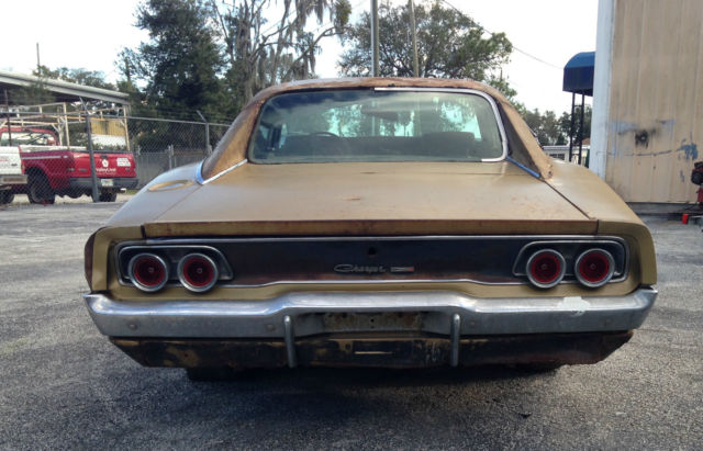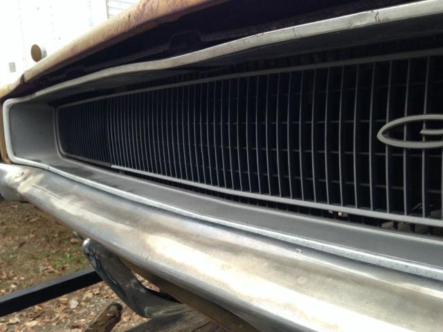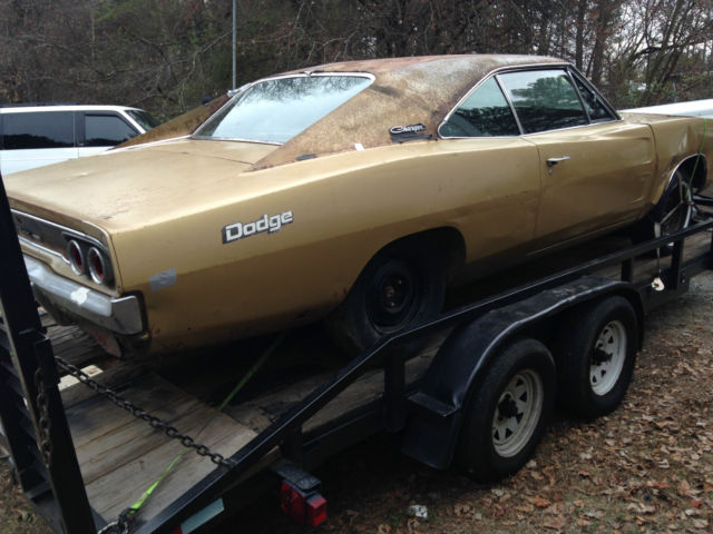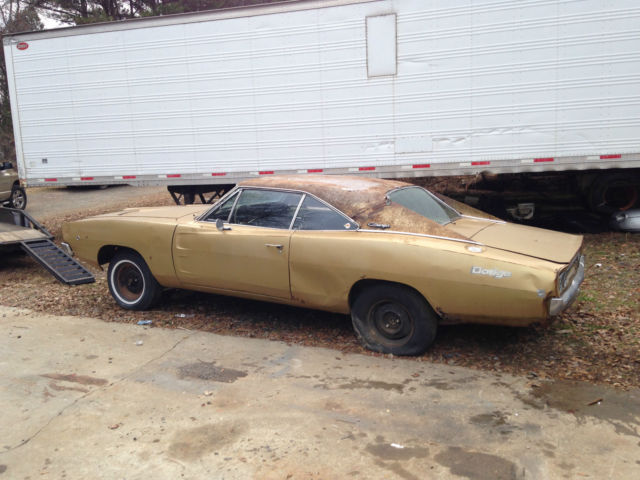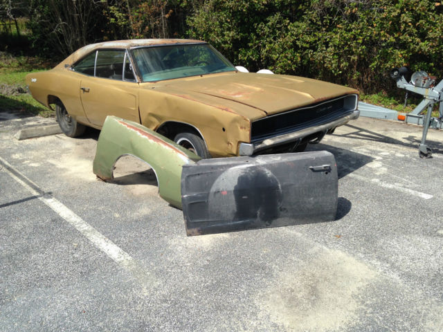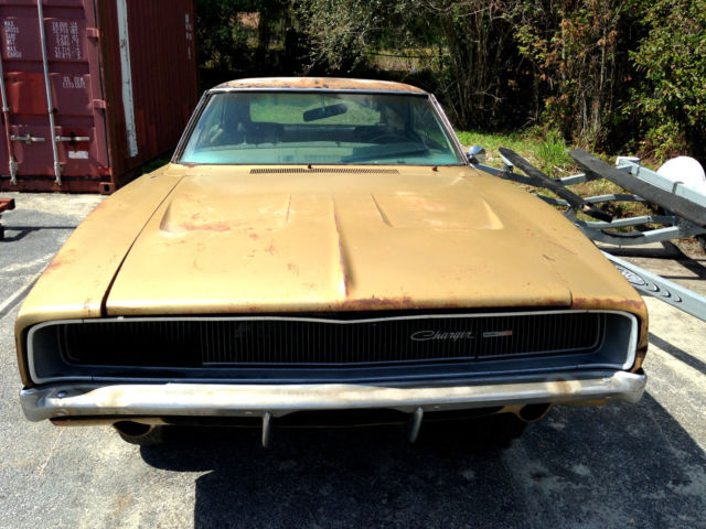 1968 Dodge Charger, originally a 318 automatic car with factory air, Gold with a vinyl top. The car currently has no motor or transmission, but it rolls fine. The car has (not a complete list): Original black headrest bucket seats (rare) Tan rear seats (these are from a 69 Charger, but can be trimmed to the 68 pattern) Dashboard including gauges, switches, bezels, stereo etc Original steering wheel (in great condition) Fantastic Grille (un-restored 68 grilles in poor condition go for as much as $2000+) Nice bumpers and bumper brackets (front and rear) Nice hood Nice trunk lid Nice doors Solid frame rails Factory K-member Intact rear-end (8 3/4?) Original tail lights + 2 sets of tail lights included with the parts Additional front fender and driver-side door Full set of glass Nice hood hinges Nice vent windows Miscellaneous parts including (but not limited to) door panels, tail lights, console and components, various pieces of trim etc... The car needs (Sheet metal): Both front fenders Both quarter skins Trunk floor Rear valance *The roof has some pinholes and a dent on drivers side. This roof may be salvageable. *The floor of the car has pinholes, but seems solid for the most part. *The front valance is somewhat bent, but again, seems salvageable. This is a very straight Charger, and will make a fantastic project car for somebody willing to give it some love. This car is for sale locally, we reserve the right to end the auction early. Please feel free to contact me with any questions, thanks.