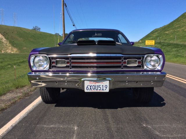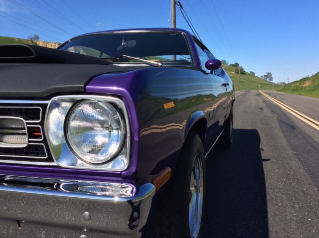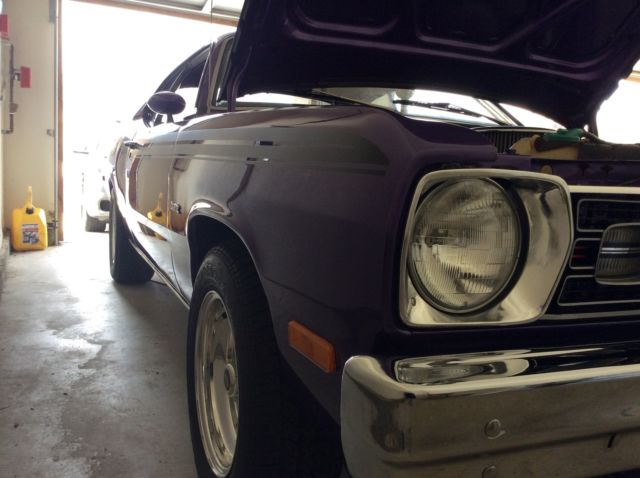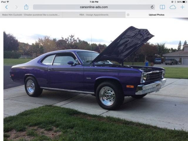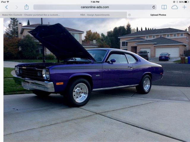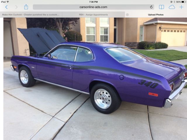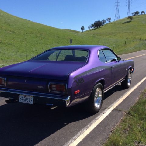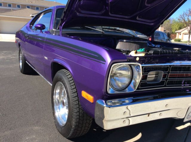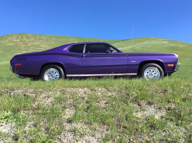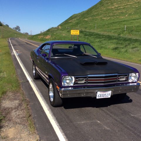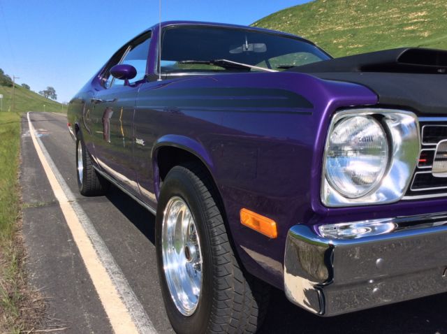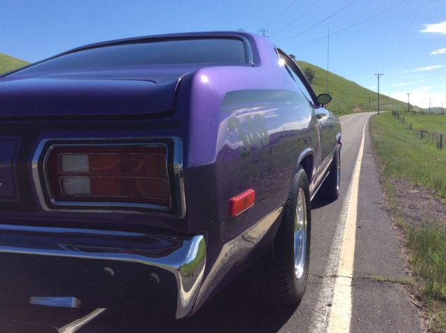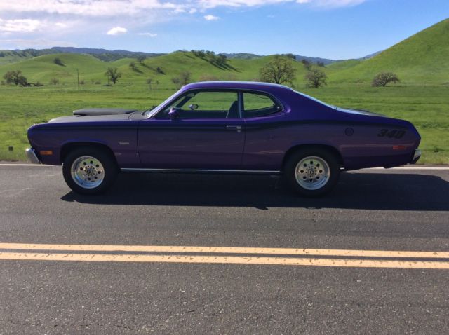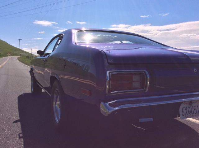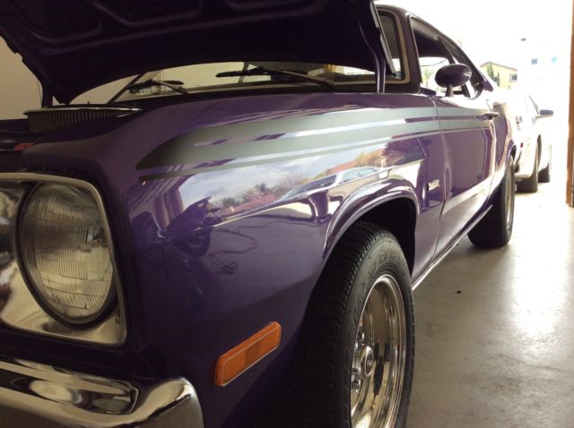 1973 Plymouth duster plum crazy purple 340 4 speed. The car runs EXCELENT and it is a real eye catcher, the lines and paint on the car are beautiful. I've done a lot to this car. Rebuilt transmission and clutch assembly complete, I striped the interior to the metal insulated and installed new carpet. New door panels and rear pasanger interior panels new rear speaker deck. New headliner and a new steering wheel. New pushrods and rocker arms, New carburetor and battery. The car has new chrome bumpers and I added a custom painted front grill. 4 new tires and new front wheels. I scraped against my garage door track, the passenger rear quarter is scuffed. The gas gage stopped working last week? The car has some small nicks in the paint but dose not take away from the beauty of this car. This car is undeniably beautiful to look at, and it starts runs and drives SUPER STRONG. You will not be disappointed! I'm relisting this car because the winning bidder last time is nowhere to be found. Call Jim 5083407555 - opens in a new window or tab