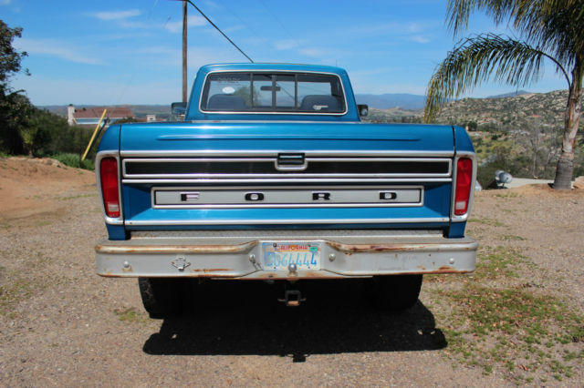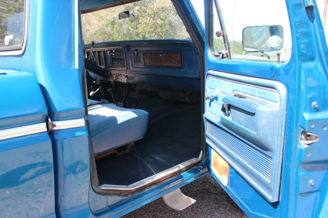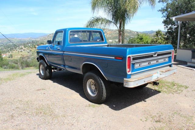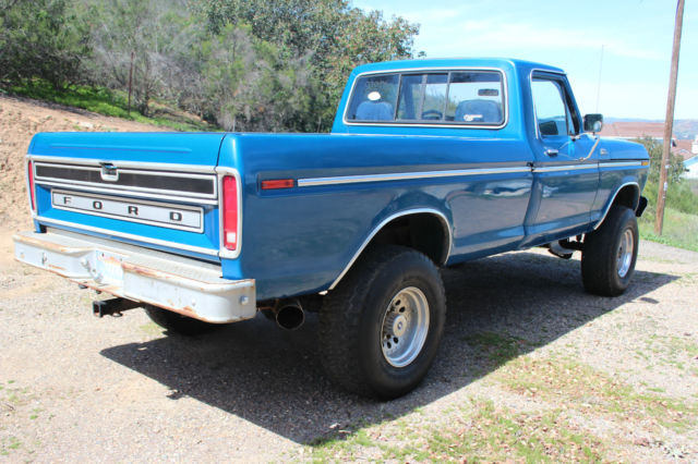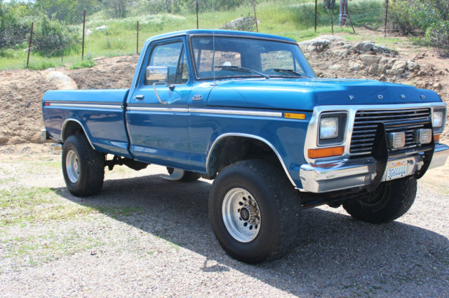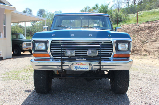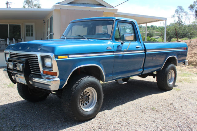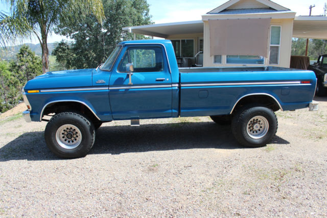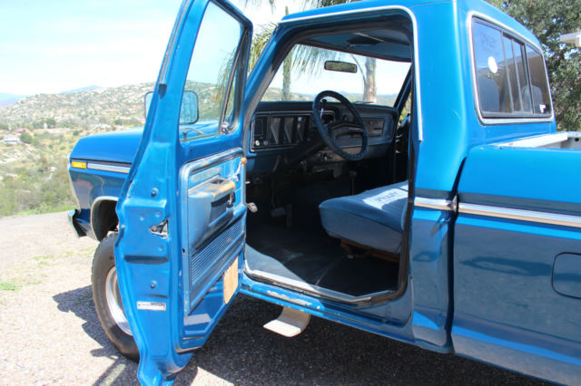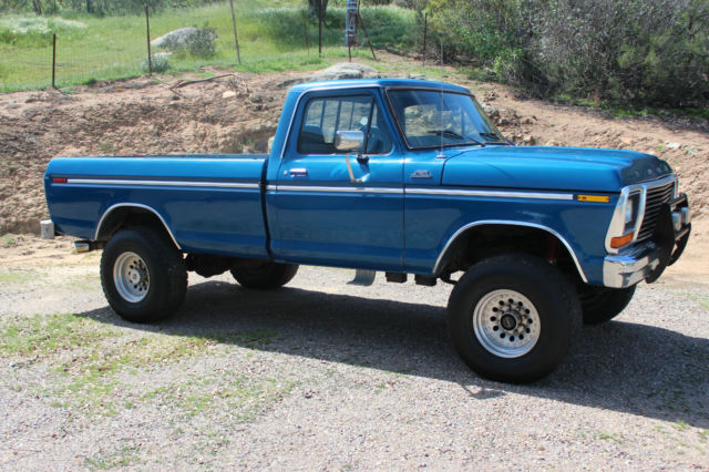 Hi you are looking at a 1979 F 250 Ranger 4x4 PS, PB, Cruise. Warn Locking hubs, Dual tanks. With 94,500 original miles. Engine was rebuilt 30k miles ago, with all new internals and the C6 was completely rebuilt at the same time. 3" Flowmaster exhaust with a 4" polished stainless tip. This truck was a friend of mine that owned the truck for over 25 years. He decided to sell because he never drove it. The truck sat from 2008 and I cleaned the fuel system, rebuilt the carb, put a new fuel pump and battery changed the engine oil and it runs great. All the lights work head, tail and blinkers. All the original smog equipment is on the engine. The interior of the truck is very nice the seat and the headliner have matching material. The body of the truck is very straight and the paint still shines nice. There are a few scratches and chips in the paint, so no it is not a show truck, just a very nice daily driver. The truck had a sunroof at one time and a piece of aluminum has been put over the hole and riveted on. There is a small rust bubble over the windshield and two small spots at the rear of the bed floor. The floors are rust free. The tires are weather checked. All the four wheel drive works properly and so do the brakes. Truck also has a very nice set of polished stainless Perlux driving lights that work. Glenn 760-315-2712