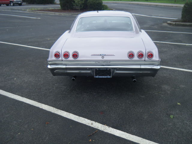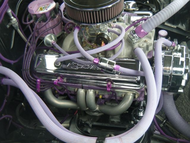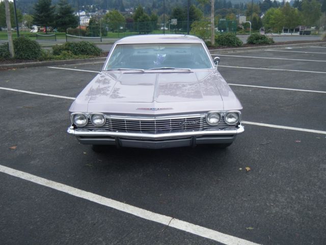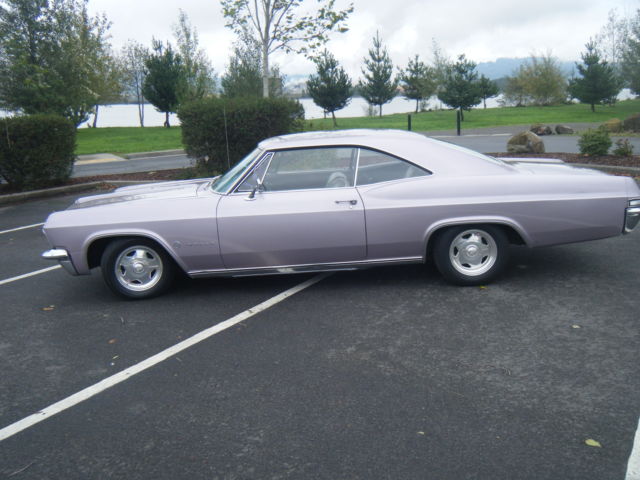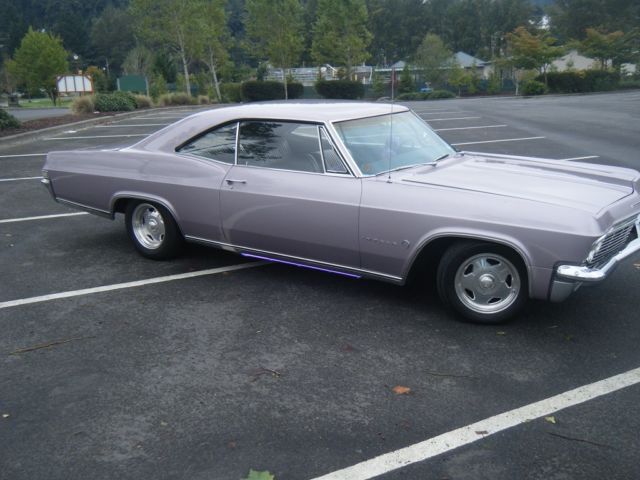 1965 Chevrolet impala coupe, the color is a one year only 1965 evening orchid. I get a lot of comments on this color. The impala is rust free and has been kept inside with a calif. brand car cover on it.The engine is a 350 with a mild crane cam and camel hump 194 valves in the heads with hard seats 2ins stainless exhaust .Edelbrock carb, K & N chrome air filter ,Accel HEI distributor ,Accel shorty spark plugs,Taylor spark plug wires, chrome valve covers, chrome alternator, chrome fuel pump, chrome power steering pump, chrome brake booster and master cyl, circle track brand steering box, BE- Cool Aluminum radiator. Chrome water pump, chrome pulleys, chrome fan blade,180 deg. thermostat which also engages the electric fan at 180 degs. Hedmon treated shorty headers. The hood latch and hood hinges are powder coated to match the car and engine. It has a Lokar transmission and oil dip stick. Lots of APR fasteners. The motor oil is changed each fall before putting away for the winter. There is a new NAPPA 12V battery. The transmission is a TCI brand turbo 350 with a shift kit installed and a B & M mega floor shifter with a quick shift rachet cable shifter.This works real well, a great setup. The windshield has been replaced. The front end has a Fatman 2 1/2 drop spindles with disk brakes, new front and rear shocks and rear springs. The wheels are centerline brand with BF Goodrich P205/60R15 on the rear and Toyo spectrums P205/65R15 92T. The interior and headliner has been replaced with the original style tuck and roll soft type leather like fabric. The radio has been updated to a AM/FM/cass. put into the stock place in the dash and has 2 rear speakers and 2 speakers under the front seats for that clean look.The rear seats have noise dampener in them .There are 2 summit gauges mounted under the dash for oil and temperature, The tail lights have blue dots in them and there are purple neon lights under the front, sides, rear of the car controlled by a switch under the dash. This really looks great at shows and parades. The Impala has been driven to Hot August nights in Nev. without any problems and in a cruise or parade it runs cool, never over heats. With the 350 and mild cam it has lots of power and shifts with a snap when getting on it. It also comes with the car cover. This is a good solid car With less than 88K miles on it..