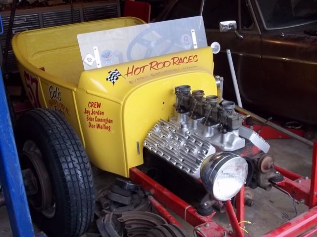 1923 T-BUCKET, LOTS OF HIGH END PIECES MAKE UP THIS CAR THAT YOU WOULD HARD PRESSED TO ASSEMBLE YOURSELF AND HERE THEY ARE ALL IN ONE PACKAGE. OFFERED FOR A SHORT TIME ONLY, IF NOT SOLD I WILL TAKE APART AND SELL IN PIECES WHEN I COME BACK FROM DEPLOYMENT. USE YOUR TAX RETURN BEFORE YOUR WIFE SPENDS IT ON SOMETHING STUPID LIKE A NEW SOFA OR A CRUISE. HALIBRAND 201 QUICK CHANGE CENTER SECTION CULVER CITY REAR COVER CLOSED DRIVE WITH SHORTENED TORQUE TUBE AND AXLE 39 FORD BELLS AND AXLES NOS 1948 FORD BRAKES (NO BULLSHIT) BACKING PLATES, DRUMS, SHOES. 32 HEAVY FRONT AXLE WITH ELIPTICAL FRONT SPRINGS 16" KELSEY HAYES WIRE WHEELS WITH ALUMINUM CRAGAR SPINNER HUB CAPS SCHROEDER SPRINT CAR STEERING 14" FOUR SPOKE FLAT STEERING WHEEL 39 FORD TRANSMISSION 48 FORD REAR RADIUS RODS FORD SPLIT FRONT WISHBONE NEW ROTTEN LEONARD ALUMINUM GAS TANK SPEEDWAY BODY FULLY WIRED AND PLUMBED = BRAKES WORK AND SO DO THE ELECTRICS FLATHEAD ENGINE MOUNTS NEW NEVER DRIVEN ON FIRESTONE 8.90 X 16 GROOVED REAR TIRES NEW NEVER DRIVEN ON FIRESTONE 5.0 X 16 RIBBED FRONT TIRES CUT DOWN MODEL A GRILL SHELL --- NO RADIATOR CLEAN NEBRASKA TITLE. COIL OVERS ARE NOT ON THE CAR OR AVAILABLE. CURRENTLY HAS NO REAR SPRING BUT HAS MOUNTS FOR A MODEL A REAR SPRING OR COIL OVERS, SHOWING NOW ARE COIL OVER SET UPS. I REMOVED THE CRUDE SEAT THAT WAS JUST A PIECE OF PLYWOOD WITH CLOTH COVERED FOAM THAT DID NOT FIT VERY WELL. WILL REQUIRE YOU TO PUT A SEAT AND INTERIOR IN IT. APPEARED IN JULY 2004 ROD & CUSTOM ###RADIATOR, ENGINE, SEATS AND VALVE TRAIN ARE THE ONLY ITEMS NEEDED TO PUT THIS BACK ON THE ROAD. ### ENGINE SHOWN IS A 1951 MERCURY WITH NEW EDELBROCK EARLY HEADS, EDELBROCK 4X2 INTAKE WITH FOUR REBUILT STROMBERG 81'S, HARMON COLLINS MAGNETO REFURBISHED BY TOM CIRELLO. ENGINE HAS NO CAMSHAFT, LIFTERS OR VALVES. BLOCK IS DRILLED FOR ADJUSTABLE LIFTERS. I PULLED THIS FROM MY LAST ROD AND WAS A VERY STRONG RUNNING ENGINE THAT DID NOT SMOKE, WAS JUST GOING TO GET A HOTTER CAM, NEW LIFTERS AND VALVES BUT NEVER GOT AROUND TO IT. $12,000 TIM 402-680-8565