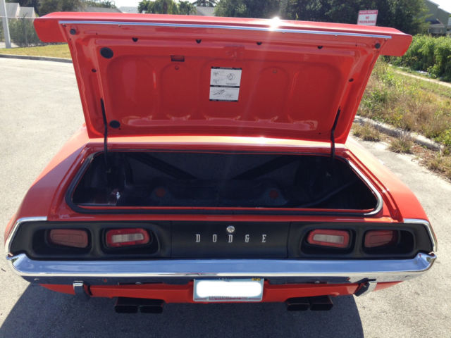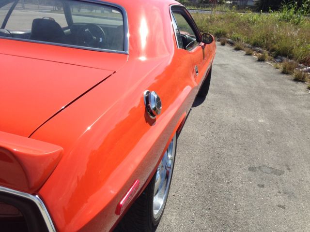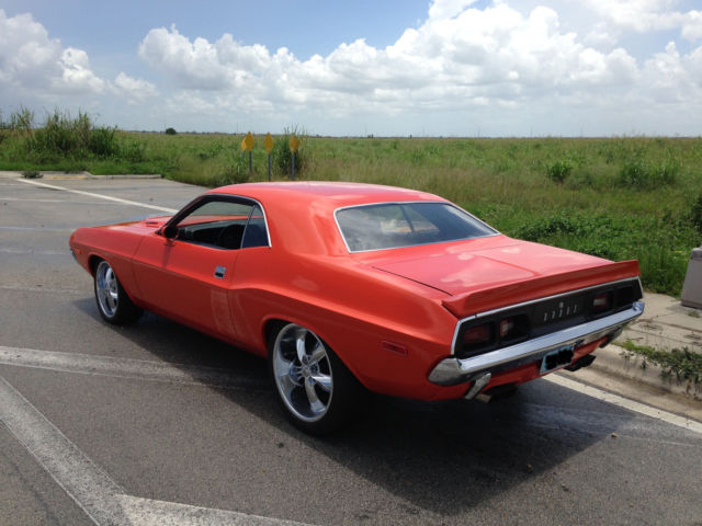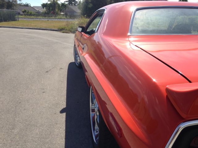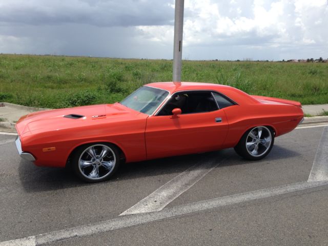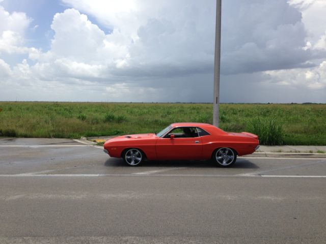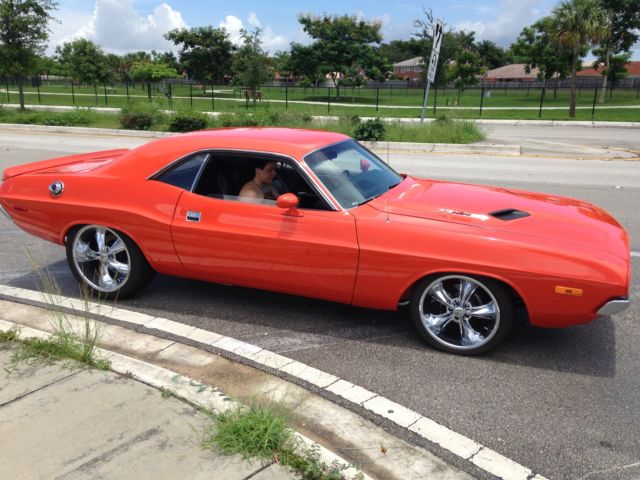 Will consider trades and cash..Looking for a 67-69 Resto Camaro or similar 1970 Chevelle 454, Boss 429 Or other similar quality muscle car . For your consideration is a fully restored pro-touring 1972 Dodge Challenger. Every part of this car was restored and or replaced to new. Hundreds of man hours, all paperwork and receipts included. Fresh $20K Mopar performance Hemi 472 Crate engine with less then 500 miles on it, still not broken in. NEW TCI High performance 727 Torque Flite Automatic transmission. Fully customized engine bay with many one off parts made of polished aluminum. New Classic Air A/C system, March serpentine pulley system and brackets with Aluminum Polished P/S pump, custom radiator, hydraulic brake system, wilwood four wheel brake system, full Hotchkis TVS suspension kit all around ($3400 value): Features: ⢠Tuned, balanced system for optimum handling. Contains: # 1110 Geometry Corrected Tubular Control Arms # 14366 Adjustable Strut Rods # 16366 Adjustable Steering Rods # 2254 Lightweight, Durable 1 1/4" Tubular Front Bar, Adjustable 13/16" Tubular Rear Bar # 243667 Geometry Corrected Leaf Springs # 4011L Sub Frame Connectors, Taylor battery relocation kit to trunk, high performance shocks, High performance Quick jet four barrel carb, too much to list.. Interior is all new, custom auto meter gauges, vintage looking NEW TECH radio with MP3, Custom speaker system, Power windows all around. Custom exhaust system with custom made headers. ($20K)High end beautiful paint job in HEMI orange, done right from bare metal up. Custom Foose Alloy wheels, 18inch front and 20inch rear. Power brakes, power steering, high performance steering box, Dynamat insulation inside, custom prototype 472 HEMI hood Emblems, the list goes on and on. This car is immaculate. No rust anywhere!! A one of a kind build took over 2 years to finish, you couldn't build one for the asking price, shop labor alone was over $60K. Recently appraised at $125,000..Get it now before she goes to Barret Jackson where these Pro-touring cars have been breaking the bank well over $100K. For more info on the car call Sharkey's garage at 305-322-9108, they did most of the custom work on the car and can answer any questions, ask for Sharkey . Email with questions or for more pictures. Check out the video below...! http://youtu.be/w6rvPXRhlrU