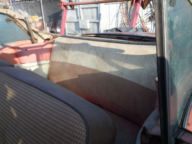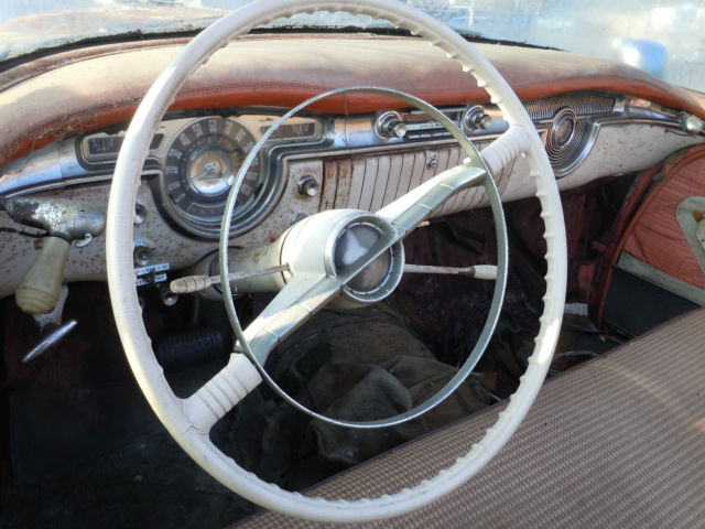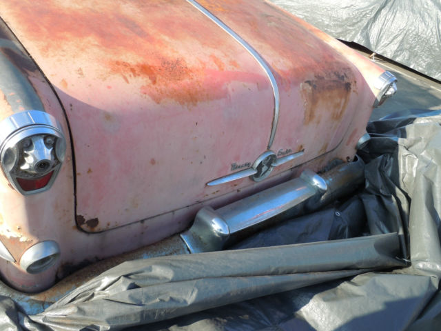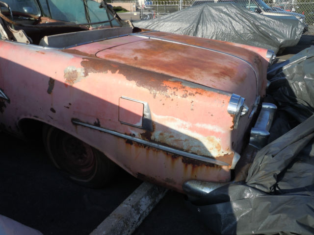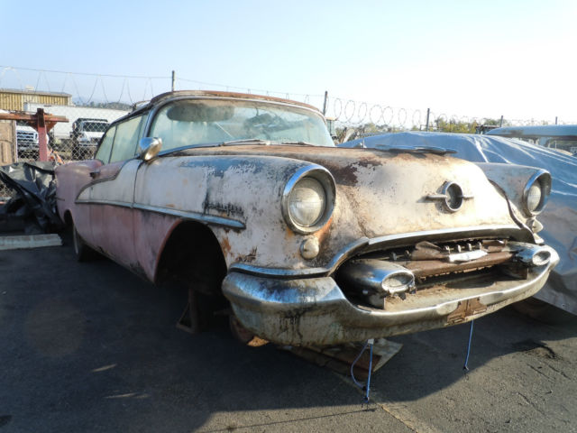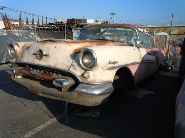 Up for sale is a 1955 Oldsmobile Starfire, as you can see in the pictures the front brakes have been removed. We should have everything to make it a roller. There is no engine or transmission in the car. But we can supply an engine and transmission to go with it. Please understand this car has been sitting for at least 20 years that I am aware of. It does have clear title with a CA no-op on it. No license plate. The car appears to have been coral and white, as were the other 2 that came from this lot. The right front fender may have been changed as I see blue paint under the peeling paint that is on it now. Please note the spot light is still on the car. Please understand this car needs a complete restoration. But with only 96 thousand miles showing on the odometer, how could you not love this car. I purchased this car with a load of parts as well as other cars. I have a 55 olds 88 conv avail, I have a 56 Ford crown hard top for sale, 1955 Ford Crown glass top that is available. I DO NOT WANT TO DEAL WITH TRANSPORATION. ITS NOT MY THING. I DO HAVE SOME PHONE NUMBERS THAT I CAN GIVE YOU.