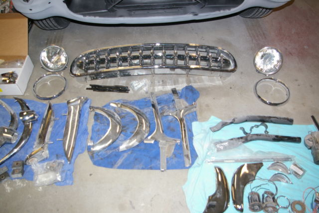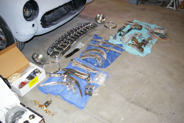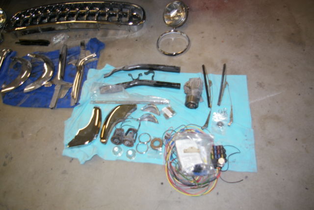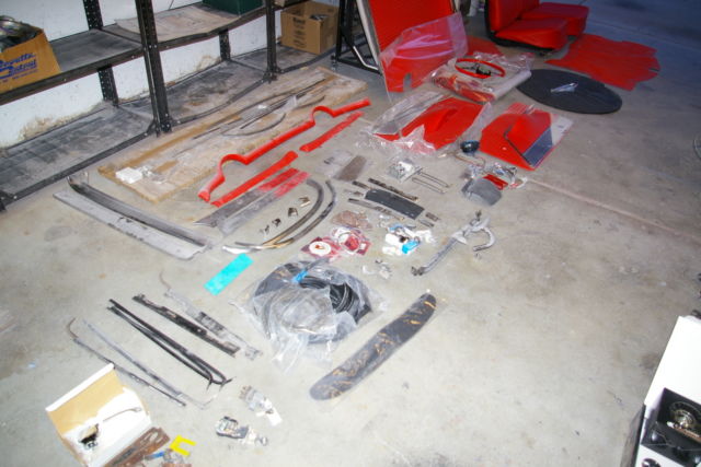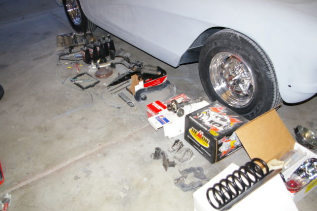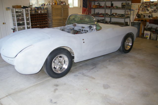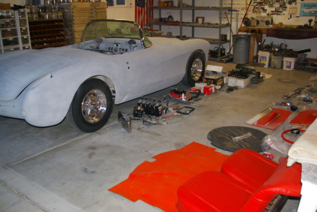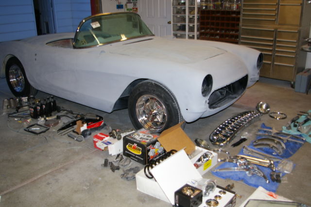 1957 Corvette body off frame project needing to be finished. Hardtop only. This is not a numbers matching NCRS car, but built as a period hot rod. Needs finish body work, paint, and reassembly. Please see pictures for parts included, and ask questions if in doubt as to what is pictured. The body was taken off the frame, which is excellent (NO rust or repairs), and then the frame was cleaned and painted. Body was then mounted back on the frame. Following is a partial list of what is included...EVERYTHING pictured IS INCLUDED. MECHANICAL: NEW GM crate 350 motor installed. EVERYTHING is NEW unless stated differently... Edelbrock intake, Demon Carb, custom 9 fin valve covers, good used radiator with upper shroud, new ram air cleaner setup, new fuel tank, used original wiper setup, water pump, fuel pump, clutch, one wire alternator, rebuilt distributor, used (great condition) Super T10 4 speed transmission, new driveshaft, complete new exhaust system from manifolds back, brakes including master cylinder, all steel lines, rubber lines, wheel cylinders, NEW American Racing Salt Flat Special wheels, new tires, completely rebuilt steering box, new pair of front springs (in case you want to raise the front), more, etc. INTERIOR: Original seat frames with tracks, newly upholstered seats with new foam, new door panel upholstery, new kick panels, new carpet set, new mirrors, new gauges with matching clock, original speedometer with new bezel, nice pedal assembly, hood pull, cowl vent mechanism, HARDTOP, new seat belts, deck lid trim and latch, door trim, recovered dash rail and upper door rails, new steering wheel with hub, misc. switches, new trunk mat and board, more, etc. EXTERIOR: New windshield, rechromed windshield posts, new weatherstripping set, complete new side cove stainless trim set, rechromed front bumpers, new bumperette set, rechromed rear bumpers, new exhaust chrome set, new tail lights, new grill, rechromed grill oval, more, etc. All rechromed parts are nice, but not show quality. Many more parts as pictured. Reserve is not much higher than the parts alone.... Inspections are welcomed and recommended. Sold AS IS. Transportation at buyers expense.