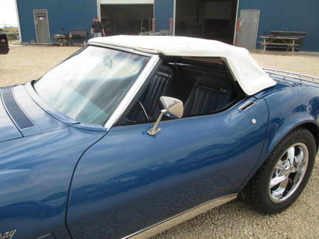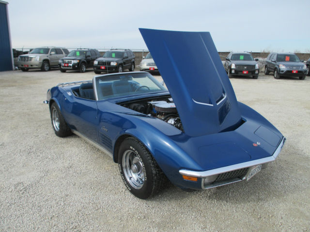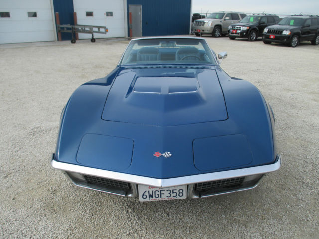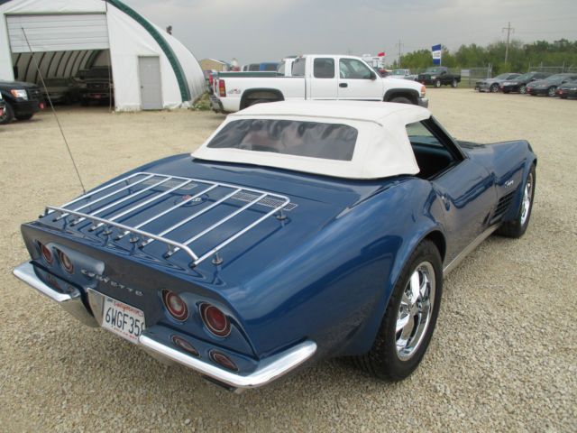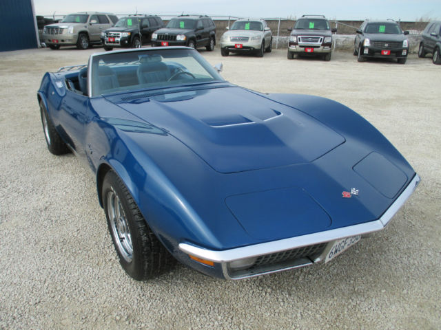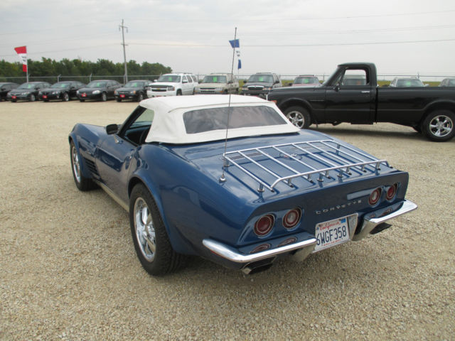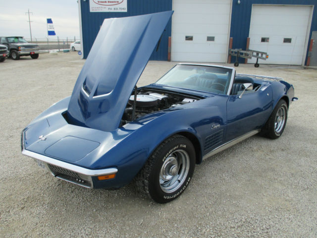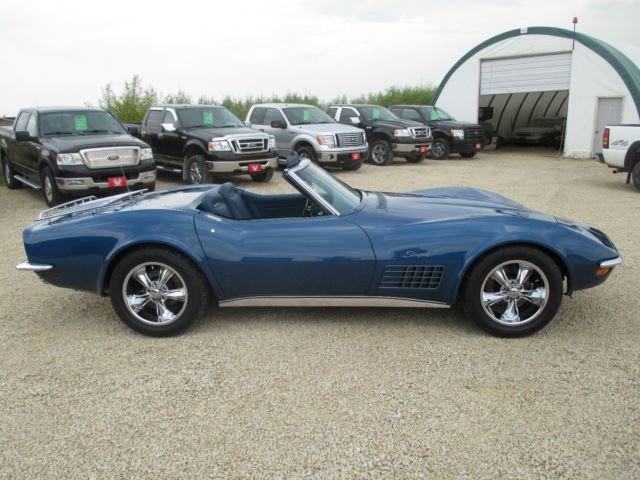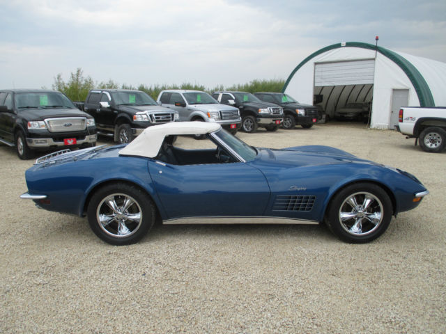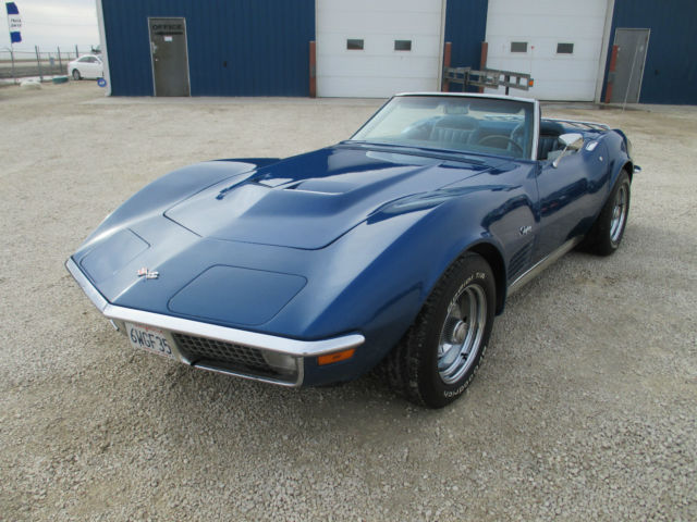 Rare Find 1971 Corvette Convertible 350cuin 370HP 4speed Muncie. This in a 1 owner family car from just outside of San Francisco California. Immaculate condition inside and out. 83,000 original Miles. Brand new Top, and interior just installed. Newer factory code color paint (Bridgehampton Blue). Runs and drives strong and pulls hard through all gears. Too much to list. Must see to believe condition. Please only serious inquiries. Brand new Mb safety. If you have any questions please do not hesitate to call @ 204 831 7040 . Vacuum for Headlights/Wiper Door works great. All the gauges work as well. Fly in and drive her home or have it shipped. We will assist with getting across the Border if need by. Comes with both the Foose wheels & Tires and the factory Rally Wheels. No disappointments. I also have a video of the car running with a full walk around. Will send upon request to your email. I encourage anyone in the area to come take a look at this classic in person as the pictures do not give it justice. Solid rust free frame with a beautiful body and newer interior.