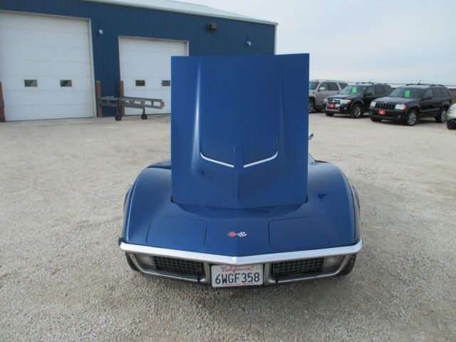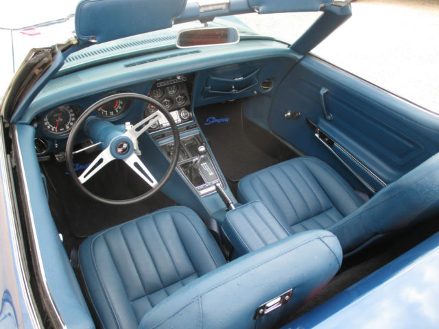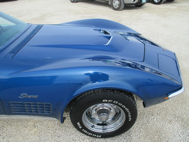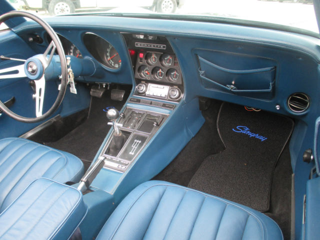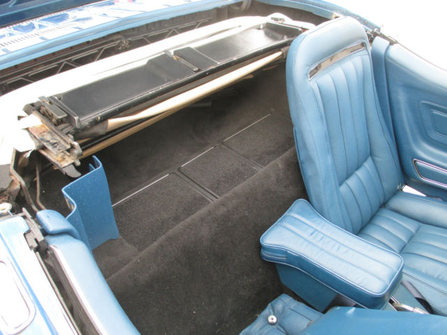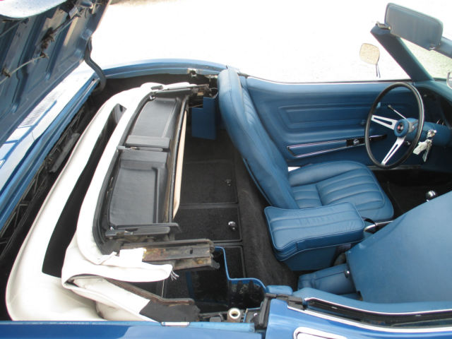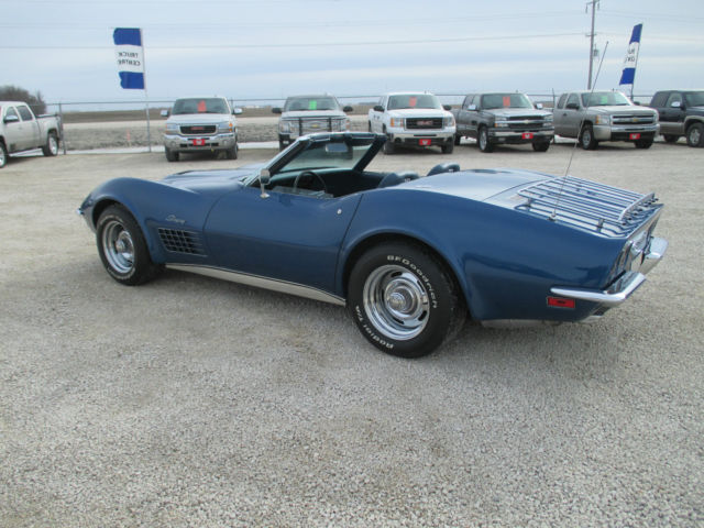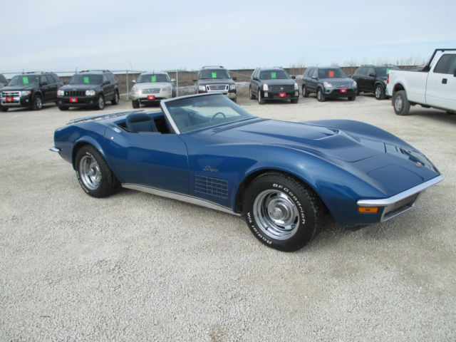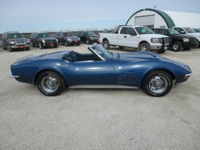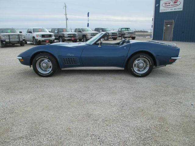 Rare Find 1971 Corvette Convertible 350cuin 370HP 4speed Muncie. This in a 1 owner family car from just outside of San Francisco California. Immaculate condition inside and out. 83,000 original Miles. Brand new Top, and interior just installed. Newer factory code color paint (Bridgehampton Blue). Runs and drives strong and pulls hard through all gears. Too much to list. Must see to believe condition. Please only serious inquiries. Brand new Mb safety. If you have any questions please do not hesitate to call @ 204 831 7040 . Vacuum for Headlights/Wiper Door works great. All the gauges work as well. Fly in and drive her home or have it shipped. We will assist with getting across the Border if need by. Comes with both the Foose wheels & Tires and the factory Rally Wheels. No disappointments. I also have a video of the car running with a full walk around. Will send upon request to your email. I encourage anyone in the area to come take a look at this classic in person as the pictures do not give it justice. Solid rust free frame with a beautiful body and newer interior.