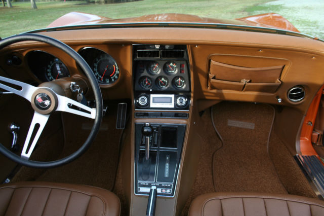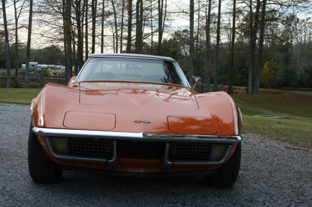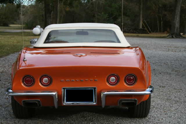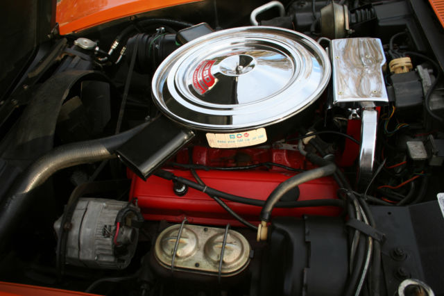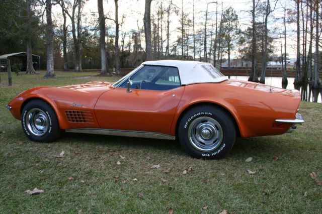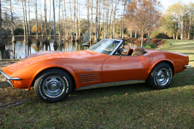 1971 Ontario Orange Chevrolet Corvette Convertible. All Numbers Matching! This corvette started life on 01-18-1971, was delivered to dealer code 463 in zone 16, Dealer name: M and O Chevrolet, Fayetteville, NC. as per NCRS shipping data report. This 39,692 mile car has recently been completely serviced and ready for the road. Newly replaced interior components, such as complete Al Knock seats and foam, Al Knock carpet and retro sound radio. (all original interior parts are available and original radio is in working condition) Replaced tires, shocks, rear trailing arms and half shafts (rebuilt by Mike Zamora, ReNew-A-Vette) New air condition (not rebuilt) compressor, new a/c hoses and expansion valve. Kept to original look and working condition. All American carburetor re-manufactured original numbers matching q-jet. White soft top and body color hardtop are both in very good condition. Car has been repainted, condition estimated to be 8 out of 10. Fiberglass appears to be all original with all bonding strips intact. Frame is in excellent condition, no rust with stenciling numbers still on frame. Engine code V0108CJK, 350/270hp Power steering, Power brakes, all vacuum systems working properly. This car is a really sweet driver and is ready for your enjoyment.