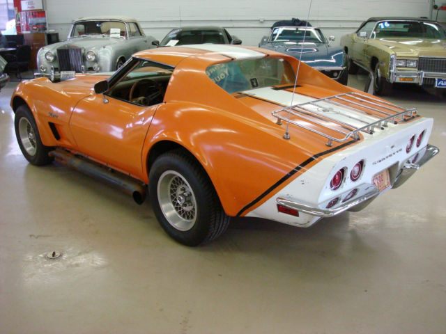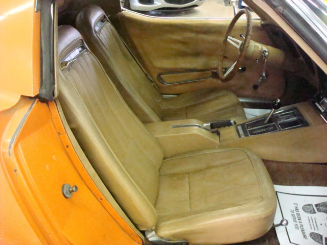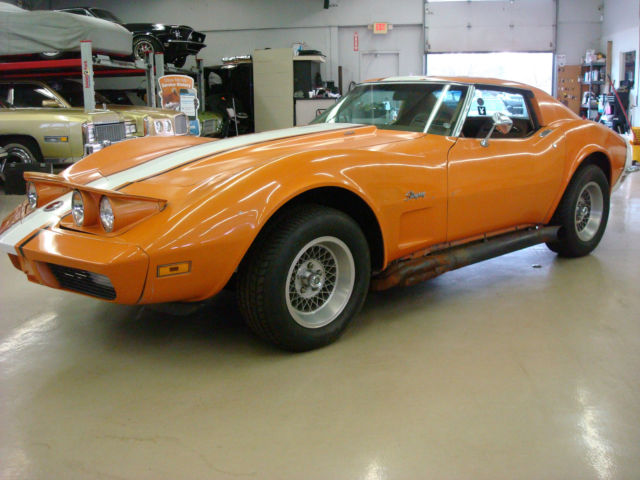 1973 Corvette Coupe, 454 non numbers matching engine, matching correct heads, and " snowflake " aluminu m intake. This is a true 454 , automatic car. The engine is very heal thy, and the transmission shifts exce l lent. This is a n air condi tioning car, but the com pressor is missi ng. AM FM radio . Th e car was painted back in the mid 70's, the paint on the car has most of its origi nal orange color. I know that it isn't a baldwin motion car, and the stripes were ad ded . There are still stickers on the windshield that show its f rom New York . The pre vious owner said t hat when he bought it back i n the 70's, it had wide aluminum mags, and a small ci rcular mesh air cl eaner. I pu t these rims and tires on to try and give it th at look it had back in the 70's. The car has new cali pers, rot ors, brakes, master cylinder, carb u r e tor, radiator, freeze plugs, newer tires, and a new bat tery . I had the steering column rebuilt like new. I have about $5,000.00 i n receipts. The paint is faded, and very origi nal with tons of patina. The interior is in poor shape, but with a new carp et kit, recovered seats it would look really good. I have very nice door pane ls that go with the car, along with other misc. par ts for th e interior. This is a great car to drive, while you restore . The mechanical end of it has already been taken care of . I do n't thi nk the t tops leak, and it has nice ch rome around the t tops. The frame is very solid, it shows the typical "rust dust" color, but it is rock solid . It has a he althy sou nd through the side pipes. Th e headlights don't move, and it has a small fiberglas s c rack around the drivers side headlight. A very small 1 inch crack on the passenger side f ront fe nder. O verall, the car is very nice , the body is clean. I get to ns of compl iments on the car because it has a classic na stalgic look to it. Bid with con f id ence, t his is a great car to fix up. I res erve the right to end this auc tion early . I hav e a clean clear title. T he car is sold as is with no warrant y. Overseas bu yers welcome, dealers welcome. I can assist with shipping, b uyer pays for shipping. Our dealershi p is located 1/2 hour west of Chicago, 1/2 hour f rom major airports. Joe 630- 975- nine five nine five. www.napervilleclassics.com www.napervilleautohaus.com