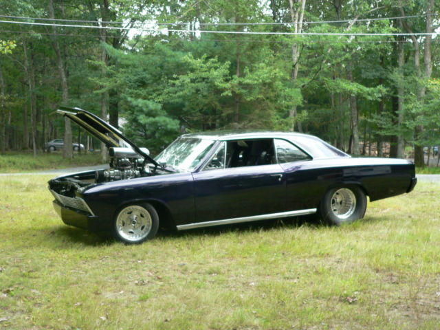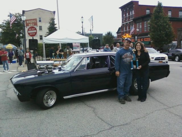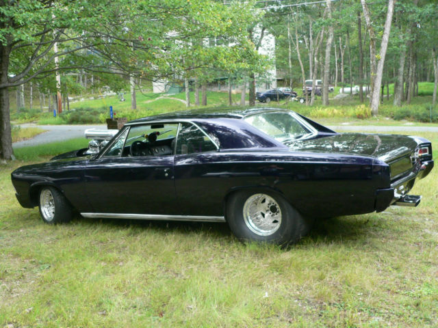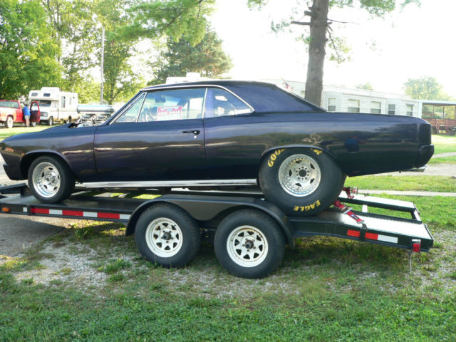 1966 Chevelle ...... Chevelle lovers this is it .The car for your raceing or just a week end driver...Lets start with the body and paint.Body is straight with a paint job that many brag about. Black plum purple.Car looks black when the sun is not shineing on it.When sun hits it the color pops you see the dark purple and silver and gold fine metal flakes..... LETS START WITH THE POWER HOUSE UNDER THE HOOD (SOME WHAT ) -496 Super Charged Engine -Complete Dart Block and Dart Heads -MSD IGNITION WITH REV. LIMITERS -400 reverse pattern Turbo Automatic Manual Shift -1/4 Stick Hurst Shifter -Racing Seats and New 5 point lach safety belts -8 point roll cage and its tubed out -Coil overs Qa1 shocks -tubular Swing Arms Boxed frame to handle over 800 plus H.P 4 Link Suspension at rear,Highly Modified Ford 9 inch Rear to support them new 18 in Good Year Slicks it has. This car has only a couple passes on it at the track and not with open headers or air filters off.It is a power house. Engine is barely used other than being a sunday driver and show car..all options work to put on the road ,lights,wipers, horn except you must put on dot approved tires... and etc.previous owner won tons of trophes and car shows and never raced it...I have had it and injoyed it for several years and invested alot into it as well...I have the full documents and history of this Bad Boy Chevelle if you need more info as well as the dyno report over 800 h.p.i can email it to you..The Trailer you see is in very good codition and can be purchased for a aditional 1,500. You will be very happy at half the price it cost to make this one of a kind beauty....yoursPlease if you dont have the money or good rateing donot apply or bid..............And please send down payment of 1 thousand down through pay-pal or certified bank check with in 3 days of aution ending Non -Refundable!! And pay balance in cash at pick up with in 30 days of auction ending.IM IN OHIO 43008 AREA...Car is safe and in covered storage.....Any Questions call me at 570-517-6815. Vince Adamo