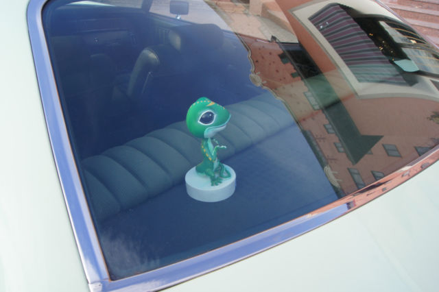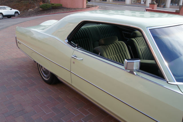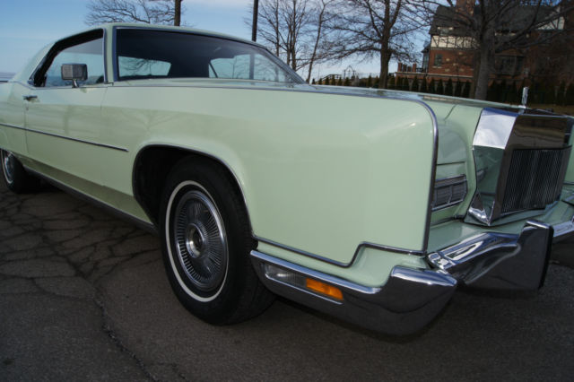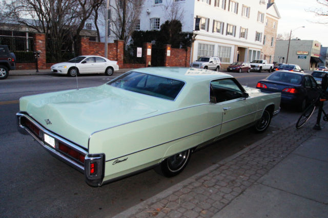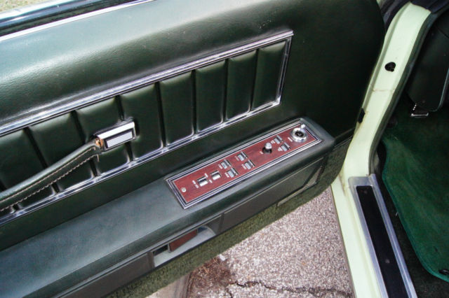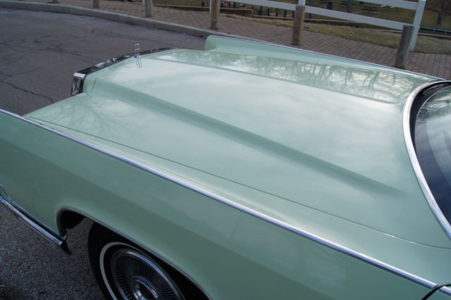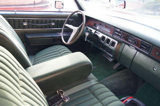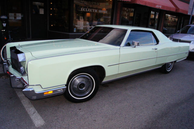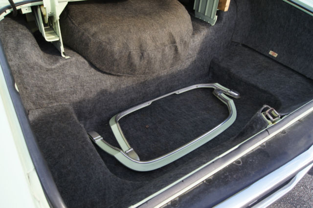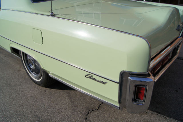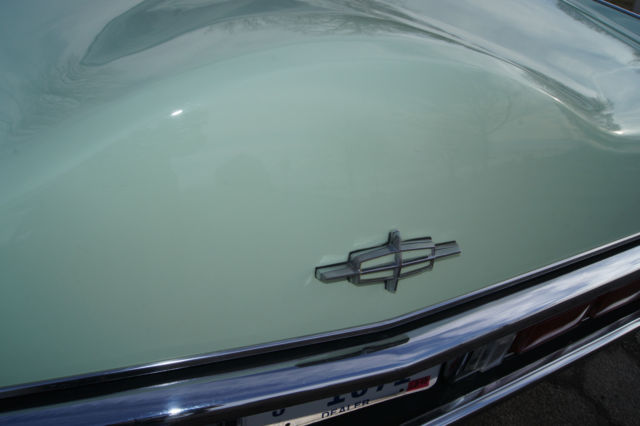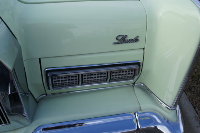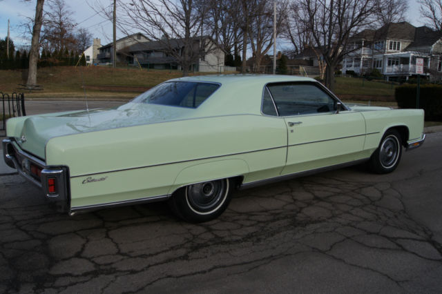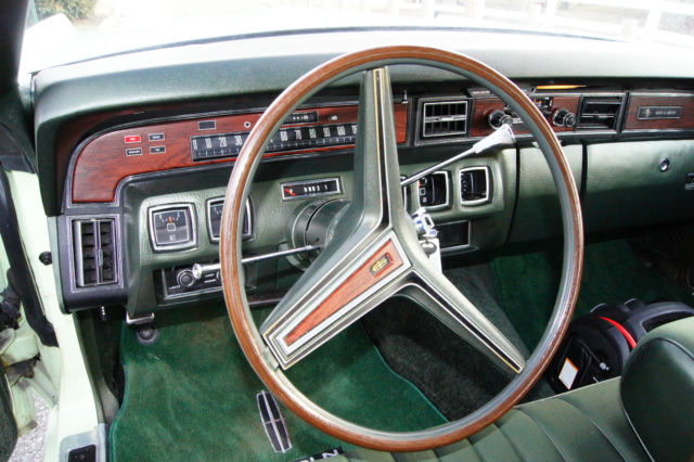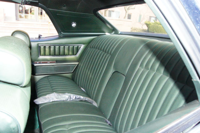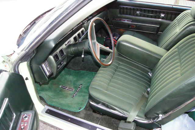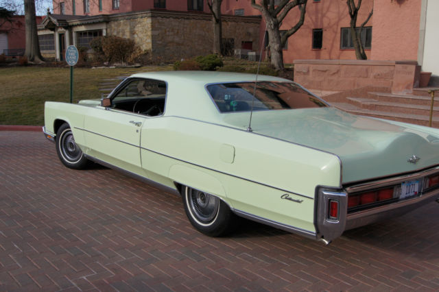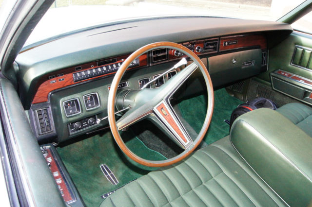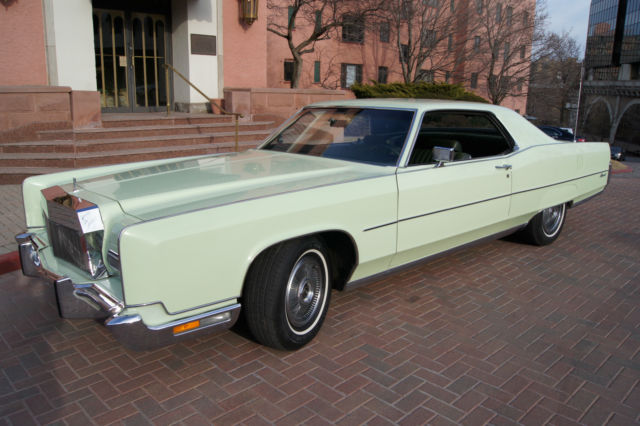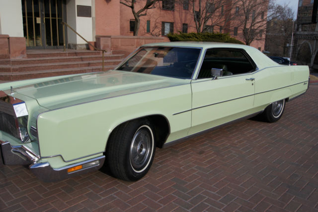 This stunning 1973 Lincoln Continental Coupe was obviously someones pride and joy. It looks like the original owner "Ernest Johnson" Special ordered this beauty in a striking light green with dark green interior; and then I guess had it sent to a custom limousine company where it had the limousine styled chrome grill and trunk lid added. This Lincoln is basically like new in every way. The what appears to be the original paint is virtually flawless, plus there are no dings, dents or apparent damage or rust. The interior is like NEW, with no wear. The odometer says 22668 which I have no doubt is actual, although the title says 23555 miles, which I believe was an error in reporting at some point. The power windows and seats work like NEW, as do all the lights, and everything but the clock, and the A/C will need a charge. Also, trunk lid won't stay open on it's own. The mighty 480 V8 runs like NEW, and drives just as nice too. I really don't know what else to say about this car; only that it is probably a one of kind Lincoln. I imagine there's not too many early 70s coupe in this condition, as they had pretty low production numbers, under 14000 in 1973. This car comes with two sets of skirts, the original full skirts, and a pair of thin partial skirts, and the original styled grill, and a custom car cover. And last but not least the Geico gec ko on the back deck .