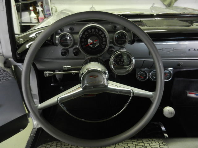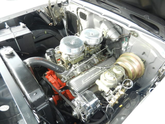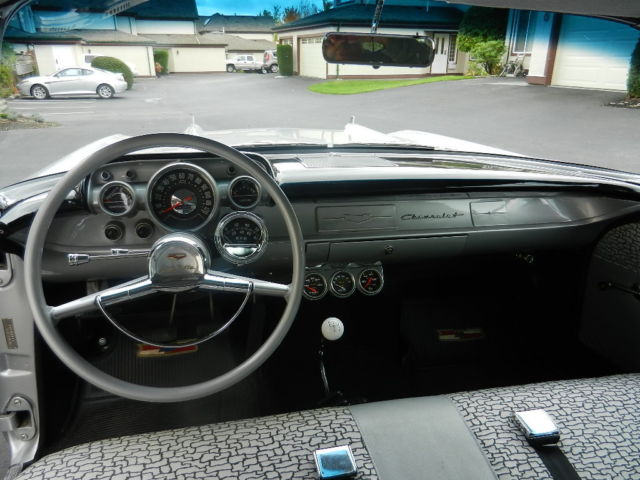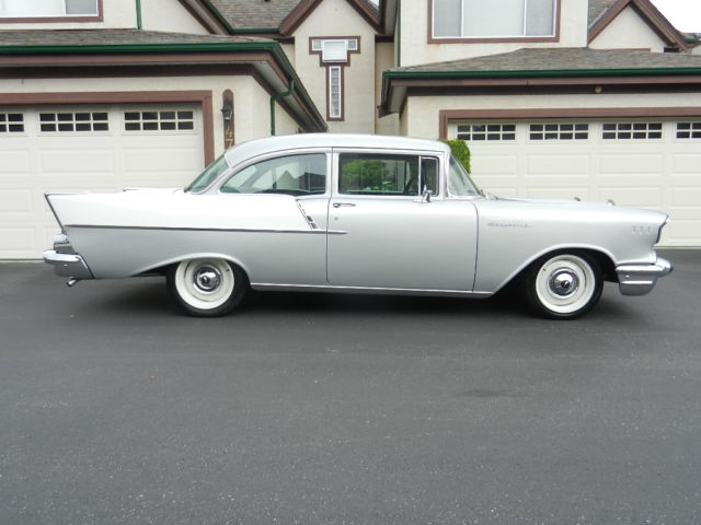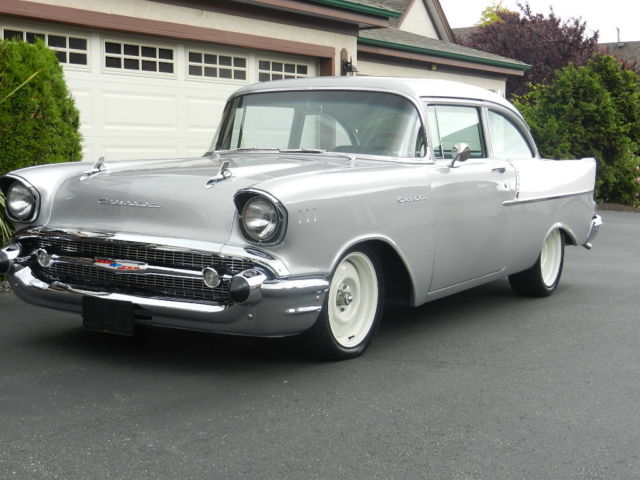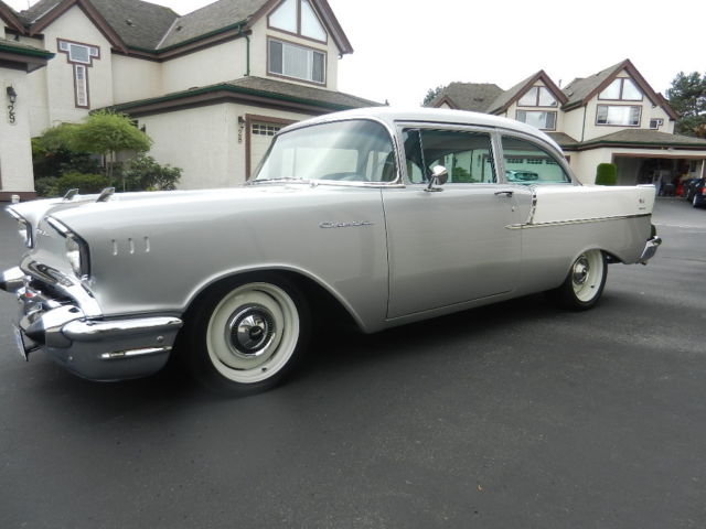 A 57- 1211 model. Purchased out of Ohio 2 yrs ago.. Car was a multi year frame off. absolutely everything is new, period. Original factory colors of Imperial Ivory and Inca Silver code 808. Has the ("270hp look") Sports a 64 Corvette engine, 461 heads with an L79 (350hp) cam and correct 57 era Dual Four intake. CPP front discs and 2in dropped spindles, power brakes and steering, rear drums, 2in lowering leaf rear springs. Stock rear end with 3:73 Posi, Muncie 4-Spd with Hurst shifter, Atlanta one piece frame, one piece front bumper, Ididit tilt column with custom 15in steering wheel (top half of horn ring removed and correct "Canadian only" 150 horn button) vintage style tach, glovebox stereo. original (Radio, heater, clock, cigarette lighter delete car). Underside was red oxide now painted Black. Custom 17in Wheel Vintique rims 8in rear with 245/45 Toyo's and 7in fronts with 225/45's... Body/Paint is flawless. Added cross flags and custom "Dual Fours" emblems on rear quarters. it drives and shifts like a dream. Interior is all new with portable center console. All windows function as normal (rear pass window requires some adjustment) Drive, Show and enjoy. Buy it Now price is $45,000 US funds. Shipping is the sole responsibility of buyer. Does not ship til money is cleared. Car located in Surrey British Columbia Canada. Car is for sale locally. Ric 604-375-3673 if you have questions.