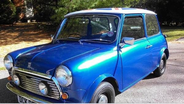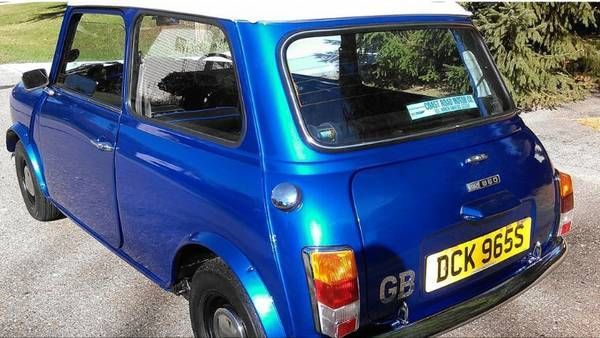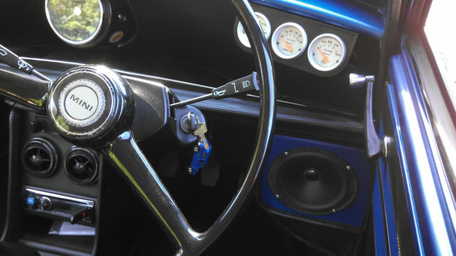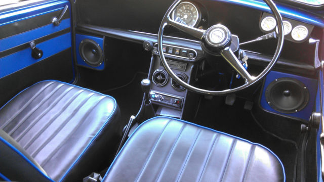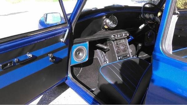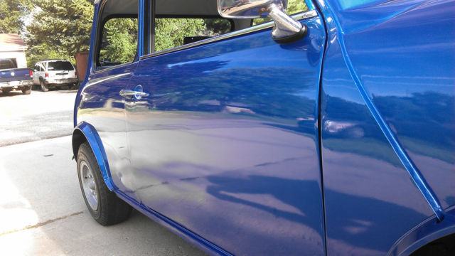 Body-Off restored 1977 Austin Mini Cooper. Right hand Drive, Imported from Britain. Included original equipped British front and rear plates. Vehicle Body off restored fall-winter-spring of 2012-2013. Vehicle stripped of all doors,trunk, glass and any bolt on parts down to bare shell,shell media blasted, painted and reassembled using vast majority new parts. NO rust, NO dents. Several cosmetic items as badges,glass and door handles retained for petina and honor. Nearly all parts on car replaced new, taillamps, headlamps, brightwork, window seals, door and trunk seals, grille with rally spot lights,dashboard reupholstered, interior royal blue seats, shift boot,and door trim panels, seats reupholstered with custom match covers, Floor console with and headliner custom made in Britain. Custom matching royal blue speaker pods incl high output Alpine stereo with USB and Bluetooth inputs, MB-Quart speakers, and trunk mounted subwoofer. Steering wheel profesionally reconditioned as new. New carpet,floormats, sound deadening. Engine rebuilt, early 60's model bored 30 over,block shaved,pistons custom long skirt,flat top 4 ring JE's with custom numbers scribed to each.Power seal rings, 3 compression ,thicker lower oil rings(.165 oil rings) ,pistons weight matched to the gram. Rods weight matched. New (zero oversize) clevite standard bearings. Performance cam, high volume race oil pump. Big valve late 60's head. 11.5+ compression ratio,will run on 87 but prefers premium. Engine custom painted to match contrast blue of car. All electrical wiring,harness completely reconditioned and custom wired. All new waterpump and cooling system components. New brakes,shoes,wheel cylinders,lines and master cylinder. Have records and documentation of import as well as MOT inspection reports & records of service during use in Britain prior to import. Since completion of restore has won consistent 1st place as well as People's Choice awards. Starts ,runs and drives strong. Garage stored and kept,washed and dried after every drive before retiring for the day. Stored since Sept 2014 noticed some oil from crank seal. approx 200 miles on car since restore. Buyer is responsible for vehicle pickup or shipping. Cash in person, Certified Cashiers Check accepted only. Full Payment due within 3 days of auction end