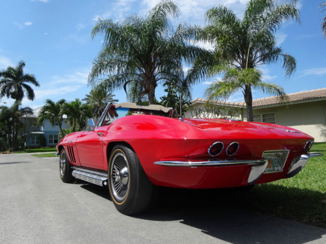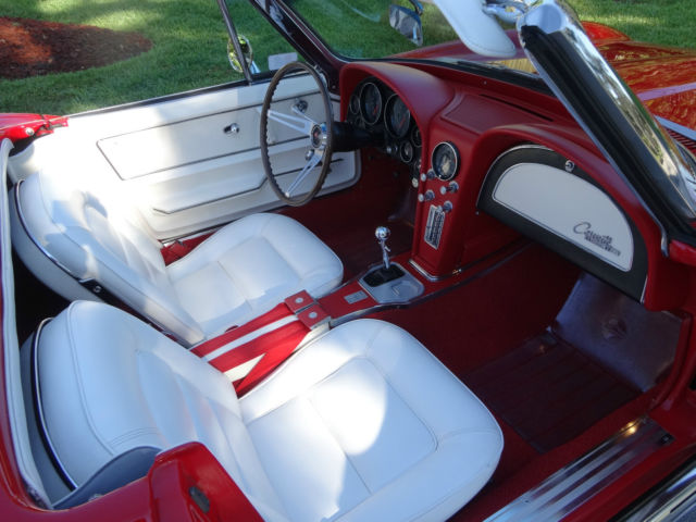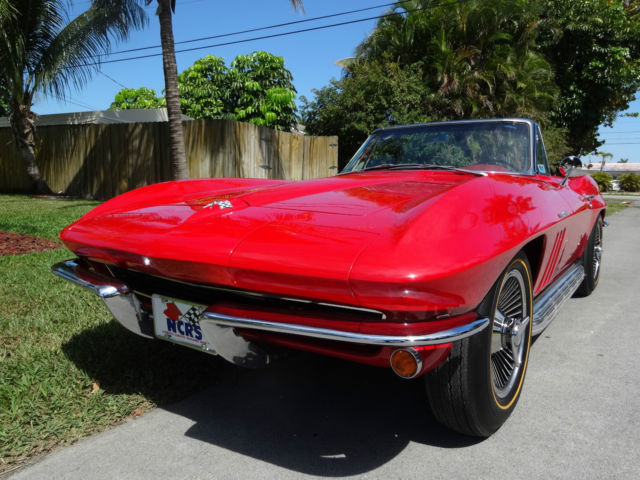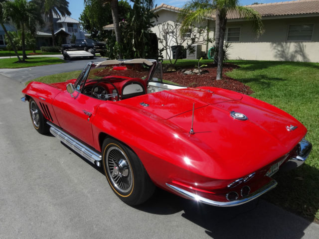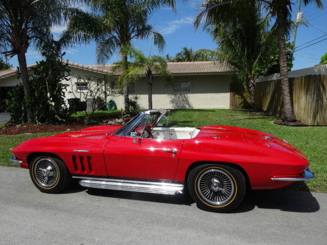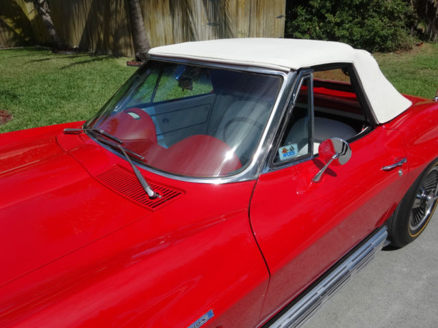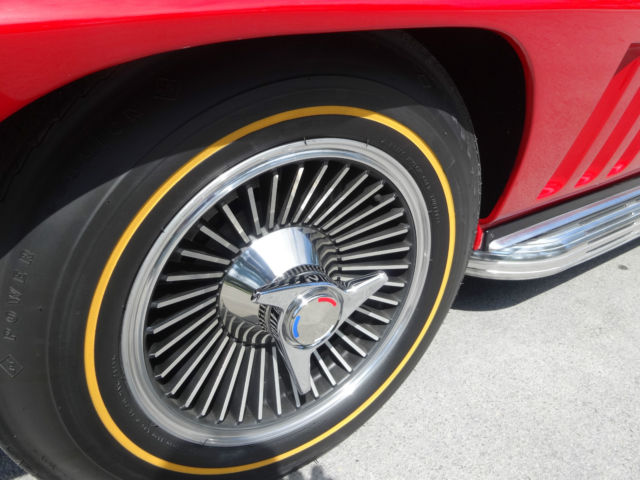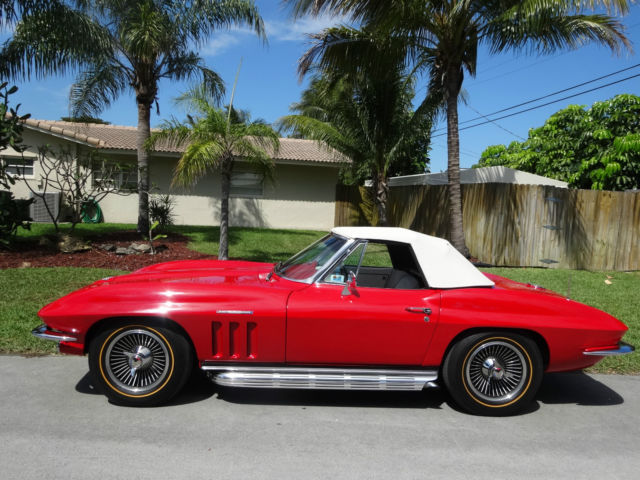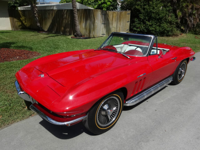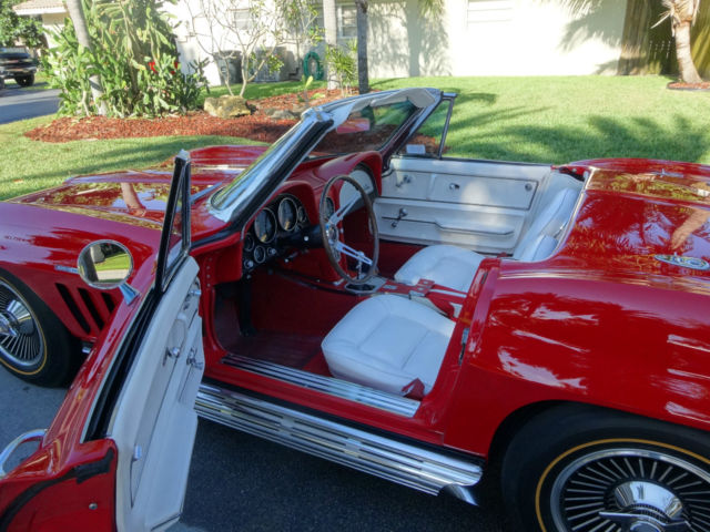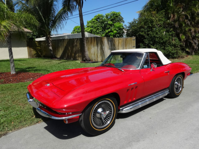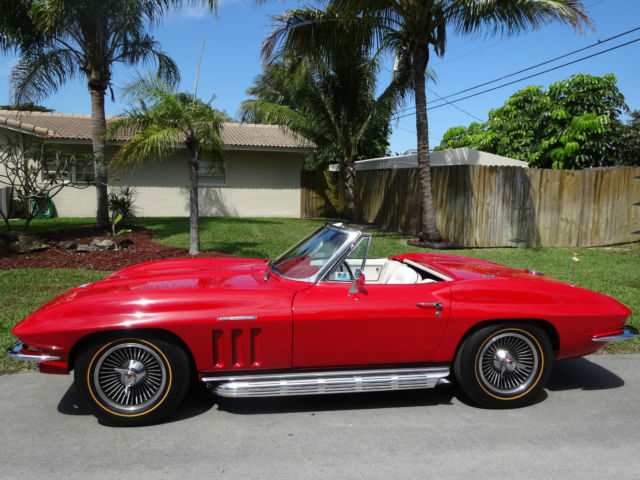 1965 CORVETTE Fuel Injected 375hp L-84, Correct HG Code Match #'s Engine, 4 Speed Muncie Close Ratio Transmission with 4:11 Posi Rear End. This car has Rare options especially for an L-84 that allow you to enjoy driving it if you chose, Power Steering only 3236 out of the 23,564 1965 Corvettes built had Power Steering which feels great compared to manual (your wife will love it...LOL) and that's with its new 7.75/15 Gold Line Power Cushion Goodyears mounted on Aluminum Knock-off Wheels. Another Rare option was Power Disc Brakes only 4044 had them. The 65' Corvette was the first year for Disc Brakes and the last year for the Fuelie, so to have Power Steering and Power Disc Brakes is very rare to say the least out of Only 771 Fuel Injected cars that were built! The L-84 375hp Engine Option cost $526.60 which was the most expensive engine by almost double compared to the Big Block 396 which was $286.45 in 65'. Other great Options Am/Fm Radio with Power Antenna, Side Exhaust, Teakwood Steering Wheel. The Body on this Car is Laser Strait and has great paint in Rally Red, Beautiful MINT White Bucket Seat Interior with Clear Factory Floor Mats, New DC 12 Delco Battery and White Convertible Top. This car has approx. 6000 miles since a Frame Off, I believe it was completed approx. 5 years ago. The car has not been offered for sale in over 10 years. The car also comes with a set of Radial Tires. This is a very special car that can be driven and enjoyed while it appreciates in value. The Hagerty Value for a #2 Car with its options is more than the asking price... It has a Clean Florida Title, I am a Dealer and must collect Sales Tax in Certain States. It is Sold with No Warranties or Guarantees, all Information Believed to be True and Accurate with No Guarantees Implied. I may be reached at 954-234-RACE for any other questions or to set up an appointment to see this Awesome Corvette.