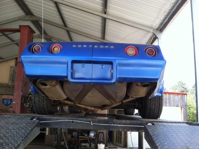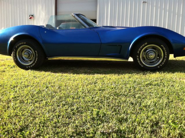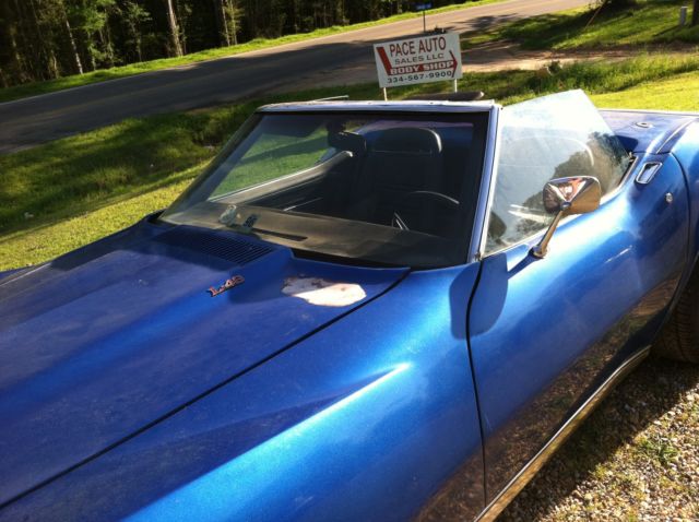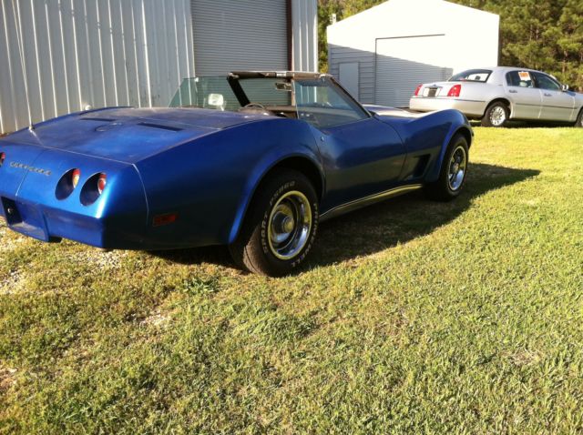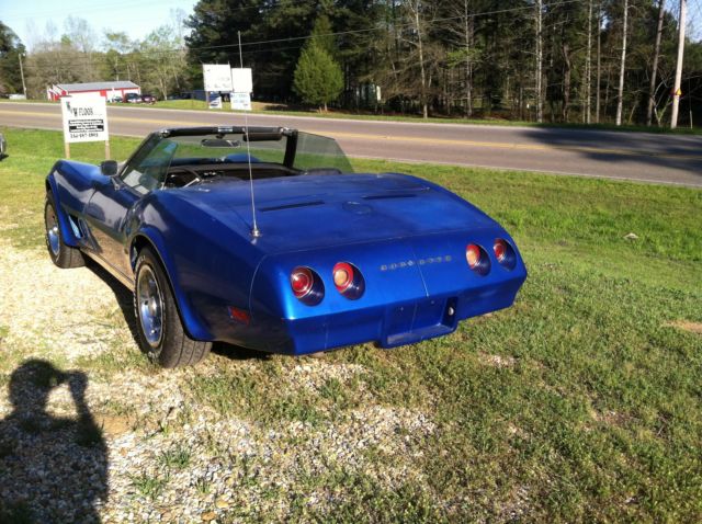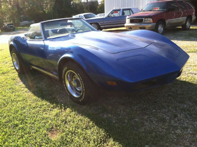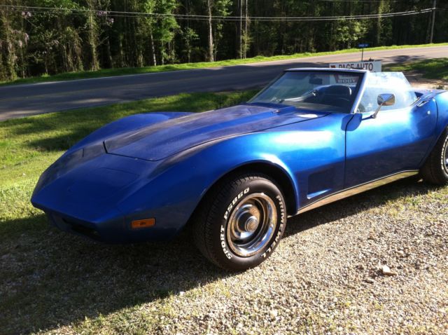 1974 Corvette Stingray 4 Speed Convertible A/C car with power windows-in process of restoring. Very good Body with no rust in frame. Car is drivable as is and restore as you can. Motor is not the original but of the same era. Has a Malory electronic distributor and aluminum elder Brock intake. Has a nice loping cam. Proâs Has Brand New Tires New Brakes-including (4) calibers, brake power booster, master cylinder, front lines and turned rotors. New Carburetor elder Brock 500 series, fuel pump, lines, and filter. Has new exhaust. Includes New Post rubbers, carpet kit, and extra exterior door handles. Cons-Needs new top but frame is good. Seats are o.k. but show some use. This is a power window car but it will need switches. Power steering not working as it should. Body is good-worse spot is on hood see pictures. Headlights will need new vacume lines I am selling this car for a good friend who is not computer friendly. If you have questions I can get yaâl hooked up to get the answers. He has been working on this in his spare time and money and has put a previous project (72 Duster) behind and he wants to finish it. Alabama does not have titles on cars of this age but you will be given the current registration and bill of sale from my friend.