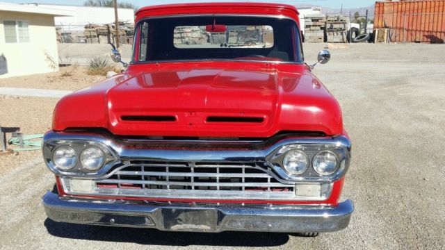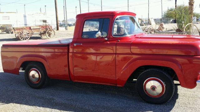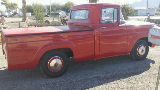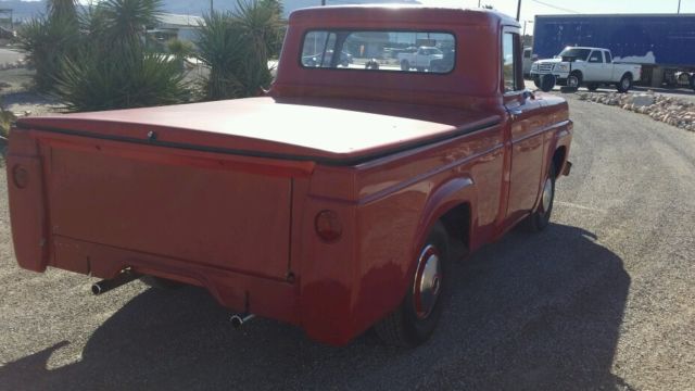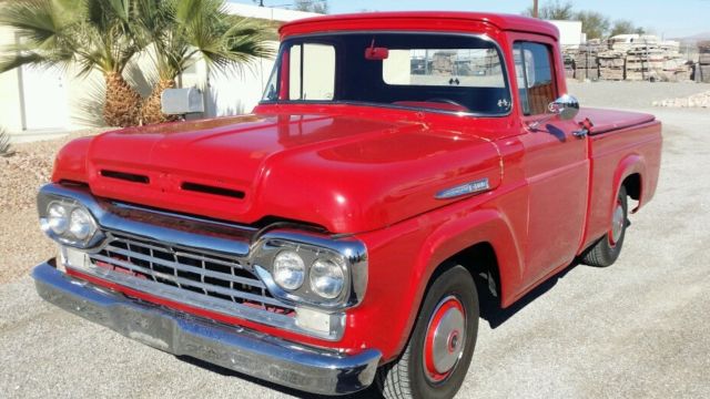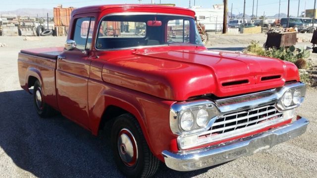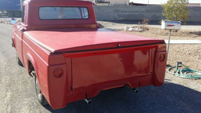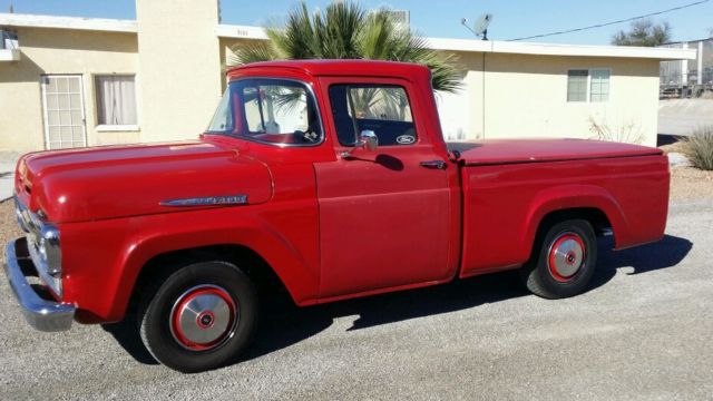 1960 Ford Shortbox Pickup -Street rod, runs great and is ready to drive -Short box/ half ton -Stock suspention lowered -350 v8 sbc block number 3970010 -Runs and sounds great, no noise or smoke, unknown miles -Edelbrock intake and carb -350 turbo automatic tranny -B&M ratchet shifter -Older build so the paint is chipped and sunbaked -Cd player with system in the back, needs a little work -Flip down dvd player -Power windows -Power brakes and steering -Good glass, 1 vent window has a crack -Good tires -Nice chrome grill This is a nice driving truck, jump in and go. It doesn't need anything to drive today. The headlights and other lights all work. The speedo does not but you can use gps. It cruises very good and is easy to drive with the power steering and brakes. Very sharp looking truck with the short box and lowered stance it gets lots of attention when filling up. Interior is very nice. As you can see in the pictures the box cover lifts up and is finished inside. If you have any questions or for a shipping quote call me at 218-234-1866 Truck is located in las vegas Nevada. I reserve the right to end the auction early for a local sale.