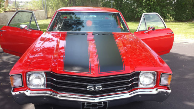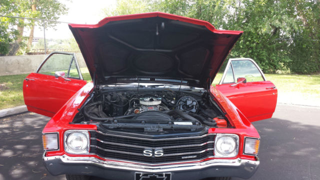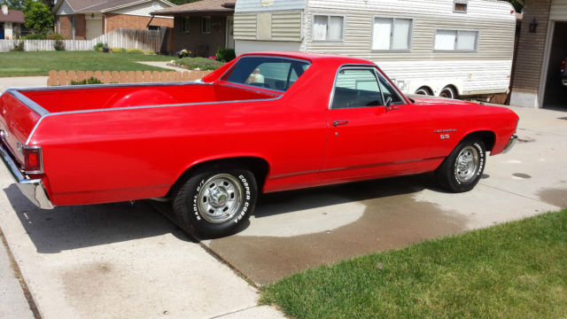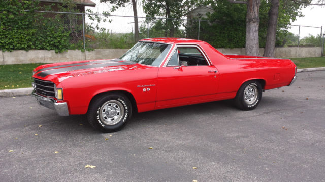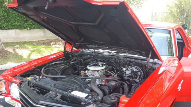 1972 El Camino SS True Muscle Car Total Frame on Restoration Numbers Match Original 350 Engine rebuilt to 383 with less then 200 miles on rebuilt engine Rebuilt Turbo 350 Transmission Edelbrock Carburetor Automatic Transmission Shift Kit for racing Duel Racing Exhausts 5.7 liter Automatic three speed Cooper Cobra Tires Viper Red Custom Paint Black Interior This 1972 El Camino car came from California and was owned by a friend who passed away. It was given to me in bad shape, I decided to restore it into a show car and after two years and a ton of money here it is. If you are a fan of the Chevy El Camino SS this car has been restored with a lot of $$$ and Love.  The car has never been hit and the body work on the car was not done with putty, we spent the time to do it right.  I am selling the car because it is too much of a car for me and with all the extras we put on it its too powerful for me to drive around.  It has been garaged since the restore and is a real eye catcher, as you drive down the street people yell at ya! LOL This is a True Muscle car and Show car I have listed the things that are not working, it doesn't have, and needs to be worked on. Please contact me for more information if needed