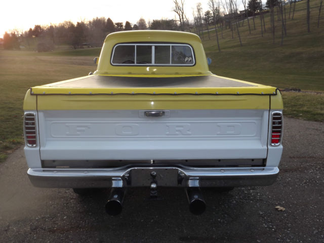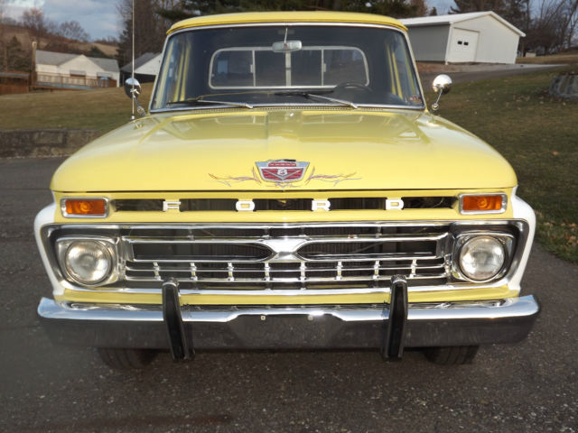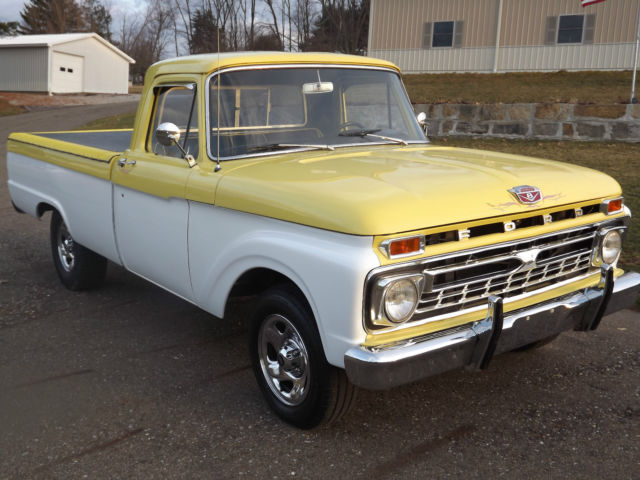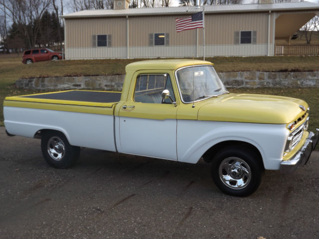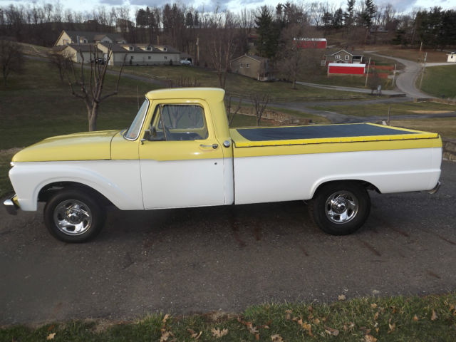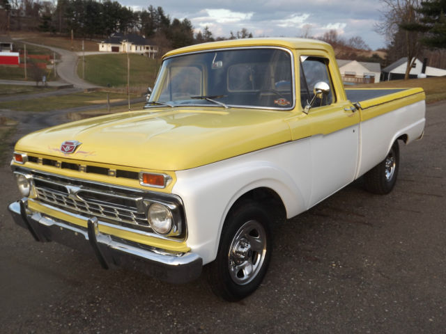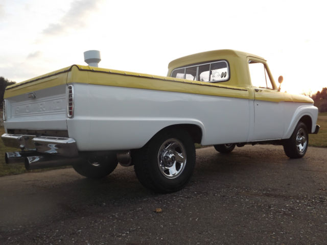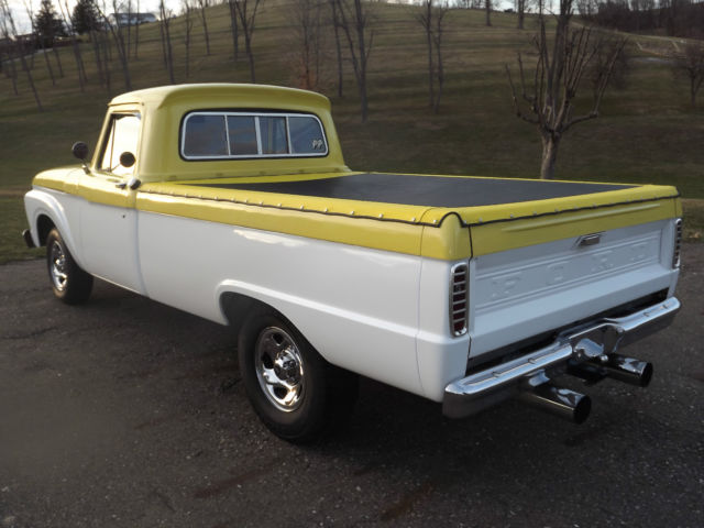 -1964 Ford F100 2WD Pickup Truck -Healthy 302 engine with high rise tunnel ram type intake and Holley Carburetor -Automatic 3 speed transmission with B&M shifter The truck appears to have been originally built in the late 1980's or early 1990's. The truck is not perfect but still presents well. The body has no major rust but has a few small spots (see pictures). There is some bubbling on the upper portion of the passenger door and on the cab above the doors (see pictures). The chrome presents well. The interior looks good and is comfortable. There are no tears in the seat. The glass is all good and the side glass has had custom etching. It has a spray in bed liner. The truck rides on 16 inch chrome wheels. It rides nice and the brakes are good. The engine sounds great and runs strong, but it is cold natured. The engine carries good oil pressure and does not heat up. The transmission shifts good but does have a leak if it sits for a length of time. The fuel gauge does not work. This is a nice truck and the pictures speak for themselves, but it is not perfect. The truck will not leave our possession until all funds clear. Thanks and good luck. Please email with questions.
