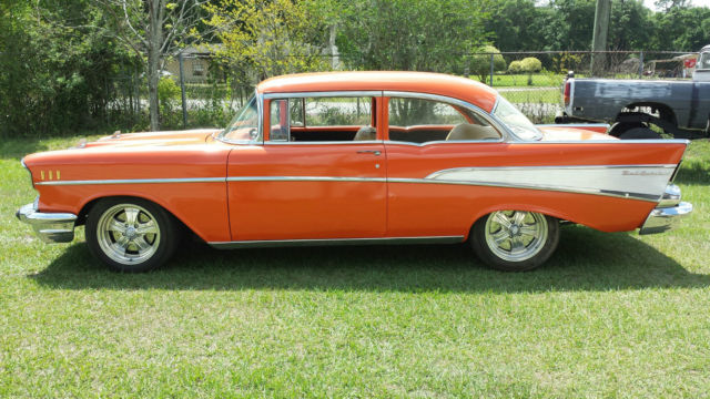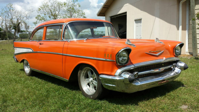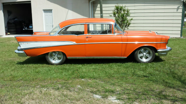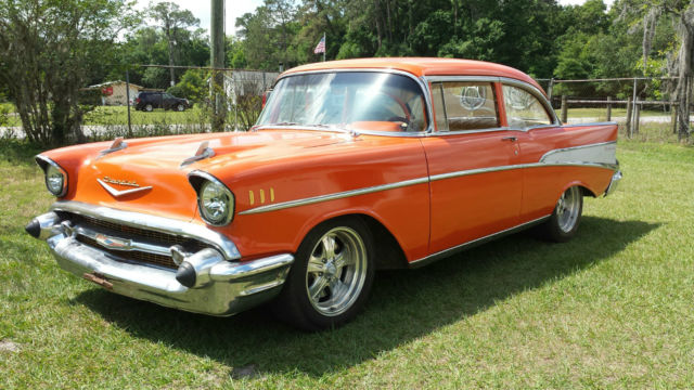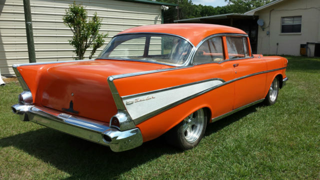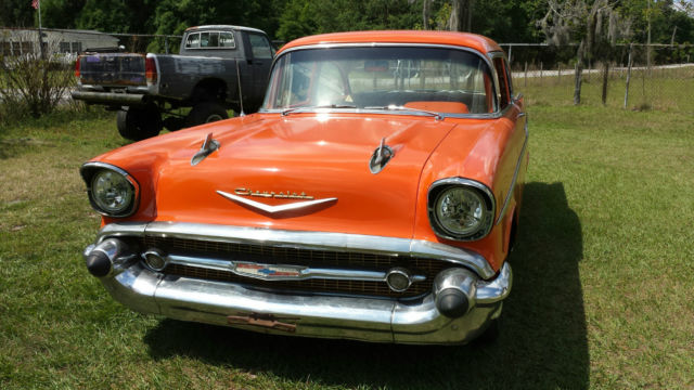 1957 Chevy Bel air 2 dr post The car has a great running 327 with nice thumper cam, aluminum intake and Holley duel feed carburetor. The transmission is a 700R4 overdrive, the rear end is stock. The car has a 2nd Gen Camaro front clip so it sits very nice and low with power steering and power front disc brakes. The car was built many years ago so it will need to be repainted as it's starting to show it's age lots of touch ups and imperfections. The stainless trim is still nice and most of the chrome is ok, just starting to show some bad spots. The car does have some rust to repair the floors have been patched from the top and the old rust was not cut out and some of the braces are rusted. The trunk pan was replaced years ago and around the edge where it meets the inner wheel house was never caulked properly. The rear drop off is also rusted where it meets the rear pan. These are common area's and easily repaired. The last owner passed away and was in the middle of replacing and door glass and the family lost the drivers door panel and garnish molding. The passenger door glass and rear both should be replaced as well. The windshield and rear glass are good. The wheels are Boyd Coddington 17" with good tires. The exhaust is flowmaster and it sounds very nice. The car runs and drives good but I would consider it a project as it will need things done to it. You could just replace the glass and door panel and drive as it is to your local shows if your not worried about winning a trophy. If you wanted a show winner it will need to be redone again. If you have any questions please give me a call at 813-478-3449. The car is sold as-is with no warranty's, buyer must pay all shipping charges but I will help on my end, I will ship world wide to over sea's buyer. Buyer must contact me within 12hrs to arrange payment I do not need a down payment. The car is from Alabama and come with a tag receipt and bill of sale to obtain a title in your state. I reserve the right to end the auction at any time if the car sells locally.