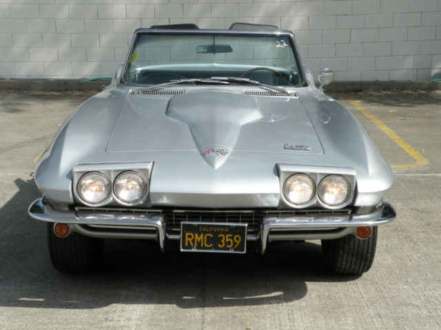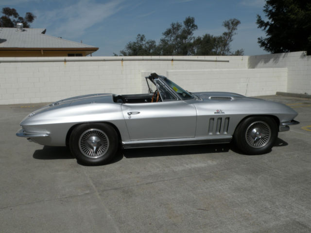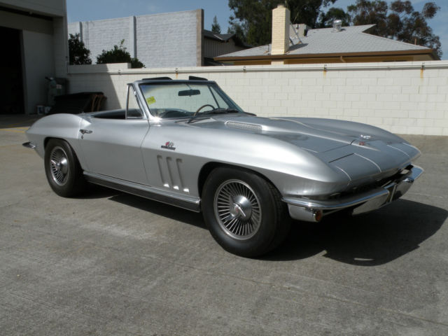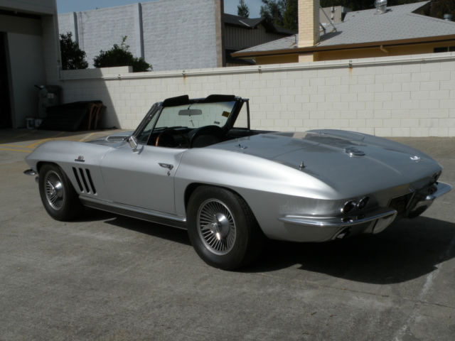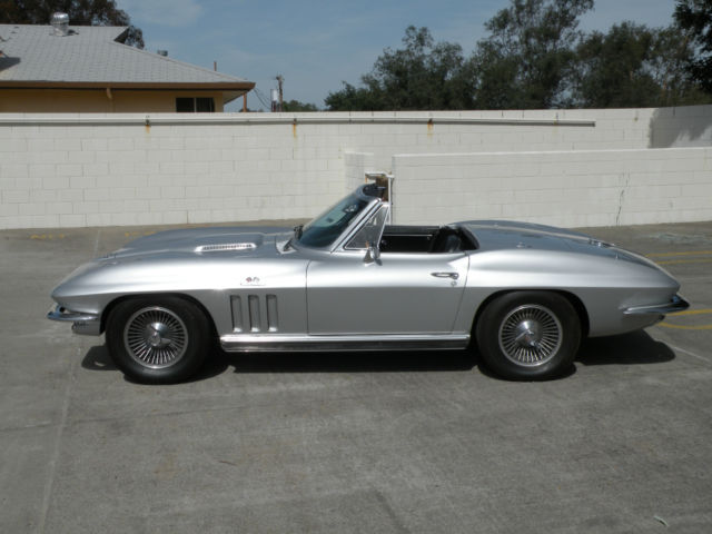 Our Beautiful 1966 Chevrolet Corvette Roadster is wearing Silver Pearl paint code 986, Black leather interior trim code 402, Teak steering wheel and original Knock off wheels including matching spare. This vehicle was purchased new by a Dr. from Val Strough Chevrolet, Oakland, CA. Original Protect-O-Plate and Retail Buyers Order sheet (please see photos) that shows accessories to include âBlack Leather Trim, 4-Speed Transmission, Wood Steering Wheel, Knock on Knock off hubs, Tinted Windshield, P.B AM/FM Radio, Transistor Ignition, Positraction, 425 HP. V8. â This is a great example of a high HorsePower Roadster that is sure to go up in value. The automobile has been part of the current owners collection since 1978, during which this car has been stored in climate controlled showroom/shop. I recently checked all fluids and topped them off, added fresh gas to the tank and this car started right up with no problems. I drove the Roadster throughout the showroom and parking lot to take the pictures you see here along with (173) pictures available at your request or click on the slide show below for direct access to the web album. All systems should be checked prior to regular use of this car. This car is sold AS-IS WHERE-IS with NO WARRANTIES WRITTEN NOR EXPRESSED. ALL INSPECTIONS TO BE DONE PRIOR TO BIDDING. This car is located in Los Gatos, California for any inspections. Please email with any questions. View all Get your own