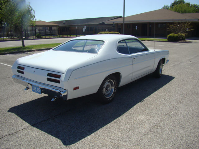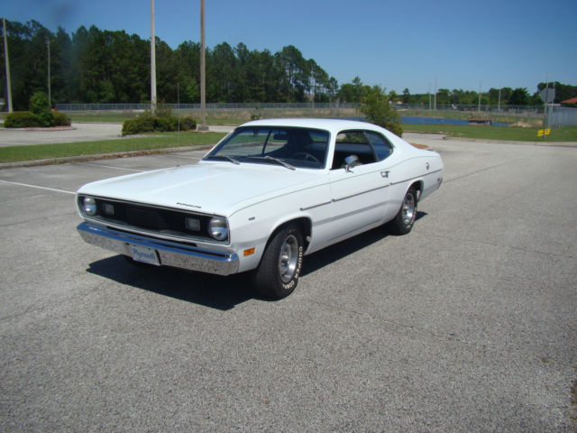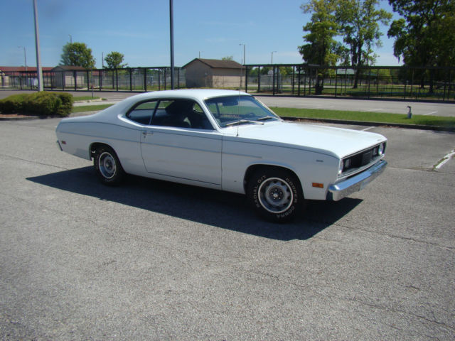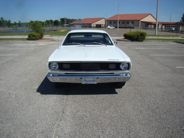 Up for auction is my 1971 Plymouth Duster. This is a very clean very original very stock Duster. The only reason I'm selling this car is because I have two cars and only enough room for one. This is by far the better car but if I keep it I know I'll end up turning it into a bracket car. It has a 318 2 barrel left completely stock. Previous owner said that the heads have been rebuilt with hardened seats added for unleaded fuel. Engine runs perfectly. 904 automatic trans works exactly as it should. Has 7 1/4 rear diff open with 276 gear. Everything works as it should in this car, speedometer, gauges, heater, lights all work fine. Car has power steering with manual drum brakes. Interior looks to be mostly original in very good shape. Has small cracks in dash pad and a couple small tears in head liner. Seats look to have been recovered at one point. The under carriage of this car is awesome. Not a heavily undercoated car, only the wheel wells are undercoated. All original floors and trunk pan in great shape with only light coating of surface rust. I've owned a lot of these cars in the past 30 years and this one is one of the cleanest underneath. Very nice car to leave as it is and enjoy it or would make a great 340 clone car. The bottom of the rockers, quarters, and fenders from what I can tell, have never had any rust repair. This is a really nice A body that can be enjoyed for years to come. The car was originally gold but it's been repainted white. Paint is okay but has small nicks and scratches. Looks great for a driver. Chrome is in good shape. Rear bumper just starting to show a little pitting but still looks decent.