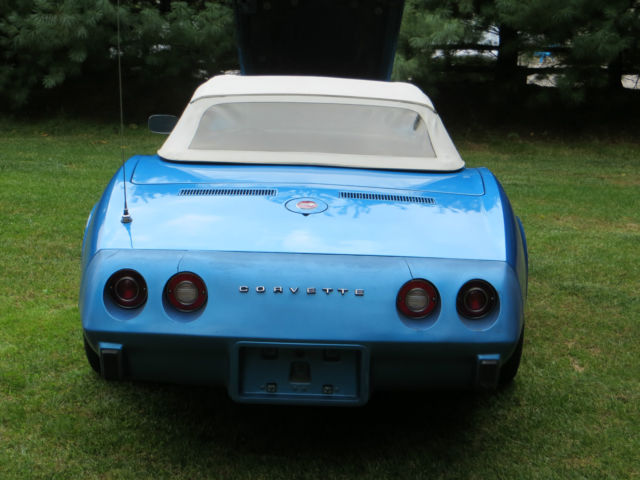 Fantastic opportunity to own a rare, collectible Corvette that is only going up in value. This is a rare low mileage 1975 Corvette convertible optioned with an L82 engine. One of only 36 6 made in 1975. It has 26,900 actual miles. The car was purchased new in 1975 in Massillon, Ohio. The paint is mostly original. It was touched up by the dealer in 1975 due to a poor factory paint job. This was a common occurrence with GM in the 1970's. The radio is original and had had an amplifier installed to make it sound better. This car has always been stored indoors, and never driven in rain or snow. This is a rust-free numbers matching numbers car has the following options: L82 engine 4-speed close ration transmission Power Steering AM/FM radio Power Windows Dual Horns Gymkhana Suspension Deluxe leather interior High altitude axle White convertible top This car in is great shape. It will need some minor TLC to be a great cruiser. The bumpers are original and have begun to crack due to age. The exhaust is not original and will need to be replaced. The tires have good tread but are older and should probably be replaced for safety. I have the original order form from the dealer when the car was ordered in 1975. Below is a link to the car's C3 registry page that was put together by the third owner. It documents some of the car's early history. I am the 5th owner. http://www.c3registry.com/index.php?job=ShowCorvette&car_id=10313 Here is a link to lots of pictures of the car. http://s942.photobucket.com/user/1975greenconvertible/library/Blue%20L82 Email any questions. Cash sale.