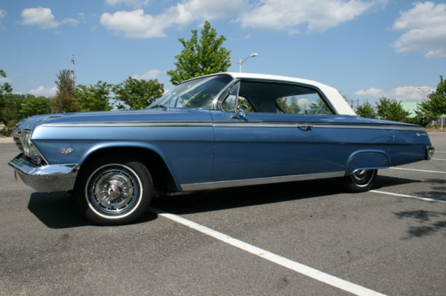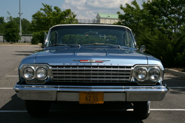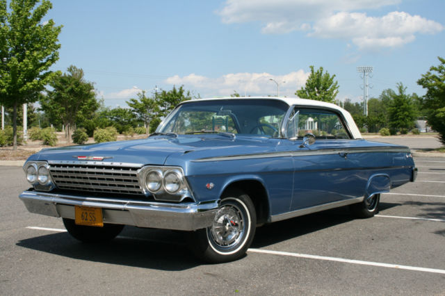 1962 Chevrolet Impala SS Hardtop. I have owned this car since my father bought it new in September 1962. Car had been an everyday driver until 1992 when my dad and I garaged it and began a full restoration. The engine was overhauled, Posi rear end installed but my dad passed away before we could finish the project. Car was in storage from 1995 to 2010, when a full restoration was begun. Spent over $50K to bring this Impala back to life. Extreme care was done to restoring to original stock condition. Interior was refreshed with new seat covers, door panels, carpet, headliners, rear fender skirts, dual rear speakers including satellite radio hidden in glove box (still has original working AM transistor radio). Exterior was stripped to remove rust, then repainted to original Nassau blue but two toned with white top. Powered with original 327/250hp V-8, power steering, power brakes, original 2 speed Power Glide transmission (has small leak, will probably need some work or be replaced). Car runs great, has headers to compliment the dual exhaust. This Impala has no rust and is garaged. It has less than 250 miles since restored 2 years ago. The frame is excellent, lines are straight. Please look at pictures carefully, which shows before, during and after views of the restoration. Have the money to back up your bid, and permission from your significant other to purchase a car. Also, Buyers will be responsible for pickup or shipping. We will not negotiate the price of the vehicle to cover shipping as the vehicle is listed at fair market value. The vehicle will need to be picked up within 14 days after end of auction.  A $1,000.00 deposit is required within 24 hrs of auction end, or car will go to next bidder, or be re-listed.  Full payment will be needed within 5 days after the end of auction. Only accept PayPal,cash or bank wire. This is a great beautiful car. This vehicle is being sold AS IS, No Warranty Either Express or Implied. Good luck bidding, and PLEASE ASK ANYTHING YOU NEED TO KNOW. We are happy to provide additional photos and/or video upon request. I have 100% positive feedback and want to keep it that way. Please call Dean or Pam with any questions 804-651-5908 or  757-784-7248. Good luck bidding!