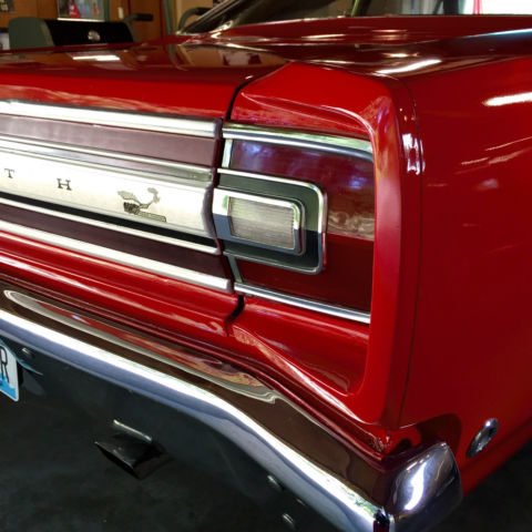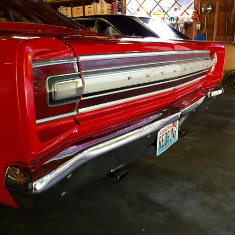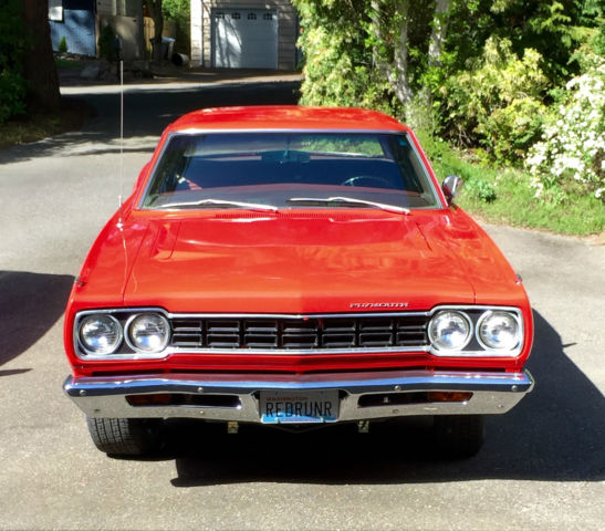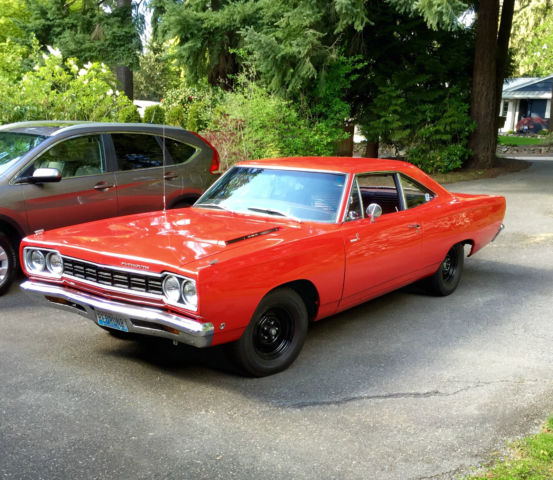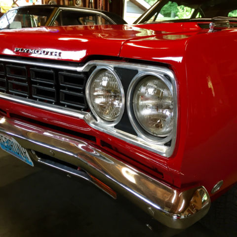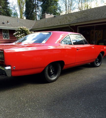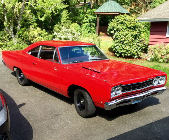 1968 Plymouth Road Runner survivor (1st year made), factory red-on-red car Color: Cardinal Red (original color was "Matador" red, engine bay and some other areas still carry original paint) Original "Metallic" red interior Original, strong running, numbers matching 383 Commando motor 727 TorqueFlite transmission (from 1970 Plymouth 'Cuda 440), column shift Original 323 geared 8 3/4 rearend; brand new axles (originals come with car if buyer wants) All lights and gauges and radio work as they should Factory dash tachometer car, upgraded with restoration tach to go with electronic ignition (original tach comes with the car) Original fender mounted "bullet" turn signal indicators (fully functional) Original rims powder-coated black with "acorn" chrome lug nuts; original hub caps come with the car New Magnaflow mufflers and correct exhaust tips Car runs and drives superbly, has been lovingly maintained and cared for Original sheet metal, only minor surface rust in trunk Local buyer (greater Seattle area) can drive it home Out of state buyer will need to arrange for appropriate transport at their expense Parts that come with car: Spare road runner "pie tin" for air cleaner (original is on car) Brand new rear chrome piece with decal still in box (original piece is on car) Collection of road runner garage signage and laminated wiring schematic Owner's Manual Vintage Chilton's service and repair manual Full receipts come with the car for restoration work that seller has had completed, including: - New fuel tank, sender unit, etc - Front suspension overhauled - Brake hoses replaced - Front and rear wheel bearings replaced including grease seals - New front and rear hardware kits - New rear axle - New parking brake cable - Carburetor rebuilt - Full engine tune up - New distributor - Electronic ignition - New engine mounts - New transmission mount - Bulbs and lamps replaced - New dimmer switch - New brake master cylinder and service - New upper and lower ball joints - Steering box overhauled - New sway bar - Full transmission service - New dash circuit board and service - Mopar Performance aluminum valve covers - New thermostat - Original radiator recored and serviced - New water pump - New restoration red-cap battery and tie-down - New Beep Beep horn (original comes with car)