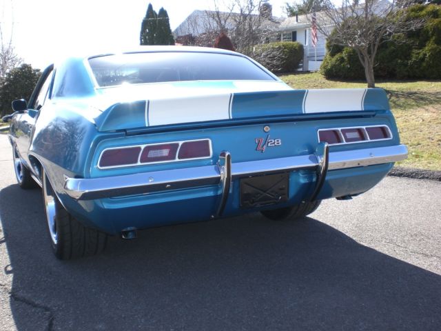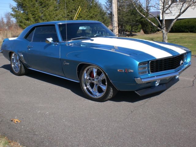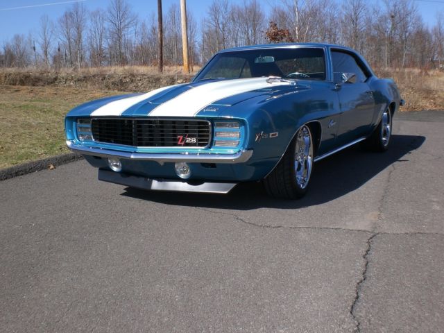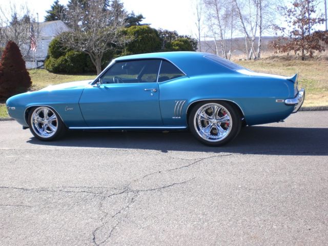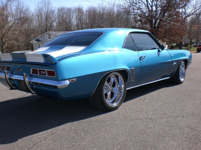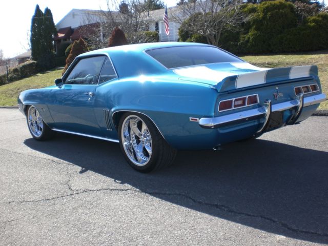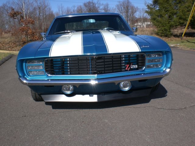 1969 Camaro RS Z28, (Original Factory Z28 Car), High End Pro-Touring Build LS1, 450hp, 6-Speed, 14â 6-Piston Wilwood 4-Wheel Disc Brakes, 18â Custom Made Foose Wheels, Fat Man Front A-Frames, Ride-Tech Coil Overs, Detroit Speed 4-Link Rear with 12-Bolt 4:. 11 Eaton Posi , Moser Axles, Polished Aluminum Drive Shaft, Detroit Speed Mini Tubs, Global West Sub-Frame Connectors, 2. 5â Magna Flow Exhaust System. All Billet Polished Hinges, Lights, Mirrors, Handles, Door Seals. Custom Super High End Interior (Featuring Real Stingray/Leather Seats & Real Alligator full length console) Custom Kenwood 9-Speaker Sound System, Custom ORACLE Head Lights, LED Interior Lighting, Door Seal Lights. The List goes on and on! Pro-Touring 1969 Camaro Z28 Rally Sport. As stated above, this Camaro is an original factory Z28 carâ¦however it is about as far from a stock Z28 as you can get at this point. This car was professionally built with performance, durability and comfort in mind. There was meticulous attention paid to every little detail and it shows. The car is complete and it runs, rides, drives, handles, brakes, sounds and looks excellent in every way. The Lemans Blue paint and body is a knockout and the stance is perfect. The headlight doors are electric from Detroit Speed with Oracle LED headlights with remote to turn on the blue LED lights around the headlight . The rear tail lights are LED as well. The 18â Foose wheels were custom ordered and they have new Nitto tires mounted on them. Everything is new including glass, trim, down to every nut and bolt. The Interior is high-end custom designed from Daveâs Custom Interiors in Morgantown. N. C. The double stitched black leather seats and headliner are finished off with genuine Stingray skin inserts and the full length genuine alligator center console continues all the way up to and on the package tray. The door panels are finished with stainless studs. It has power windows and a killer 9-speaker sound system mounted behind the custom truck panel. It has a black and chrome custom steering wheel, custom dash and gauges, dash mounted ignition switch, custom console gauges, window switches mounted on the console and hidden sound system controls inside the console. The AC blows cold. The engine bay and the LS1 motor are finished off to show quality as well. The firewall is smooth and it has a custom radiator support cover. March pulleys. Billet Specialties custom valve covers and polished billet parts everywhere. The transmission is a T-56 6-speed. Itâs not cheap but the best never is! In order to really appreciate the quality of this Camaro you really need to see it in person. The car has been driven 977 miles on perfect weather days only. Draws a crowd no matter where you go. Simply amazing build on a drop-dead gorgeous 69 Z-28 Pro Touring Camaro! Feel free to call, 570-383-7506