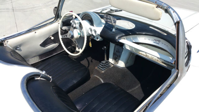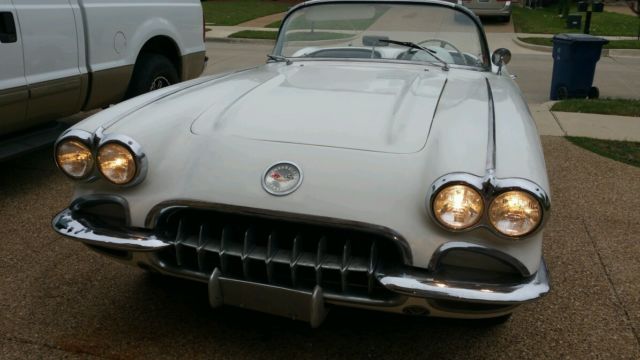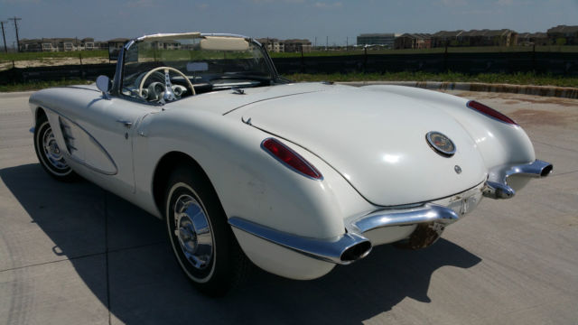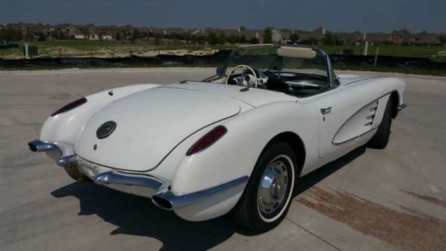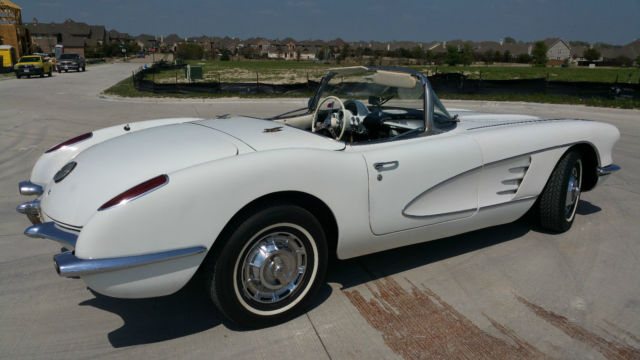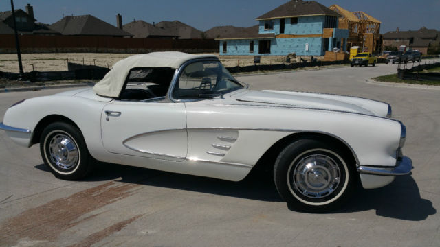 1960 corvette Convertble, simply beautiful..... N.O.M 283ci v8 I do have a date correct engine BLOCK that will be included with the car 4 speed runs great, starts up with a pump of the gas pedal, may need a carburetor adjustment seems to run rich seats are in great shape carpet is in great shape dash in in ok shape could benefit with a fresh coat of paint and a re-cover with vynil. all gauges seem to work The speedometer needle is not working good convertible top and clear rear window all glass is in nice shape all lights work Breaks work well has the original wonder bar radio, does not work No rust Paint is old and should be done again. has imperfections, chips, scratches etc chrome is in original shape I would re-chrome looks to have had fiberglass repair done front driver side inner fender Overall a great car to put your personal touch on! Car is located in McKinney Texas Any questions please ask I can help with shipping also. Thanks!
