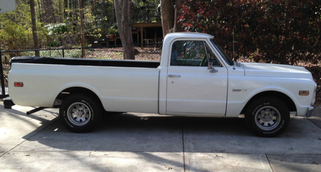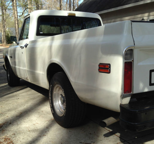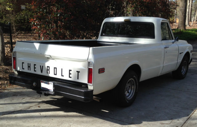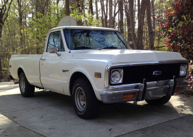 1972 Chevrolet C10 Custom/10 Deluxe Fleetside Power Steering, Power Disc Brakes Front and Rear, original 350 V-8 engine with Turbo 350 transmission, Air Conditioning (not functional) Amp-oil-temp-tach gauges. Truck was purchased new in Georgia and has been in GA and NC, only rust areas are in both doors and are visible in pictures. Rocker panels have been replaced in the past. Engine is freshly rebuilt an odometer mileage is what the engine has on it (6,270). Miles are not original. Truck is mechanically very sound, paint/body is worn with small scratches and chips but everything works, tires are new and the following were replaced with the full engine rebuild: Radiator (4 core) HEI Distributor Water pump Holley 4 barrel Carburetor w/electric choke New heads, Pistons, Rings, bearings, oil pump, camshaft & Cam bearings, timing chain & Sprockets Fuel pump Wieland Intake manifold All hoses, fuel and flexible brake lines Valve covers and Air Cleaner Starter and Solenoid Drive shaft bearings and U- joints High Output headlights and relay kit Other updates include retractable shoulder harness seat belts, SunPro Tachometer, Valley receiver hitch with dual wire harness connector, Aluminum wheels, rear sliding glass, Grant steering wheel, spray in bed-liner with rubber mat and swivel tie downs, Dual exhaust, all Owners and Service manuals as well as receipts for all parts. Can see video on youtube: https://youtu.be/Agwg0bBUd98