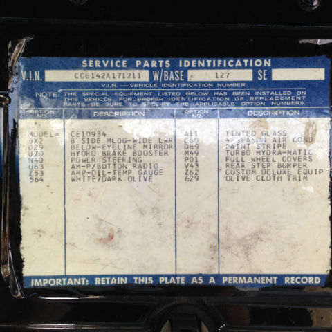 | VIN (Vehicle Identification Number): | CCE142A171211 | Year: | 1972 |