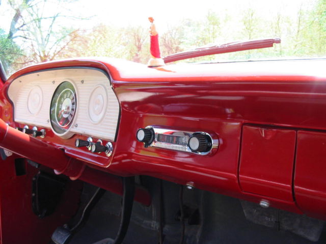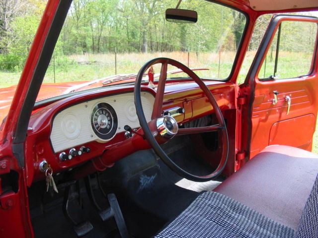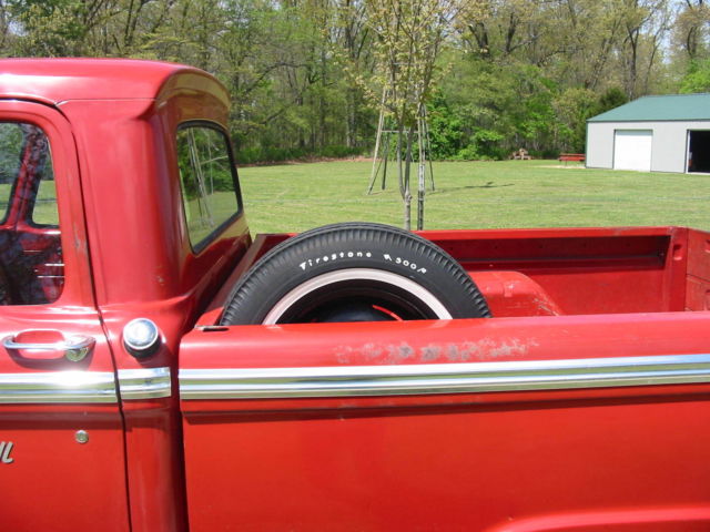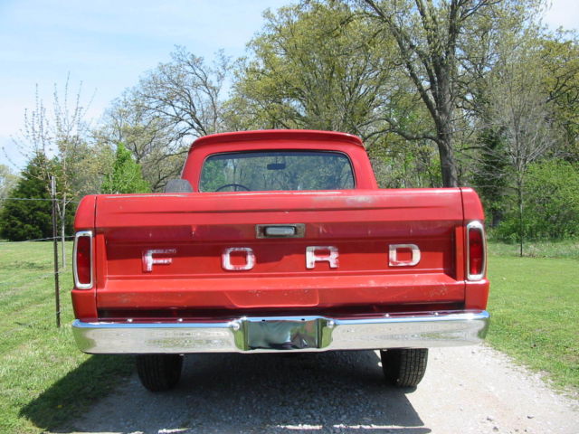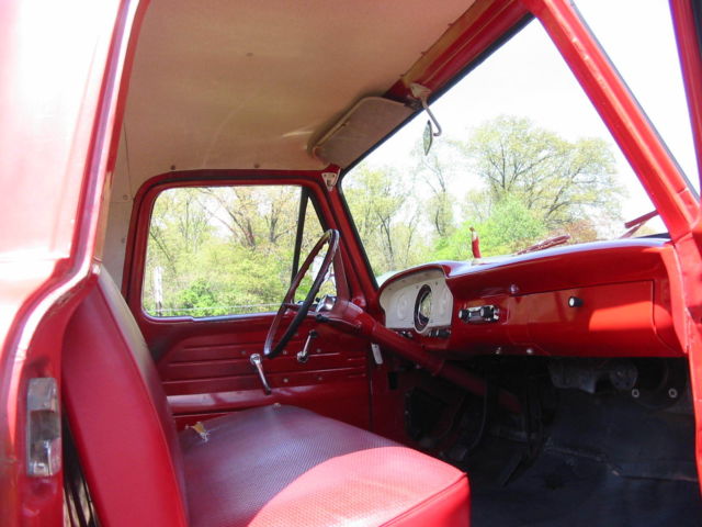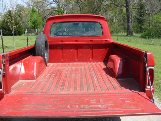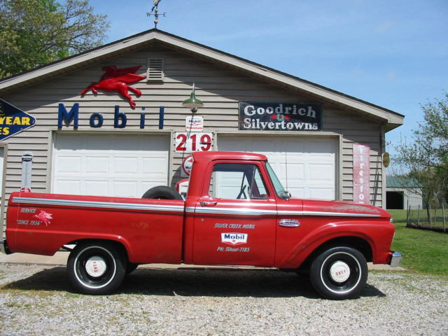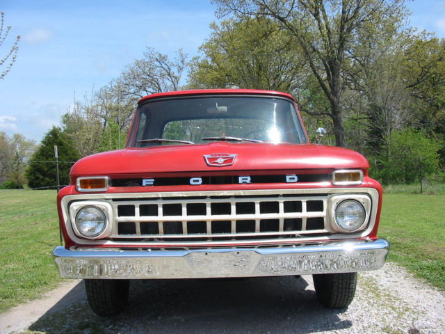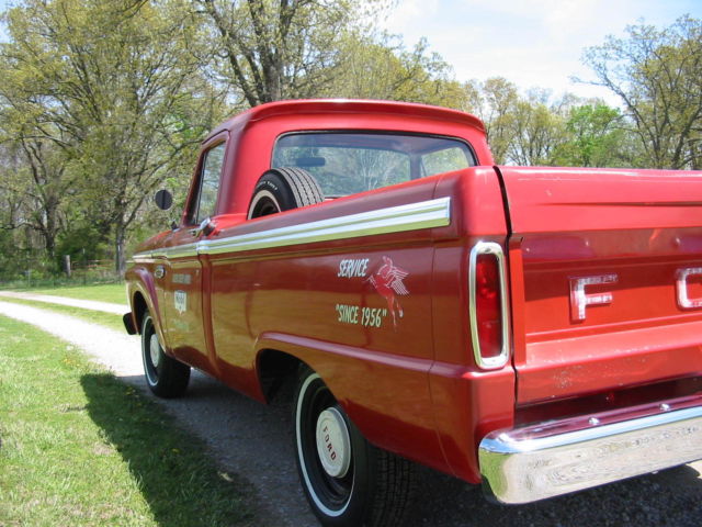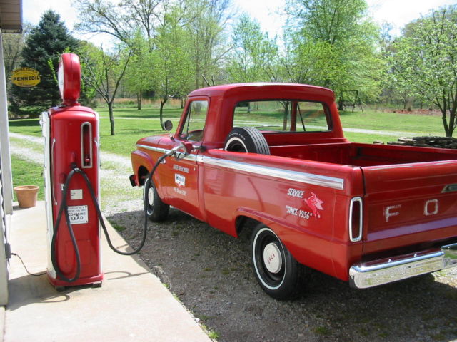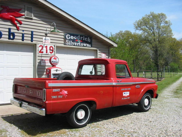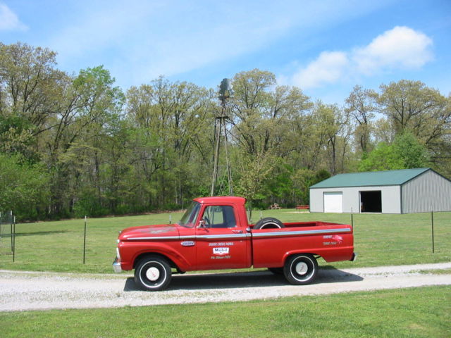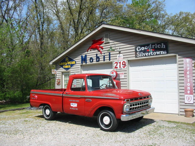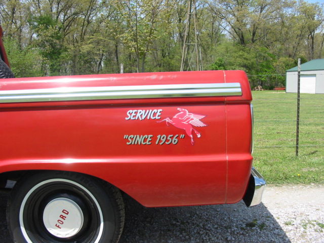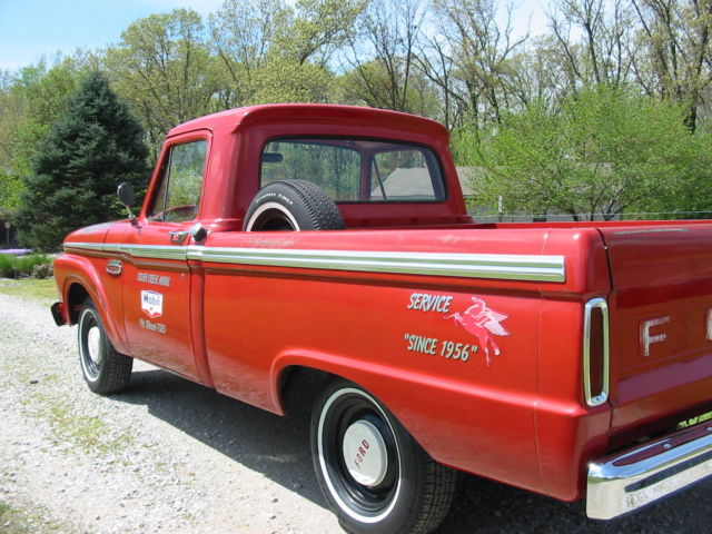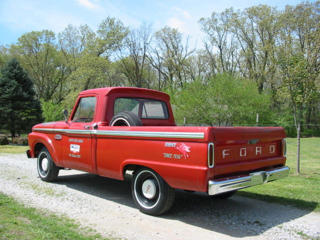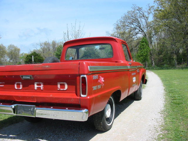 FOR SALE HERE IS A SUPER CLEAN AND ORIGINAL 1965 FORD SHORTBED F-100 PICKUP TRUCK. IT IS 100% FACTORY ORIGINAL EXCEPT THE TIRES, (BRAND NEW), BATTERY, AND OIL CHANGES. THE ORIGINAL RED PAINT IS STILL NICE FOR IT'S AGE WITH JUST THE RIGHT AMOUNT OF REAL PETINA....NO FAUX STUFF HERE. TRUCK STARTS, RUNS, AND DRIVES AS IT SHOULD. IT HAS A FACTORY RADIO THAT STILL PLAYS AND THE FACTORY FLOOR MAT AND HEADLINER ARE INTACT AND IN GOOD CONDITION. INSIDE OF BED IS NOT BEAT UP AND HAS NO RUST, CAB MOUNTS ARE SOLID. I'M A SMALL TOWN DEALER WHO BOUGHT IT TO USE AS A SHOP TRUCK BUT IT'S JUST TOO NICE FOR THAT SO IT JUST SITS IN THE GARAGE...AND I'VE DECEIDED TO SELL IT. IF YOU LIKE ORIGINAL STUFF, IT DOESN'T GET ANY BETTER THAN THIS. PRICING IS BASED ON WHAT I HAVE IN IT, NOT TRYING TO MAKE A PROFIT. IF YOU ARE TIRED OF LOOKING AT MADE OVER PHONEY JUNK...HERE'S YOUR CHANCE TO BUY AN UNTOUCHED ORIGINAL. SERIOUS BIDDER/BUYERS ONLY...IF YOU HAVE LESS THAN 5 FEEDBACKS OR ANY NON-PAYING VIOLATIONS...PLEASE MOVE ON. THANKS.