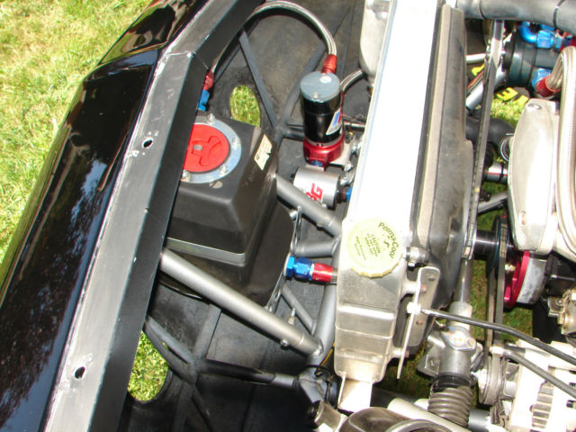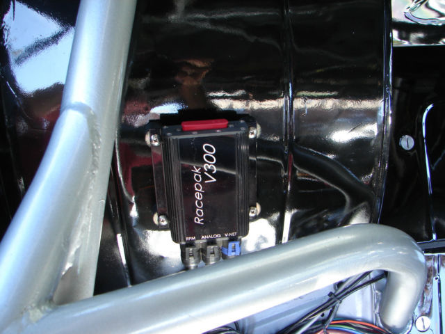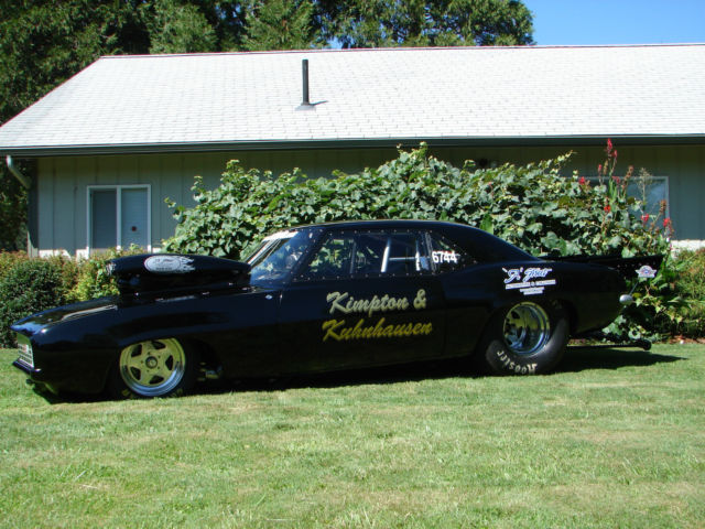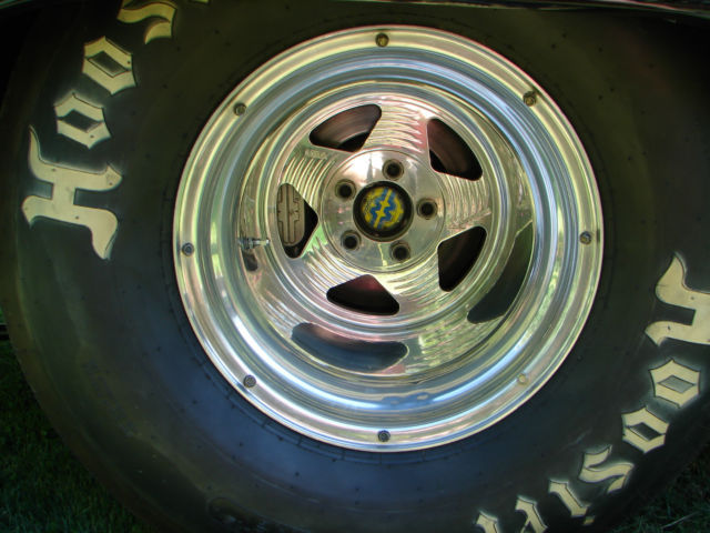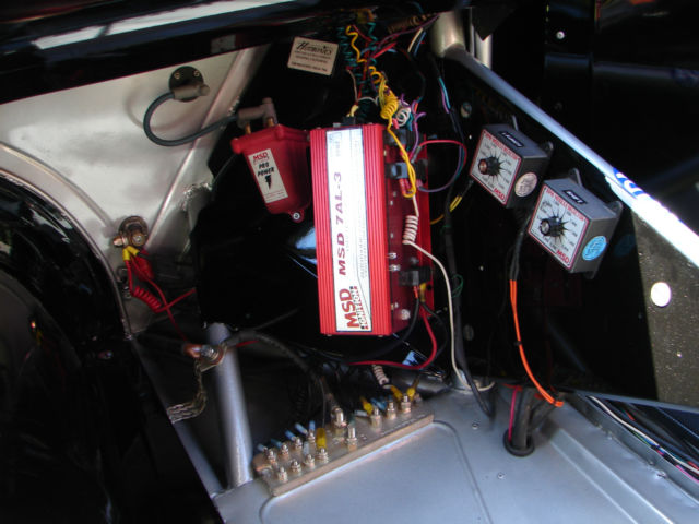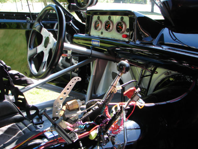 NHRA Certified Chassis 2/2015, Mild steel round tube with rectangular rear rails, Funny Car cage, Strange front struts, Koni double adjustable rear shocks, 4 link, anti-roll bar, 4 wheel disk brakes, Strange 9in with 4:10 gears, 35 spline axles, new Goodyear front runners, Hoosier Slicks 33-15/15 all mounted on Bogart wheels. Pat Musi 632 cid, Dambest Single dominator, Big chief heads, Titanium valves, Bullet 7-3 swap cam, Dart cast iron tall deck block, Callies Crank, Hooker Hi-temp coated headers 2 1/2 in primarys, Borla Stainless collector mufflers with custom side turn outs notched in the rockers behind the fenders (very clean look) MSD crank trigger, 7-AL ignition. Reid case Powerglide, Vasco input shaft, roller bearing output, Mark Williams steel driveshaft, transbrake, Case, flexplate all up to date on certifications. Racepack data recorder monitors: rear shocks, driveshaft, engine speed, hi fuel pressure, carb fuel pressure, transbrake, Battery voltage, g-force, lots of room to add more sensors. On board fire system covers the engine compartment and interior. This can be run with full electronics: Co2 throttle stop, air shifter and Biondo Mega 400 delay box or Nostalgia racing remove the electronics it is set up for manual shift, shift light, manual throttle stop override etc, Makes a great B/gas NHRA nostalgia car. Car is steel roof and quarters, the rest is fiberglass, fresh black paint 3 years ago, life got in the way of getting to use it. Pictures show lettering but we have removed it all and now just a perfect Black canvas for you to work with. Includes 2 racing suits: Lg and XL, 2 sets of shoes size 9 and 11, Also have 34ft ATC Aluminum trailer that would need to be negotiated separately.