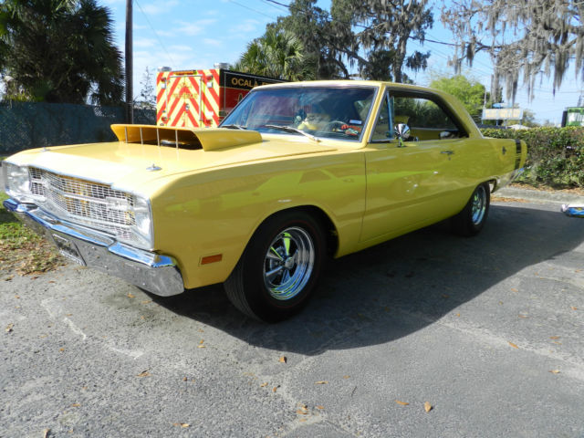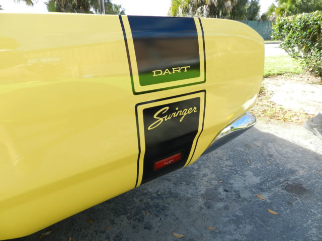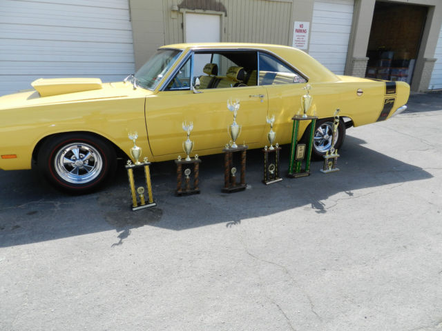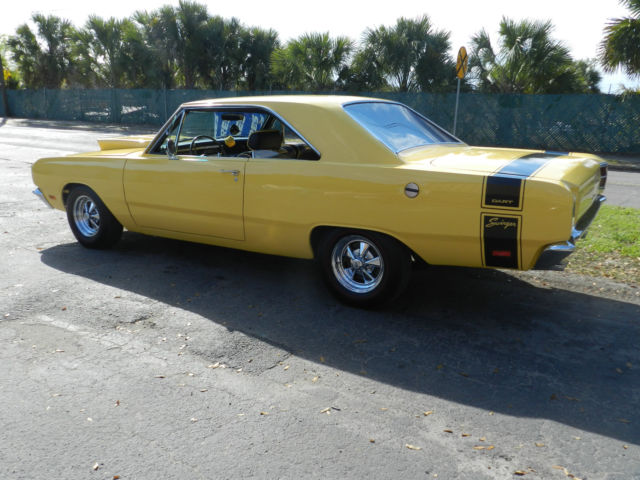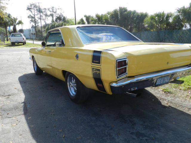 1969 Dodge Dart Swinger. Completely restored 4 years ago, this is the nicest Dart you will find anywhere. Originally a 340 4 speed car, it is now a big block 440 bored .60 over. Owner has owned this car since 2002 and a full restoration was done in 2011. Over $55,000 spent. Absolutely NO rust issues with this car anywhere. Just a few of the stats are: 10.5:1 Keith Black piston Edelbrock aluminum RPM heads Edelbrock Hi-rise dual quad manifold with two Edelbrock Endurashine 500 CFM Carbs Wizard Cooling radiator with polished shoroud Lunatti 507 Voodo cam Kelsey Hays front disc conversion Rear brakes updated to B body All new PST suspension Moser heavy duty axles Cragar Mags Motor was professionally built. No backyard mechanics on this one. Never dyno'd but should be 500 plus horsepower. Never raced. Runs and drives as nice as it looks. Motor runs cool and has been driven about 2,000 miles since restoration, mostly to and from shows. A real trophy winner as you can see from the photos. Car was featured in a National Magazine. Car is not a trailer queen but has not been used as a daily driver either. This is a true show car in every sense. Completely finished and needs nothing, this car stays in a garage and the paint is just like new. https://youtu.be/cNlUIKZ-P9U to see and hear it run.