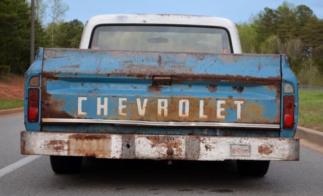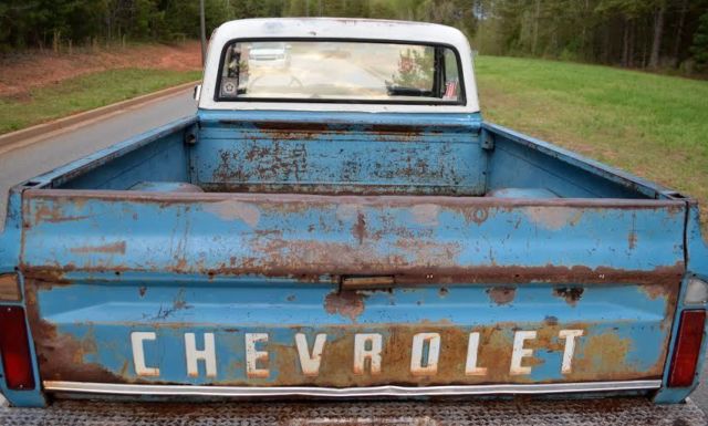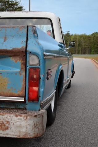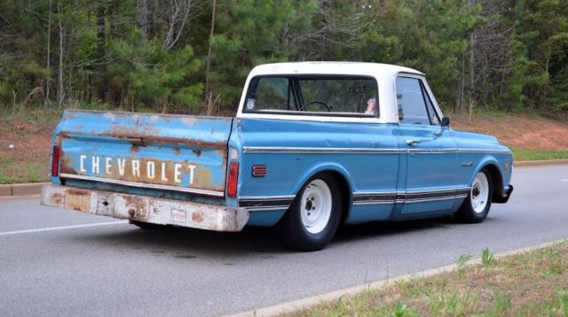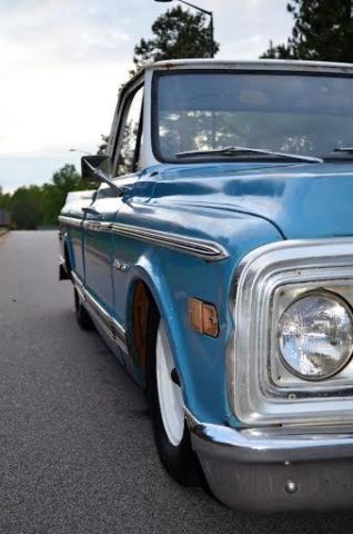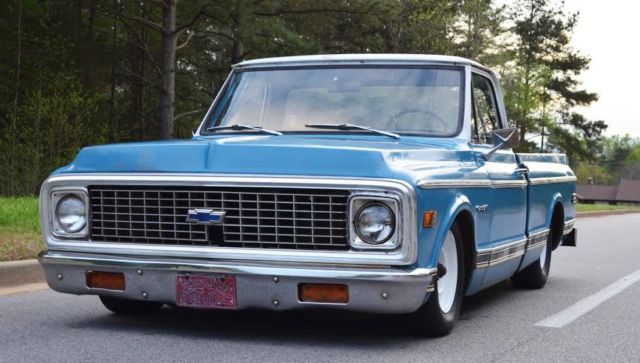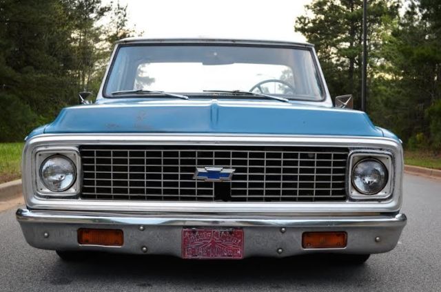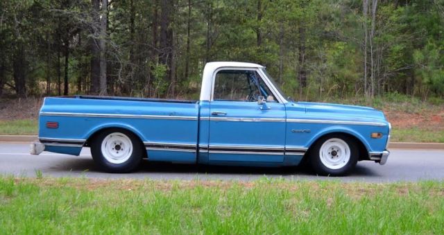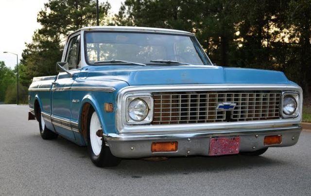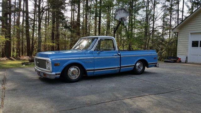 Up for auction is this slammed (the right way!) 1972 C10 custom short bed fleetside pickup with the original A1 title. This truck gets TONS of attention!! Unlike most bagged trucks that look cool laid out until they have to be picked up to be driveable, this is the truck's actual ride height. It rides great and looks cool all the time not just when it's parked. There are no air leaks to leave you stranded with no way to drive. Trust me, I've been there, done that and it sucks. The 6/8 static drop was achieved by using drop spindles, drop springs, monster C-notch, and relocated shocks on all 4 corners for a smooth ride. This means it rides this low with plenty of suspension clearance for a great ride and looks killer coming down the road. Being a '72, of course it is 5 lug disc brakes, has power steering, and SBC 350 V8 power with HEI ignition and flowmaster exhaust. The truck has a 350 turbo hydromatic transmission that shifts smooth and goes in and out of gear well. It hits the road great and is a real pleasure to drive. I would get in it and go anywhere. All of the lights and signals are in working order. The body is Chevrolet medium blue with double moldings and a white top. It has some minor dings and scratches that only add character to it's killer patina. Although there is some minor rust in places, the important pieces like the cab corners, rockers, and floor have all been properly repaired to make this a solid daily driver/ shop truck. In one of the pics it shows the full caps on the wheels which comes with the sell, however, I prefer to run it without them. Overall, this is an extremely cool, good looking, reliable truck that is a pleasure to drive and own. Unlike the $50k trailer queens, you won't be scared to get in this truck and actually drive it! If you have been looking for a great daily driver or shop truck don't miss your chance, you won't be disappointed. As you can see in my feedback, I have sold many high ticket items both here and internationally with repeat customers (references upon request). However, please do not wait until the last minute to bid as most of my auctions end early due to a buy it now or a deal being struck before the auction closes. Message me or call me if you have any questions, Jeremy 864-940-4576. Thanks and good luck! Note: This truck is also for sale locally and I reserve the right to end this auction at any time. This truck has a non-refundable $500 deposit so PLEASE SERIOUS BIDDERS ONLY!!