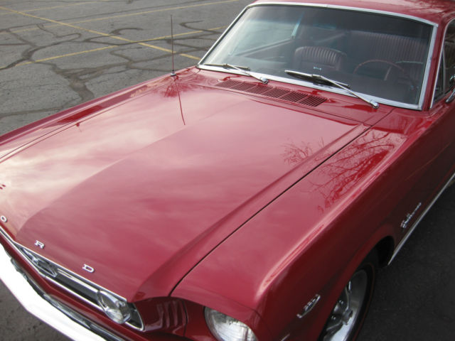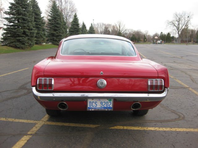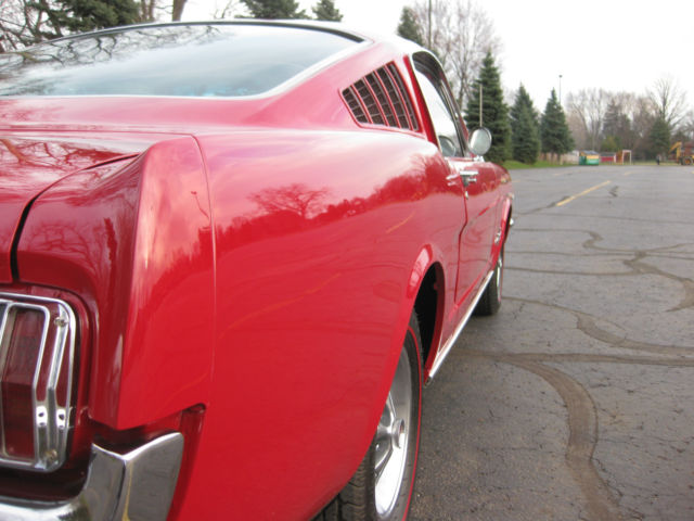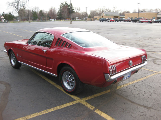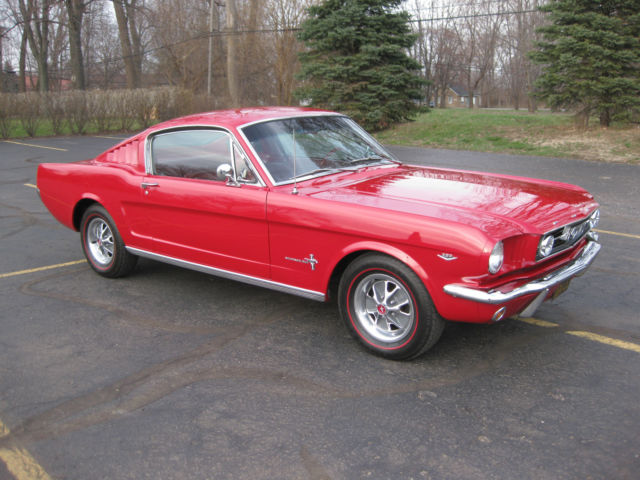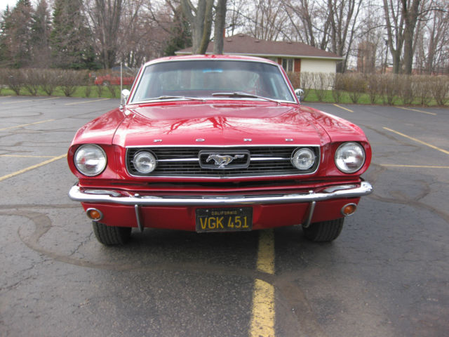1966 Mustang 2+2 Fastback with GT options. I am the 4th owner. A-Code 289 V-8, 4 speed top loader manual transmission. Manual steering, manual front disk brakes. The odometer reads 36,190 miles, actual mileage is unknown. Restoration completed 6 years ago. Painted in the original Candyapple Red color code "T", the body and paint is in excellent shape. Car was originally delivered to a dealer in California, was brought to Michigan in 1979. The front license plate on the car is still the original California black plate. Red interior, newer carpet, has the pony interior, original seats recovered, new door skins and hardware, new reproduction factory floor mats, new headliner, and original factory Rally Pak (tach works but the clock does not). Folding rear seat and hazard light switch in glove box. All gauges and switches work as they should. The interior is in excellent shape. This car has all the options offered on a GT except the white stripe on the lower door and fender and also the GT fender emblem. GT gas cap, dual exhaust through the rear valance, GT fog lamps, front disk brakes and heavy duty suspension. New shocks, new radiator, new alternator, new battery, new McLeod Racing clutch, all fluids changed, new Edelbrock 289 performer intake, new 600 cfm 4 barrel carburetor with electric choke, new Pertronix electronic ignition, distributor and coil, Chrome dress up kit, valve covers, air cleaner and breather. New factory repo heavy duty radiator, hoses and clamps. New BFG Redline 14 inch tires on original factory pony style wheels and matching center caps. New period looking Am/FM radio with MP3 input. Everything works as it should. This is a really nice clean fastback. Drives excellent. The underneath is as clean as the topside. Go to the URL below to view video: http://youtu.be/gzw0pzaR2PA Please feel free to send me a message if you have any questions. Data Plate Info: Year: 6 - 1966 Plant: F - Dearborn, MI Body Series: 09 - 2+2 Fastback Engine: A - 289 4v V8 Unit: 283170 - 283170 Body: 63A - 2+2 Fastback, Standard Interior Color: T - Candyapple Red Trim: 25 - Red Crinkle Vinyl and Red Rosette Vinyl, Standard Interior Date: 11C - March 11, 1966 D.S.O: 71 - Los Angeles Axle: 1 - 3.00:1, Conventional Trans: 5 - 4-Speed Manual This car is being sold as is condition, no warranty. A deposit of $1,000 is due within 48 hours of Auction close. It is the buyerâs responsibility to arrange and pay for shipping. Sales in the United States only. No trades, all sales are final. If I do find a buyer locally, I reserve the right to cancel the auction at anytime.