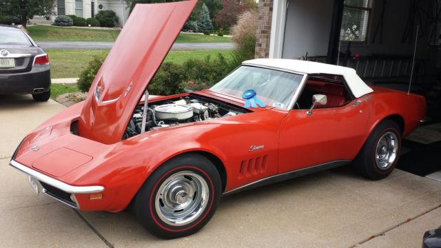 N2 Cars LLC is Happy to bring to Market a very special 1969 Corvette Convertible Red Red 427- 390hp M21 4sp, 370 posi, PS, White top, tinted glass, AM/FM Radio, White stripe tires Currently Red Lines. This is a Complete Body on Restoration Looks Like a Body Off other than the Original Exterior including original Mostly original paint with lots of patina. If you like numbers and date Codes you will Love this Car not only do they Match they are all original to the car. Motor,Trans, Rear end, Shocks,Carburetor, Starter, Alternator. I can go on and on Of Course a no hit Body and very nice Frame and Birdcage. Just Received a Chapter Top Flight Award in October 2014. I personally Dropped the original Tank during Restoration and Tank Sticker (AKA) Build Sheet is still on the Tank and very Legible This is a Opportunity to own one of the Best 69 Big Block Corvette Convertibles around This car was Delivered new to Gene Cable Chevrolet in Independence, MO. Serious Buyers Please Call Denny (314)458-8019 .For a Knowledgeable Description. Car Sold AS IS No Warranty.