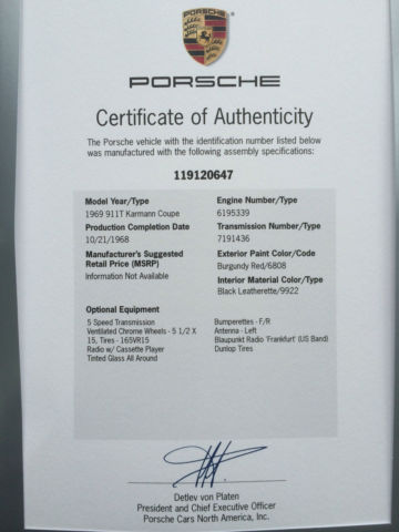 Up for sale is a beautifully restored 1969 Porsche 911t. A full restoration was just completed on this fine car. All original, minimal rust, numbers matching, COA. The car has been completed in show quality condition and presents remarkably well. The car was totally stripped down, everything was removed, the body was sanded down to bare metal and then prepared and repainted. Everything was removed to be refurbished or replaced with new OEM parts. The car has matching numbers. Minor rust was on the suspension pan. It was professionally removed and patched with a factory replacement piece. Vin: 119120647 Eng: 6195339 Trans: 7191436 paint:6808 mil: 0 (62932 prior to restoration) EXTERIOR- The car was painted back to its original color, Burgundy code (6808) with an excellent paint finish. All chrome pieces were removed and re-chromed. All trims and seals were replaced. New horns and grills, new headlights, tail lights and turn signal lights were all refurbished with new lens. The original fuch wheels were re-chromed and dressed with new tires. INTERIOR- The interior was completely redone in Black Leather code (9922). New leather on seats, new door panels, dash are period correct. A new headliner and new carpets were installed. Brake pedal cluster was rebuilt with new brass bushings and repainted. New shifter bushing. All gauges were removed, checked, cleaned and repainted. Even the clock works. All in excellent restored condition. Original steering wheel, also refurbished. ENGINE and SUSPENSION- Each and every bolt and nut for the engine and suspension was taken out and cab plated or zinc plated. All brake lines were replaced. Each and every part that was removed has been powder coated, such as hood hinges, deck lid hinges, A arms, spring plate, the complete suspension and all engine sheet metal pieces. Even the air cleaners were powder coated in glass shine finish. The engine was rebuilt with all new gasket sets, new main bearings, new rod bearings. Valve job and new clutch disc, pressure plate throw out bearing, and rebuilt original carburetors and air cleaners were installed. The transmission is a 5 speed. It was open cleaned and checked. It shifts smoothly through all gears like it should. The front and rear suspensions were rebuilt with all new bushing , new shocks, front and rear, new brakes all around, new brake lines and hoses, new tires, front and rear. This a fun car, and it runs and drives extremely well. The car is in pristine condition and very clean, also very solid. The undercarriage is extremely clean and solid too. Pictures don't give this car its glory but seeing it in person will. The car is now available for viewing by appointment only. You will be hard pressed to find a better example. $1,000 non-refundable deposit is required within 24 hours of winning bid. Bank wire or cash. I can assist with overseas shipping and local US shipping. Please do not bid or ask questions unless you are a serious buyer.