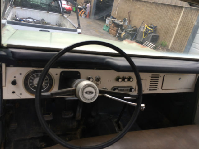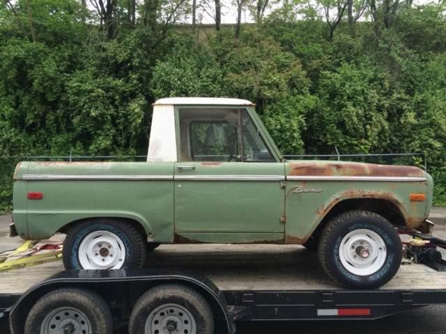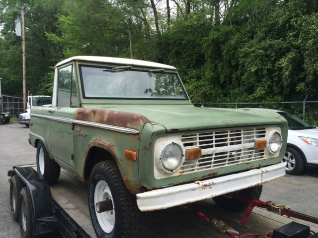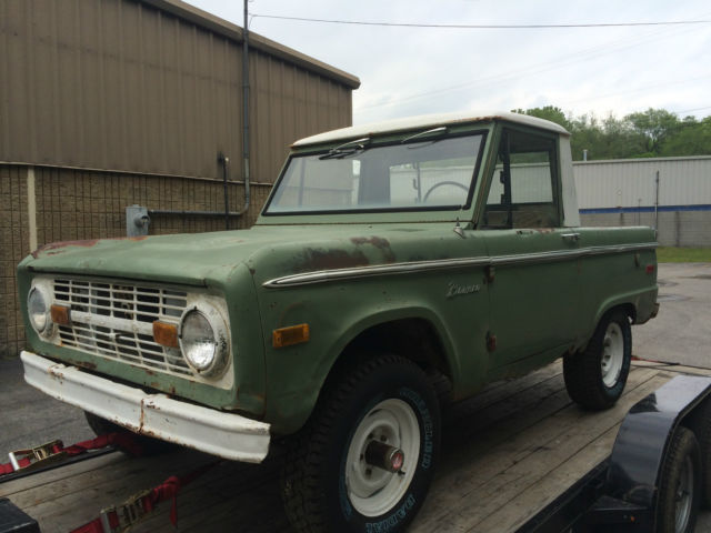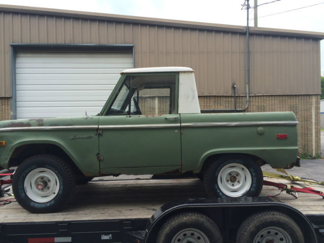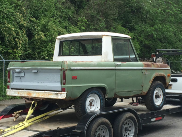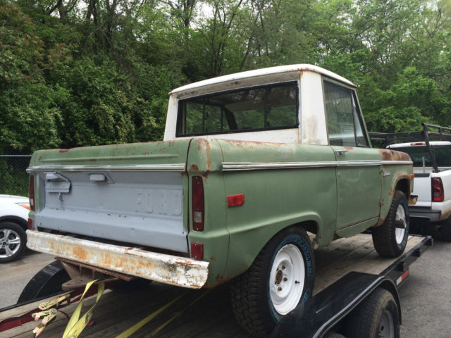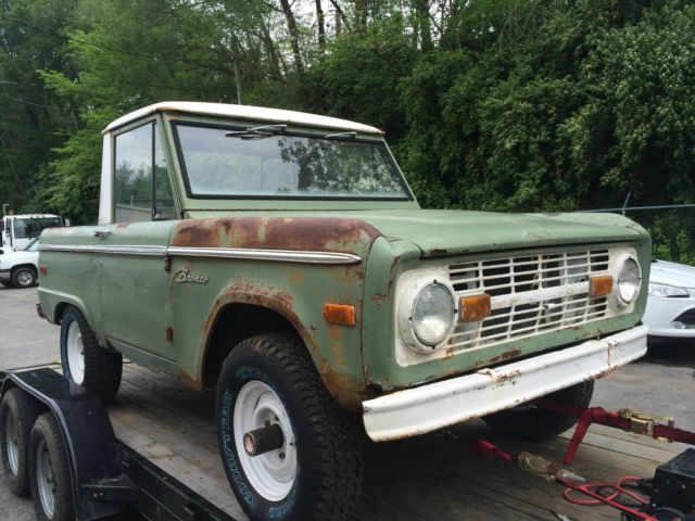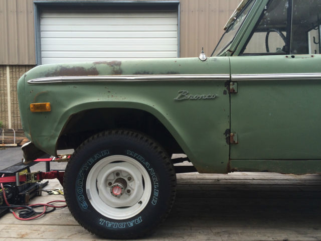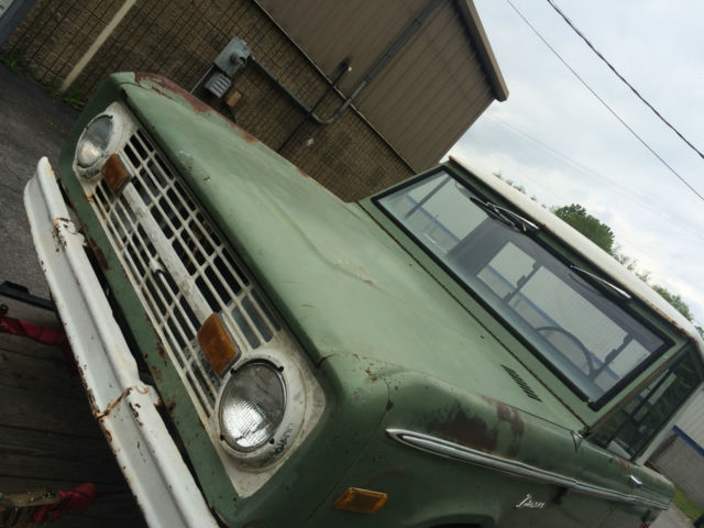 Available is a 1971 Ford Bronco half cab in Boxwood Green. This was a 1 owner vehicle until last year. It has been in the state of Tennessee since 1971. I have a copy of the original title, owners manual, owners card with extra vin trim tag, and some other old documents from the 70's. It is a base model but has the beltline trim. The engine runs good, the clutch is good. The brakes need bleeding and/or adjusting if being used as a daily driver. All glass is good. Both doors close tightly with no sagging. The door posts are solid, and both windows roll up and down properly. It has a factory bench seat (rare) that needs recovering. It has a new set of Goodyear tires with no miles. The frame only has surface rust, no scale or pitting. The rear bed area is clean too. It will need rockers and front floors for sure. Or leave as is and show off the extra patina! Most of the paint is original. The dash is uncut and it still retains it's AM radio. This is a great entry level driver Bronco, or a solid foundation for a full restoration. I tried to price this Bronco fairly, there's not many left out there under $10,000.00. I reserve the right to end this auction at any time because it is also for sale locally. A $500.00 non refundable deposit is due at the end of the auction, balance paid by wire transfer. Vehicle is sold as is with no warranty, and with clear title. Please ask all questions before you bid, and also get your wife's permission if she wears the pants. Thanks!!