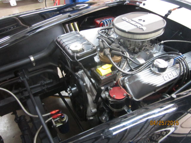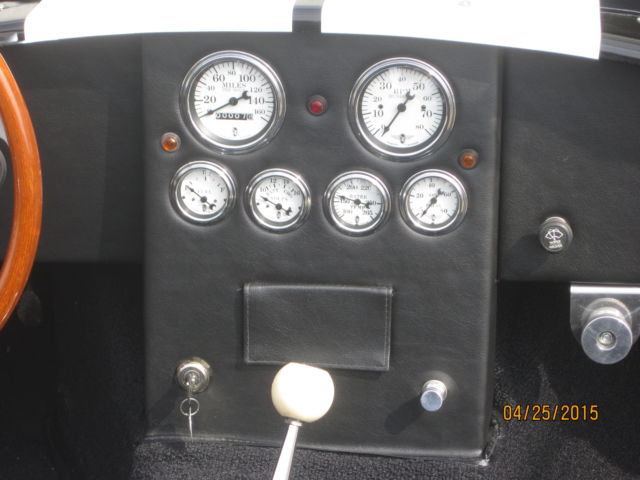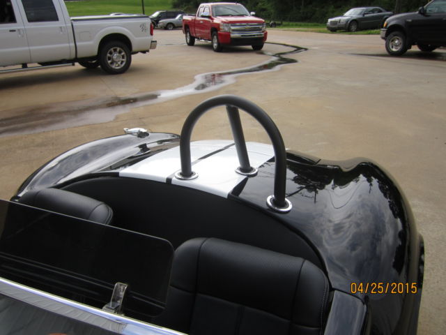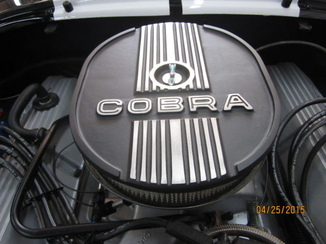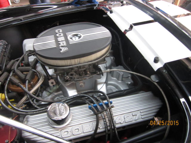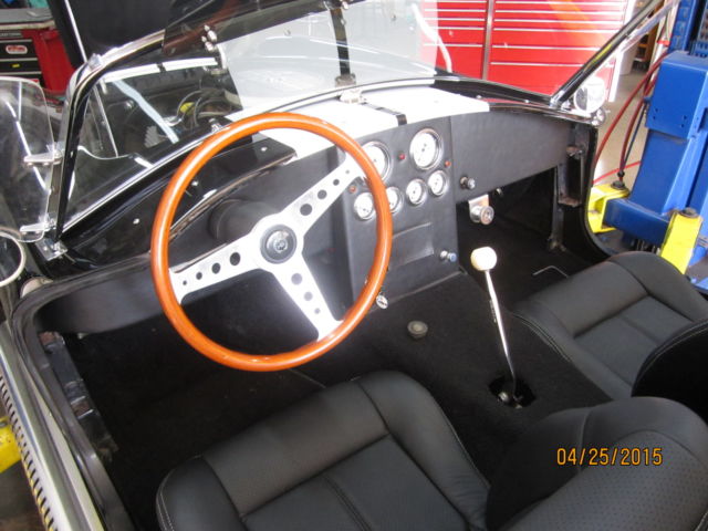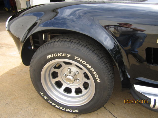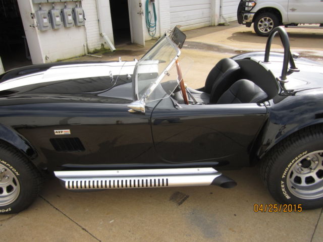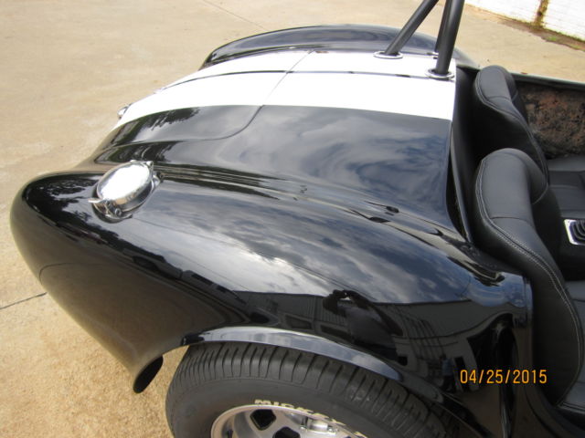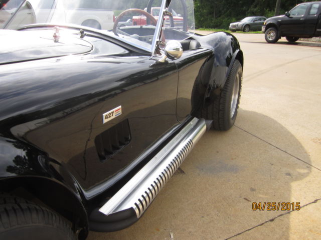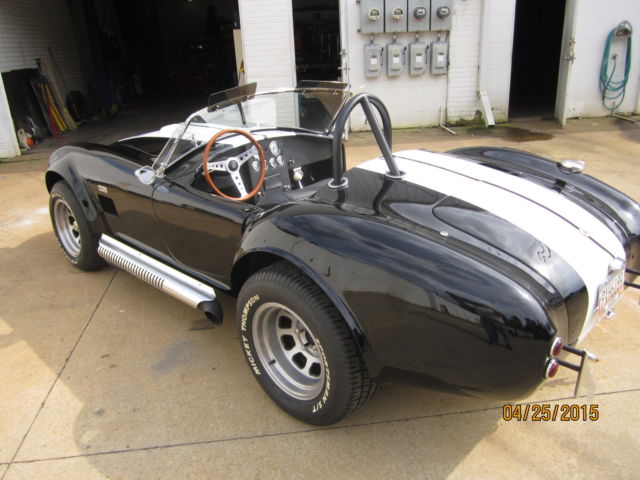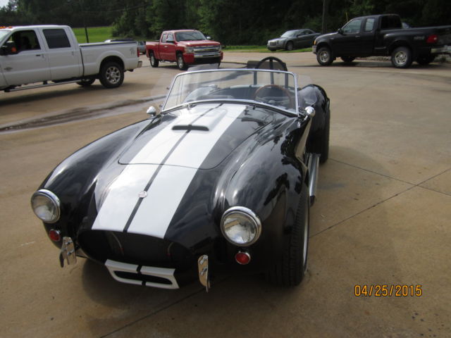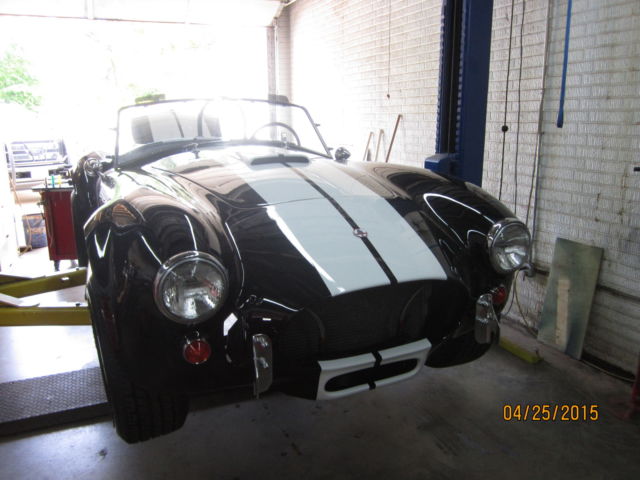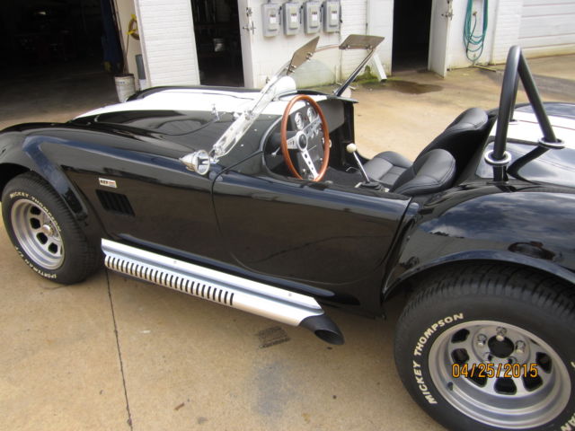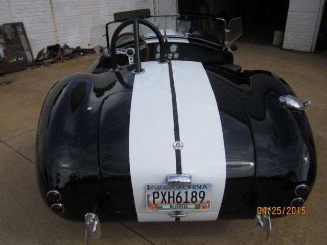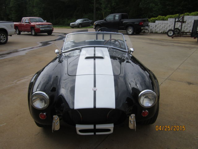 Beautiful Tuxedo Black Paint with white racing stripes Shelby Cobra Roadster. This car is "Turn Key" and ready to hit the road.This body kit was purchased from Unique Motor Cars in Gadsden, AL. Unique Motorcars is one of the oldest replica kit car manufacturing companies in the United States. This car is #9225. This car is powered by a fresh 428 Cobra Jet Engine with a Borg Warner Super T10 4 speed transmission behind it. The NASCAR style Ford 9" rear end puts the power to the ground. This car is immaculate from top to bottom, inside and underneath. This car is registered as a 1965 Shelby Cobra Replica/kit car. CHASSIS: Square tube frame rails made from "High Strength Steel". It has a welded kick-up to support a solid (non-IRS) rear axle. FRONT SUSPENSION: The front suspension is a coil-over design with Irvine Brothers tubular upper A-arms. Front shocks are adjustable Carrera's. Included front sway bar, REAR SUSPENSION: 9 inch Ford NASCAR style rear end with full floating 31 spline axles. 3:55 gear ratio with Track lock limited slip differential. Adjustable Panhard bar for stability. BRAKES: Front Disc Brakes. Rears are Bruning Calipers with vented Discs. Dual master cylinders with adjustable brake bias. Electric line lock to rear brakes to set emergency brake. ENGINE: Fresh rebuilt 428 Cobra Jet engine. Professionally built by Benning Auto Parts & Machine in Columbus, GA. Eagle Rotating assembly bored .030 oversize. Steel crankshaft with "H" beam rods. Compression ratio of 9:5 to 1. Completely balanced assembly. Fresh heads with valve job and valve springs to match Comp Cam. Camshaft is Comp #33-230-4. .530 lift intake & exhaust. remote oil filter with stainless steel lines. Accel distributor, coil and wires. Holley 850 CFM carb with pressure gauge installed. Side pipe headers and exhaust pipes. CLUTCH & TRANSMISSION: Lakewood scatter shield/bellhousing. Hydraulic clutch release with Centerforce Clutch. Borg Warner Super T-10 4 speed transmission with large diameter output shaft. WHEELS & TIRES: Aluminum wheels are 5 bolt, "Grand National V-Slot Style". Fronts are 8" wide with P235/60R15 tires. Rears are 10" wide with P295/50R15 tires. INTERIOR: Black leather covered bucket seats. 4 point vintage style seat belts with shoulder and lap harness. Woodgrain steering wheel. Modern style Stewart Warner gauges. Black carpet and door panels. Dimmer switch mounted on transmission tunnel. Emergency brake line lock located on drivers floor. Brake bias control knob located on dash. BODY: The body, windshiels, windshield frame, windshield visors and other assorted accessories were sourced from Unique Motorcars in 1992. Body # is 9225. Date of manufacture is 03/1994. The body is hand laid laminated fiberglass and epoxy with dropped floor pan and extended footbox area. It has black paint with double round tail lamps, Body preparation, paint abd finish are excellent. Door hinges are tight with no sag. Door latch alignment is good. Gas tank is welded aluminum. QUESTIONS: You can message me thru E-Bay or my Cell # is 706-681-2352 between hours of 7:30 am to 10:00 pm. Eastern Time Zone