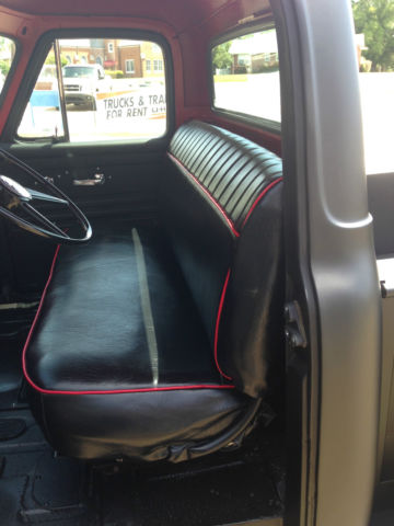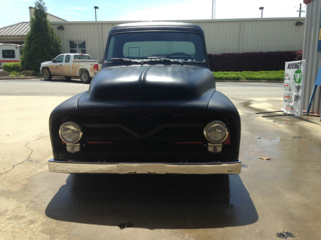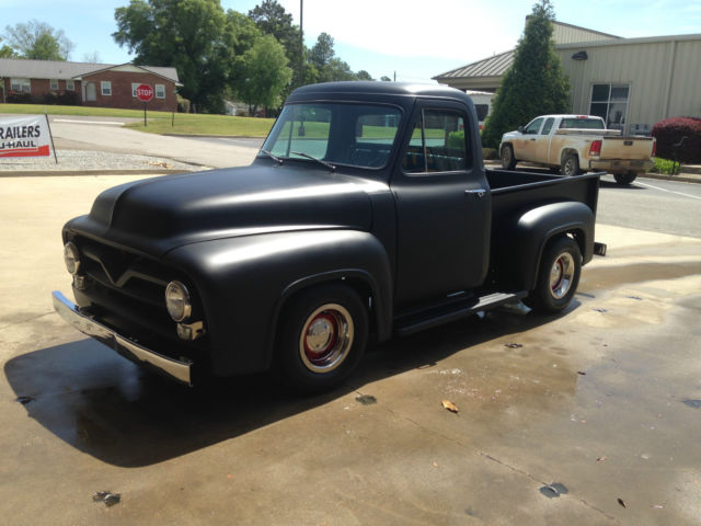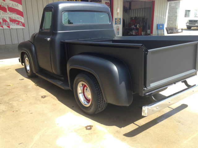 THIS IS A 1955 FORD F100 . IT HAS A 302 ENGINE THAT IS NEW WITH A EDELBROCK CARBERATOR. IT HAS A REBUILT TRANS THAT IS A C6 AUTOMATIC. FRAME AND INTERRIOR IS SPRAYED WITH LINE-X AS WELL AS BED AND BOTTOM OF TRUCK. ALL GLASS IS NEW. THIS IS A FRAME OFF BUILD. IT HAS DRUM BRAKES ALL REDONE. TRUCK IS LOWERED. THE SPEEDO AND WIPERS DO NOT WORK. NOT HOOKED UP. THE SEAT IS ORIGINAL RECOVERED. TIRES ARE NEW HANKOOK 15 AND WHEELS ARE ALSO NEW.GAS TANK IS IN REAR OF TRUCK AND IS ACCESSIBLE THROUGH BED. IT HAS HIDDEN LATCHES FOR TAILGATE. ALL RUST WAS REMOVED WITH NEW PANELS PUT BACK. TRUCK IS VERY STRAIGHT AND PAINT IS NICE FLAT BLACK MADE BY PPG - HOT ROD BLACK IS THE COLOR. YOU CANNOT START TO BUILD A TRUCK LIKE THIS FOR LESS THAN 25K.THE IGNITION IS ELECTRONIC WITH A MSD 6-AL BOX. ALL WIRING IS NEW ALSO.IT HAS LED TAIL LIGHTS BELOW TAIL GATE. ALL HEAD LIGHTS AND TURN SIGNALS WORK. THIS IS A FRAME OFF REBUILD. ALL CHROME IS NEW TRIPLE PLATED. STEERING WHEEL IS OEM REPLACMENT NEW. IF YOU WANT I DO HAVE WIPER MOTOR TO GO ON TRUCK BUT I NEVER INTENDED ON DRIVING IN RAIN. IF ANY QUESTIONS CALL ME AT 205-689-1264 (SHOP) OR 205-391-7654 (CELL) MY NAME IS JOE THANKS AND GOD BLESS