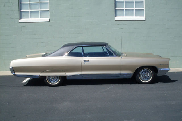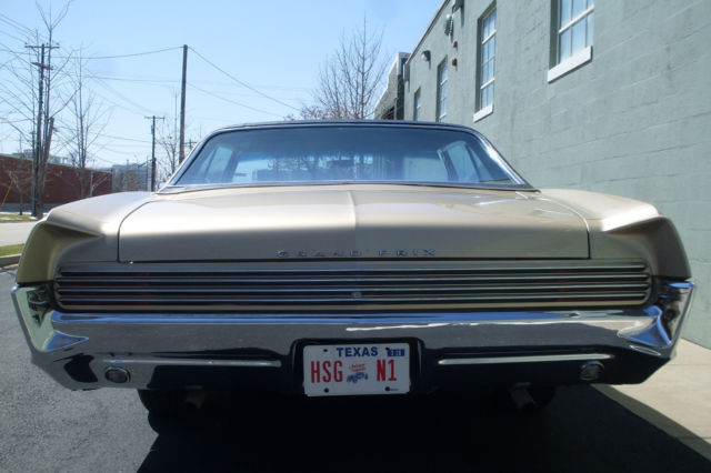1966 PONTIAC GRAND PRIX CHAMPAGNE GOLD WITH BLACK TOP AND INTERIOR SHOWS TO BE 18,608 ORIGINAL MILES EQUIPPED WITH: 389 CI V8 4 BARREL CARB DUAL EXHAUST TURBO HYDRA-MATIC TRANSMISSION FULL BENCH SEAT WITH ARMREST CUSTOM AIR CONDITIONING POWER STEERING AND BRAKES SOFT RAY GLASS CUSTOM SEAT BELTS AM PUSHBUTTON RADIO REAR SEAT SPEAKER NONGLARE INSIDE MIRROR VINYL TOP WHITE WALL TIRES FULL HUBCAPS ORIGINAL TITLE AND BILL OF SALE ORIGINAL OWNER'S GUIDE AND PROTECT-O-PLATE EXTERIOR: BEAUTIFUL REPAINT OF ORIGINAL COLOR ALL BODY LINES ARE SUPER STRAIGHT VINYL TOP IS PERFECT NO RUST ANYWHERE CHROME AND GLASS ARE EXCELLENT INTERIOR: ORIGINAL SEATS ARE FLAWLESS DOOR PANELS LOOK NEW DASH IS PERFECT HEADLINER IS SPOTLESS- SMALL TEAR CARPET IS MINT TRUNK IS CLEAN MECHANICAL: DRIVES BEAUTIFULLY TRANSMISSION IS SOLID BRAKES ARE STRONG MOTOR SOUNDS GOOD FAN SWITCH FOR HEAT AND AC IS INOP HORN AND RADIO ARE INOP ENGINE BAY IS FACTORY DETAILED A WIDE TRACK EXPERIENCE YOU'RE SURE TO ENJOY COMES WITH ORIGINAL HISTORY SINCE NEW PRICED TO SELL ANY QUESTIONS? PLEASE CALL DAVID WAYNE AT (214) 926-5621 THIS CAR IS FOR SALE LOCALLY. WE RESERVE THE RIGHT TO TERMINATE THIS AUCTION. The seller shall not be responsible for the correct description, authenticity, genuineness, or defects herein, and makes no warranty in connection therewith. No allowance or set aside will be made on account of any incorrectness, imperfection, effect or damage. It is the responsibility of the buyer to have thoroughly inspected the vehicle and to have satisfied himself or herself as to the condition and value and to bid based upon that judgment solely. The seller shall and will make every reasonable effort to disclose any known defects associated with this vehicle at the buyerâs request prior to the close of the sale. Seller assumes no responsibility for any repairs regardless of any oral statements about the vehicle. We require buyer to pay $1000.00 NONREFUNDABLE deposit only with PayPal at end of auction. DAVID WAYNE ENTERPRISES LLC SOLD AS IS- NO WARRANTY