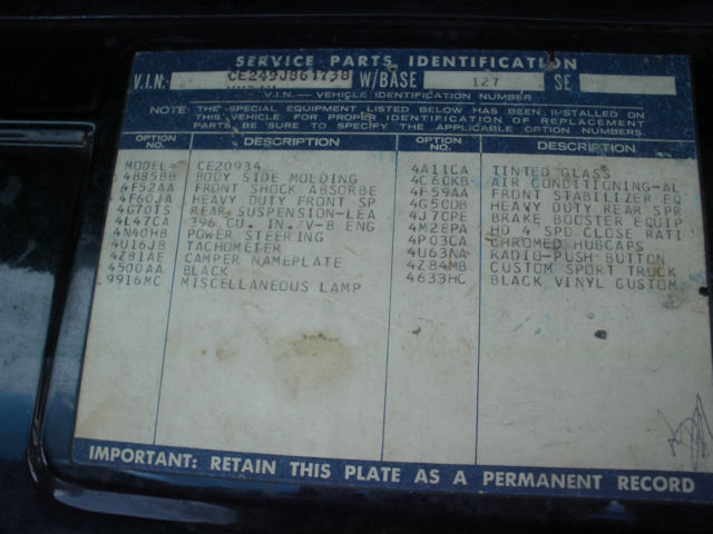This is very rare Pickup in original condition, 3 owner truck that has always been garaged kept, a true survivor. This truck has the 325 HP 396 Big Block, with the 4 speed transmission, with factory air, power steering, am-fm radio and all the owner books, with only 88,651 miles .The truck is in Super Great Condition for a 48 year old. .Truck runs out great with lots of power from the 396 engine. tire are new and interior is all original, that show very little wear. This truck has always been in Colorado and shows very little rust. Look at the pictures and judge for yourself. We are a Colorado dealership selling the Truck on consignment and all information is from the present owner. he has purchased another classic and need to make room and doesn't want to leave it outside .We are Colorado Dealership if sold in Colorado we must collect Sales tax. We require at the end of the auction that a deposit of $500.00 be paid thru Pay Pal and that the remainder be paid by certified funds or wire transfer within 7 days. Transportation is the sole responsibility of the buyer and the truck will not be released until paid in full. Vehicle is Sold As Is, Where Is. Any questions will be answered by email as soon as possible, The truck is for sale at the dealership and reserve the right to end this auction at any time, up until the reserve price is meet. Good Luck, and Thanks for Looking
