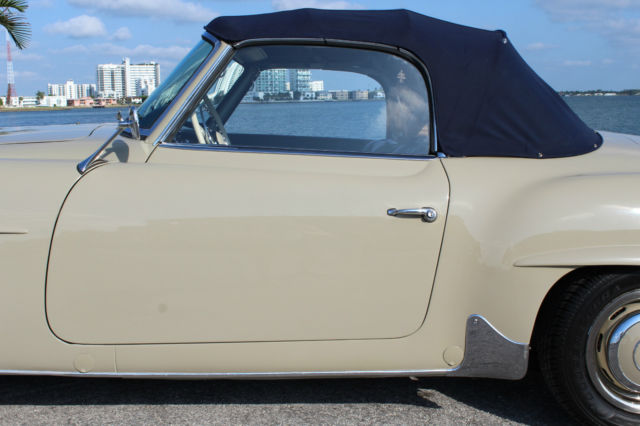 A Breathtaking example of a 1960 Mercedes-Benz 190SL with only 46510 actual documented miles. Beautifully finished in rare Mercedes Beige Gray (Beigegrau) DB181 with a contrasting blue soft top over blue leather 300SL Gullwing seats with matching kinder seat and beige Wilton wool carpeting. This 190SL has just received a full mechanical sorting and runs and drives as good as it looks. The original 1.9 liter 4 cylinder engine runs super smooth, accelerates quickly and the 4-speed manual transmission shifts flawlessly through all gears. The is no burning or leaking of oil. All instrument gauges are also working properly including all headlights, taillights and turn signals and original Blaupunkt radio. The body is very straight and rust free. The paint is in Excellent show quality condition with a deep mirror like shine with no scratches, dings or dents present. The chrome is also in excellent condition. The blue convertible soft top also shows nicely with no tears or visible wear marks. The interior is as nice as the exterior showing virtually no wear on the leather seats, door panels, sunvisors. dash and Wilton wool carpeting. Please call me with any questions you may have or for more photos of this investment quality 1960 190SL. Scott ~ 305-804-9550