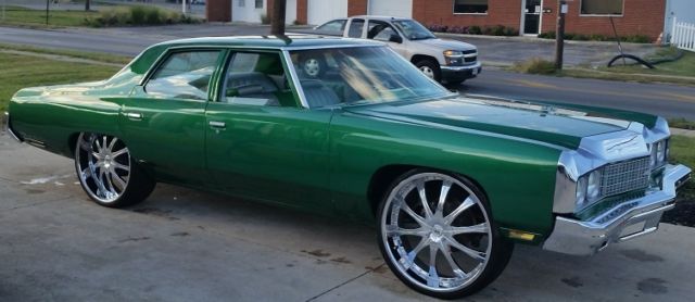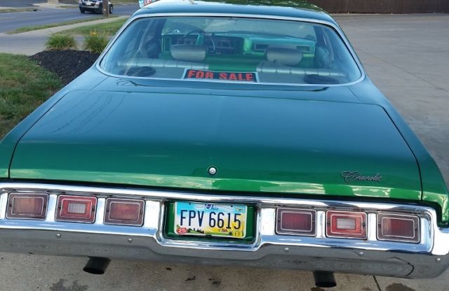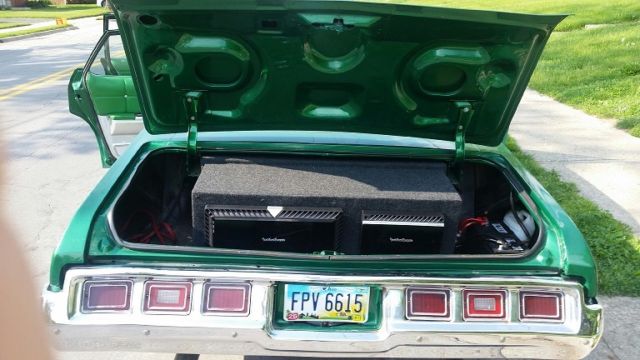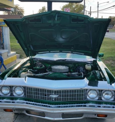 I am selling my 73 Chevy Impala, 98k miles, 4 door, runs great, you could drive it down to Florida and back. New brakes, new fuel send and lines, had a tune up last summer and hasn't put on many miles since, car is garage kept and an antique car mechanic shop has done all the upgrades in Columbus, OH. ** candy green, 350 engine w upgrades, 26 inch Lexani rims and tires with only 3-4k miles on it, custom gray and green leather, custom green dash, duel exhaust rumbles, interior all redone, bench seats are very comfortable ** 7 inch in dash cd/dvd player, Kicker speaker bar in front, custom Rockford Fosgate system, 2 amps and 2 15" woofers in trunk (box sealed off from trunk) will shake the neighborhood and trunk does NOT rattle. Car runs great, absolutely NO mechanical issues at all, serious buyers ONLY, this car gets tons of attention from all ages! car is in Columbus,OH call/text Chris @ 614-570-9755 The car was appraised recently from Arena Motor Sales in Columbus, for $15,000. Time to sell, I have 3 kids and a mortgage, priced to move at $10,500 you will love this car! Had to relist... did auction wrong!