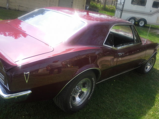 1967 Firebird , I have owned this car for the last 15 years, Every nut and bolt has been removed and cleaned or replaced. Its has it own distinction , That Reflects my own taste. Like 1968 signal lights. I like them better than the 1967  ones. It has many factory features and options. Front disk brakes, Power Windows , Tilt Wheel , Rear Defroster , Rear Fold down Seat ,  Some options I added where factory Pontiac Clock and Gauges . A 1965 Pontiac fresh rebuilt 421 Tri Power with less than 500 miles on it. Edlebrock  66 Style Aluminum Intake with rebuilt done this year. Back by a Muncey 4 speed. 10 Bolt Posi Rear end. The car has a real nice Body and Paint . No rust very solid. There is small blemishes and chips in the Paint. Barely noticeable. This is unique and real head turner and should appreciate with age. I'm starting the bid at 25,000.00 US . I have car listed locally at 30,000.00 and will end the auction early if sold locally. So bid early and I will honor your bid to the end of auction . 2000.00 down within 48 hours balance within 7 Days upon pickup . Good luck and enjoy