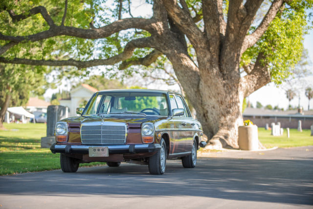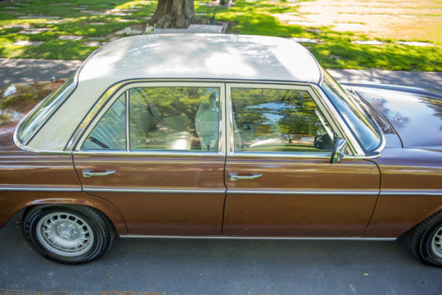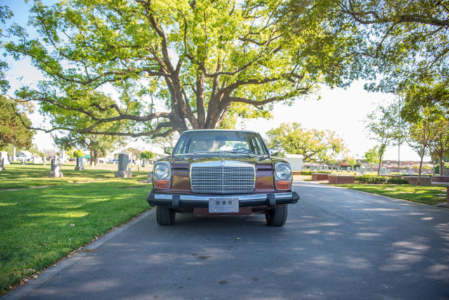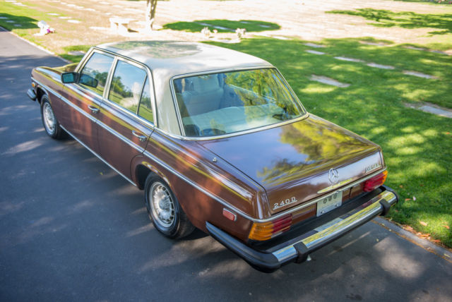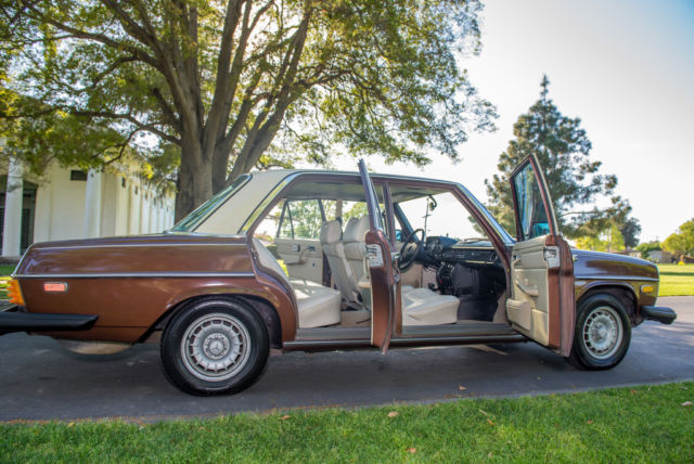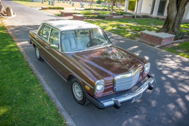 This Mercedes is definitely one of the most unique and rare cars in its class. Finished in Milan Brown Metallic with a Light Ivory top and furnished with an unblemished Cream interior this car is extremely rare and the last year of the w115 240D. Car has a tasteful era correct double cream hand painted pinstripe that beautifully compliments the interior and top. Engine and Transmission are in great shape. Engine runs strong and steady, no unusual sounds or knocks, only the iconic idling Mercedes diesel sound. Transmission shifts properly and fluently through ever gear with good timing. This car is equipped with a pull-start ignition, that functions just as it should, starting perfectly even on cold start, which is an indication of a strong engine. Engine Compartment is exceptionally clean and dry. This 240D drives and handles very well, no steering slack, and grips the road through every turn. The paint is in great condition. There is a deep luster and shine to every panel, no oxidation or fading. There are a few blemishes in the paint, but nothing truly noteworthy considering the age and condition of the car. The chrome and aluminum on this car is exquisite. There is no pitting, fading, oxidation, or scratches on any of the chrome. All of the aluminum metal trim along the window sills still has its original sheen, not faded or oxidized like a lot of classic Mercedes are prone to being. The bumpers and rubber seals are still jet black, with minimal cracks or fading. The boot of the car is very clean and has the original mat, and a fresh spare. Headlight casings are in phenomenal shape, no cracks, and still have a vibrant orange color that would be expected of a garage kept car. All optional power windows function perfectly. All the glass on the car is perfect, not a single chip or crack on any pane. Interior may be the best aspect of this car. Seats are like new, no tears or rips. Padding and springs is still very firm, so it does not feel as if you are falling into the seat. Headliner has good coloration and is taught. Speaker system is perfect, no static, distortion etc. A/C currently doesn't work, but blower and compressor do. I will ship the car anywhere in the US for free. Clean Autocheck, Clean Title. This car has never been an an accident. Please, only serious buyers. For all inquiries please contact 949-531-8070