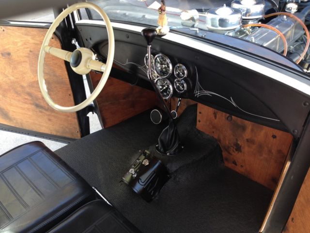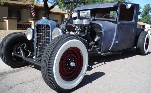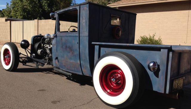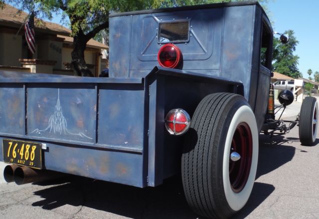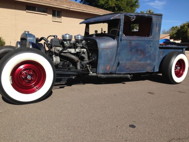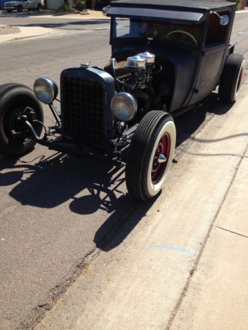 For sale - 1929 Ford rat rod styled truck. A great cruiser that draws a lot of attention where ever you drive. Has a rat rod look, however it is built on a commercially manufactured square tube frame with new suspension components. Front end is a speedway dropped tube axle with a traverse leaf spring, friction shocks, and disc brakes, rear suspension has coil over shocks and drum brakes. Power comes from a 292 chevy straight six, turbo 350 transmission, and s10 rear end. HEI ignition system, dual two barrel carburetors w/electric choke, Offy intake manifold, dual cast iron exhaust headers, fuel pump, and water pump where new when truck was built. Driven about 1300 miles since built about 3 years ago. The truck starts up easy, runs great and doesn't smoke; like a lot of six cylinder engines. The original steel cab is in decent shape, doors have had lower panels replaced and new rear cab corners were put in. Cab has been chopped 4 inches and channeled 3 inches, all wood frame work has been replaced with steel and has a full steel floor. Roof is wood covered in canvas. Doors have custom bear claw latches operated via push down release in top sill, doors do not currently have window glass installed. Interior is heat insulated and covered with wood panels and rubber floor matting. Stewart Warner gauges are all electric sender type, speedo, tach, volt, fuel, oil pressure, and temperature, all are lit wings style gauges. Automatic 350 trans is shift by a tall style Lokar shifter. The headlights have halogen conversion, tail lights are led and rear "STOP" light all work. Has a commercial hot rod wiring harness with blade fuses. The bed was custom fabbed to fit trucks dimensions. Under the wood bed is the fuel tank which is filled through a trap door in the bed. Bias ply tires are true wide white wall (not porta walls). This hot rod is a blast to drive and cruise to driven shows, take out Saturday nights, etc. Please note - This is a hot rod and does have any warranty or guarantees of any kind. Truck can be driven easily by me at 5' 11" and is not cramped, but not what you would consider spacious. Has a clean AZ state title, titled as 1929 Ford A A, vin# is stamped on front frame rail. If sold to an AZ resident 1929 plate can be transferred and go with purchase.