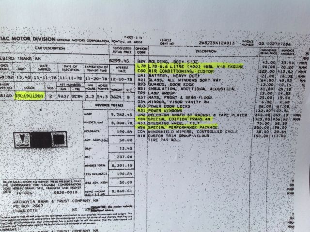 Only 1,107 ever produced, stored indoors since 1992, (See inspection sticker photo) The mileage is verified by a 1992 Inspection Verification issued by the State Police, found under the front seat of the car, showing 17,000 miles in 1992. The same year as the last inspection sticker still on the car and when the car went into storage. (See photo) Special Edition Y84Factory 6.6 liter Pontiac 400Factory 4 speedFactory T - TopsFactory WS6 performance Suspension PHS Documented (see photos)100% Original Numbers Matching Engine, Trans and Rear100% Original Black paint (19L 19U)100% Original Black Interior (19B1)17,000 Original miles (Verified, See Photo)Power windowsAir Conditioning Rust free North Carolina car, solid floors, frame and trunkRuns and Drives WellInterior is in very good conditionThe car was not detailed or cleaned, so you can see the car in its original condition.The paint and interior will clean up well.This cars does not need to be restored or painted, could be shown and driven as a survivor.The body is strait.Vehicle is available for inspection during the auction.Being sold As is Where is Without any Warranty.I reserve the right to end the auction early.Email questions or to request my phone number to discuss details over the phone. Thanks NOTE: Ebay Username goyankees2011 was the previous high bidder. This ebay member never made a deposit or contacted me after the auction was over. Beware of this ebay member. goyankees2011 will be banned from all future auctions.